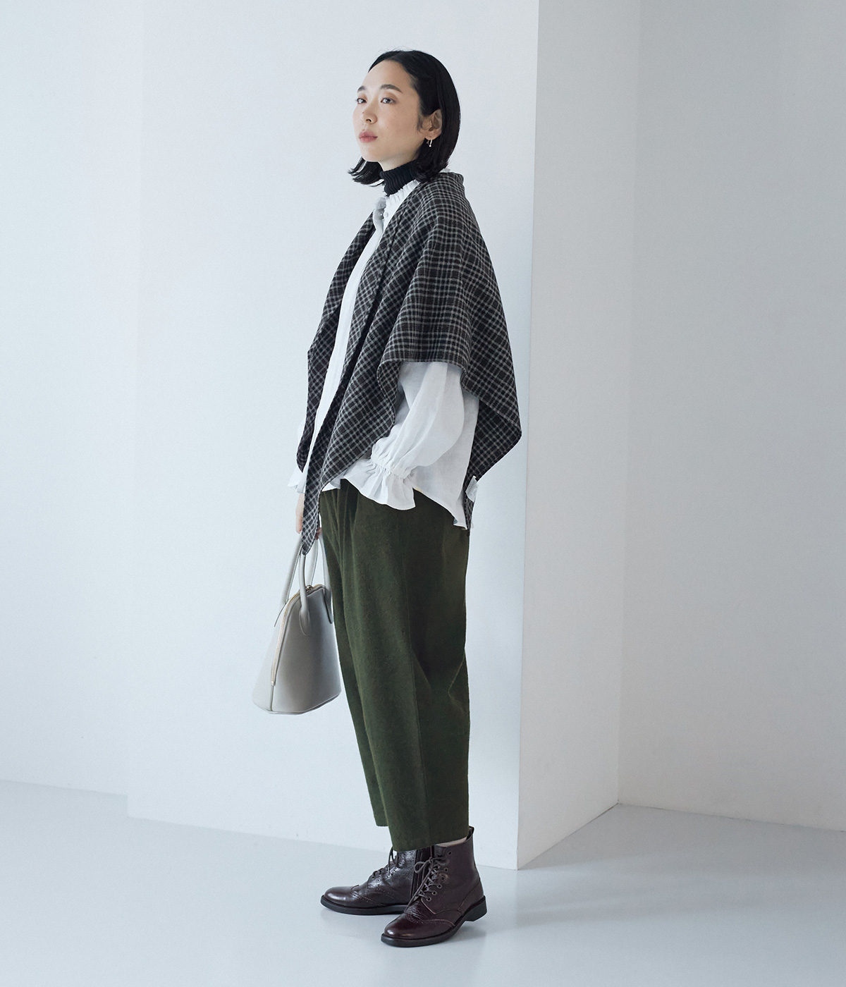 暗めのトーンがシックなグリーンは、白いブラウスを合わせてトラッドな雰囲気漂うお出かけスタイル。