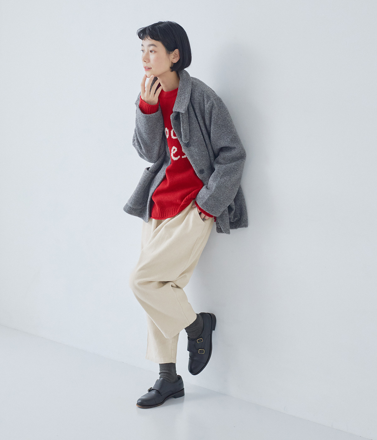 コットンリネン起毛ボリューム袖ワンピースの着用コーディネート