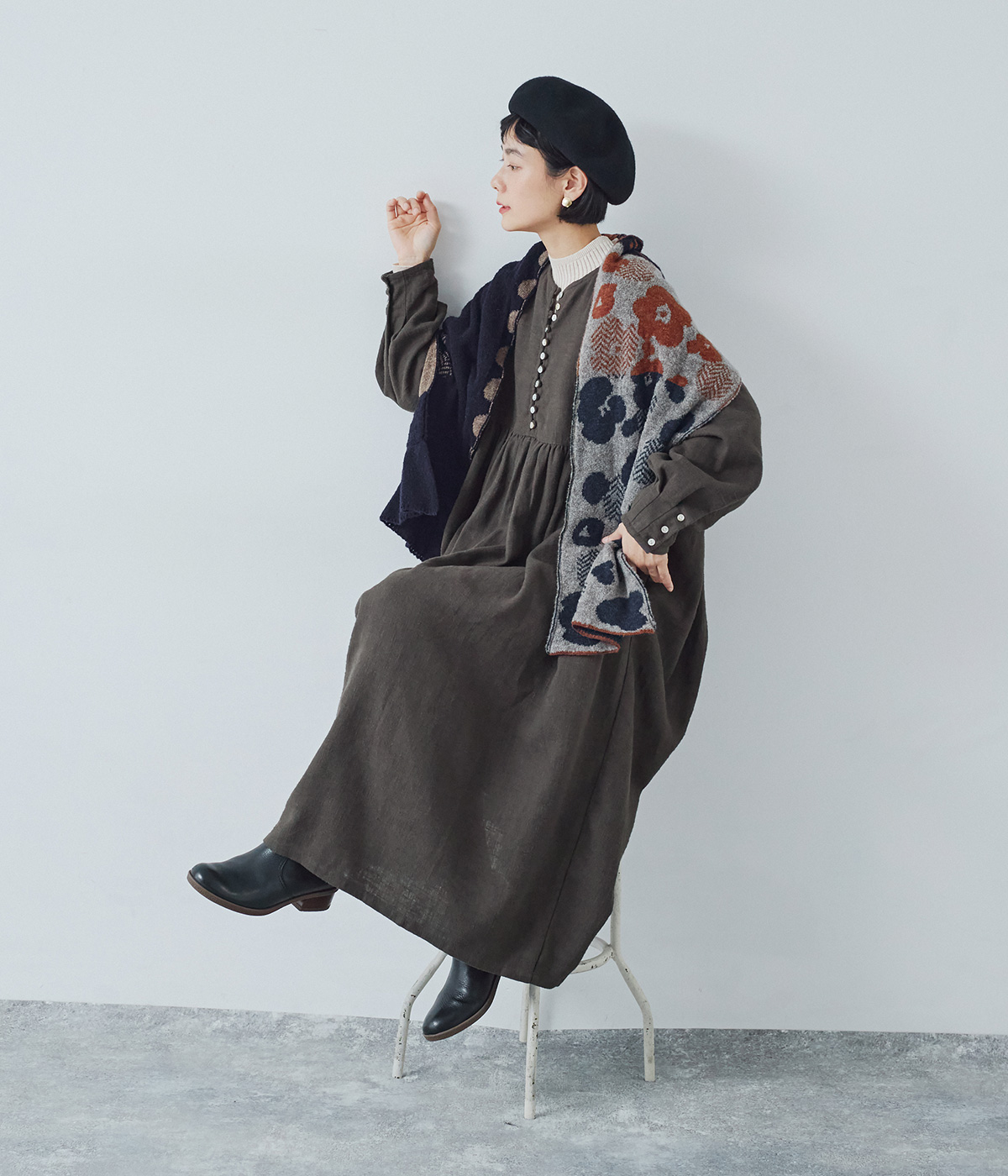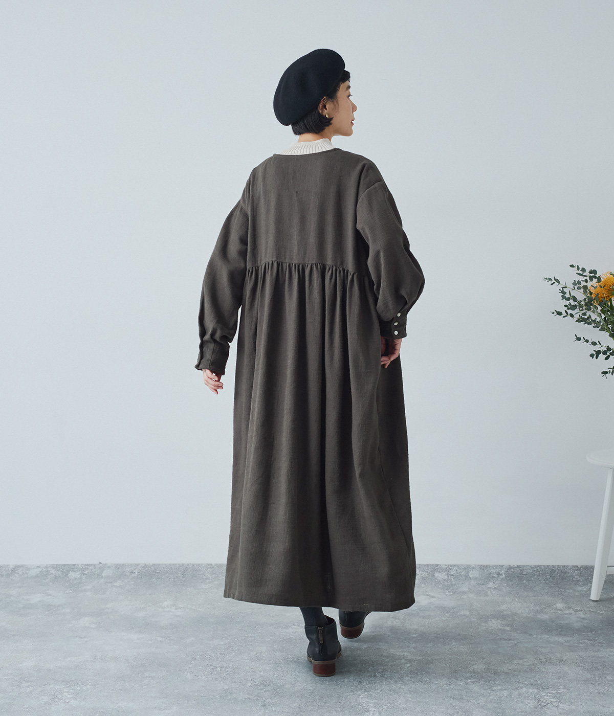 コットンリネン起毛ボリューム袖ワンピースの着用コーディネート