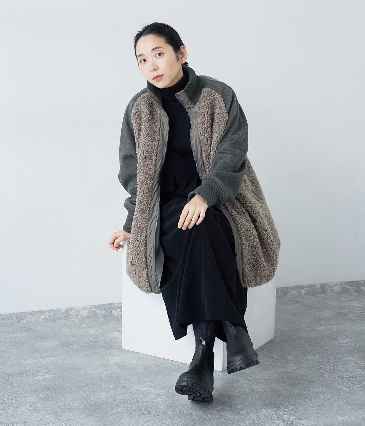 キルティングリバーシブルドルマンコートの着用コーディネート
