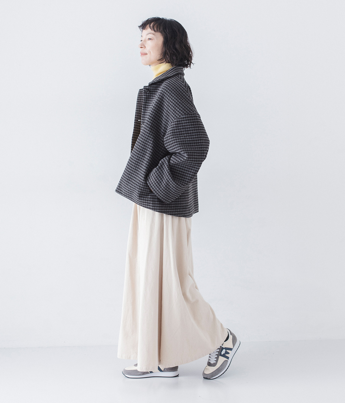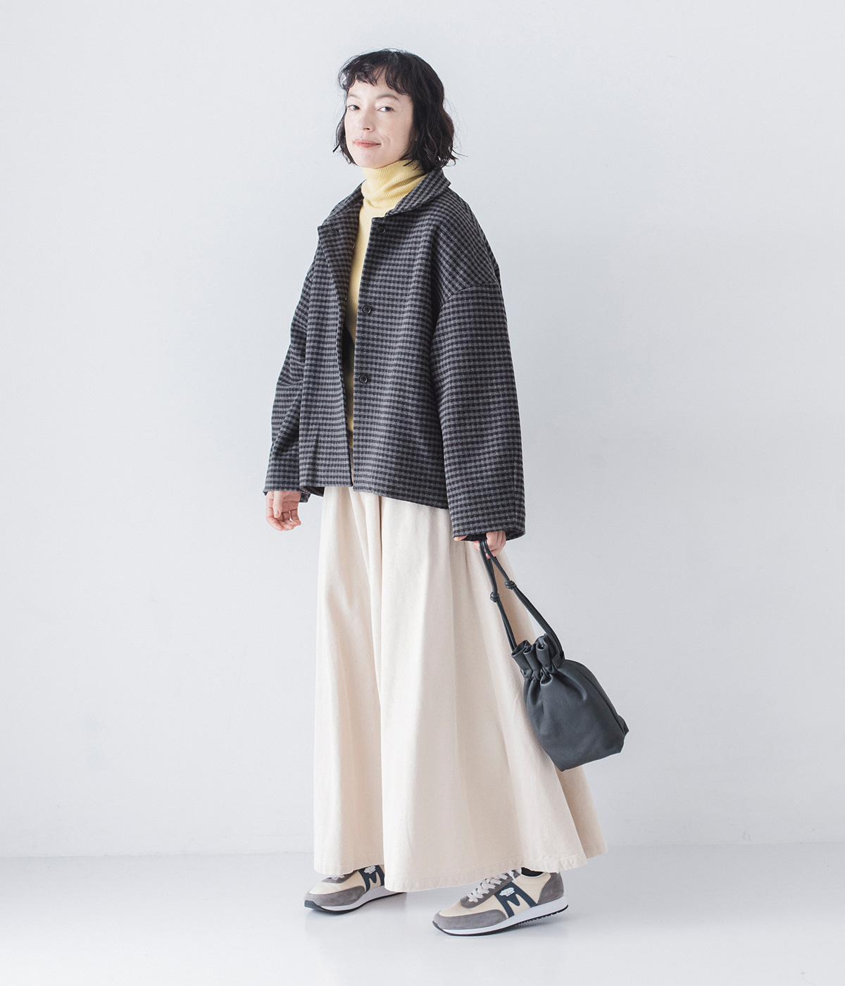 ギンガムチェック中綿ジャケットの着用コーディネート