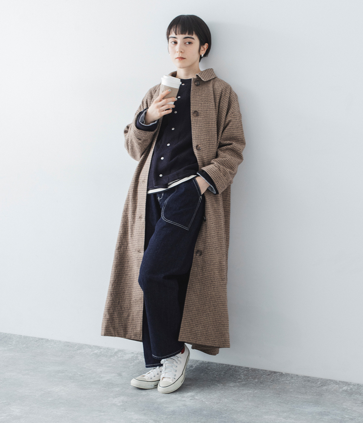 トップスにはボーダーを合わせて軽やかさをプラスし、羽織りにはコンパクトなカーディガンを重ねて全体をすっきりとまとめました。足元はスニーカーで抜け感を出し、デイリーに取り入れやすい着こなしに仕上げました。