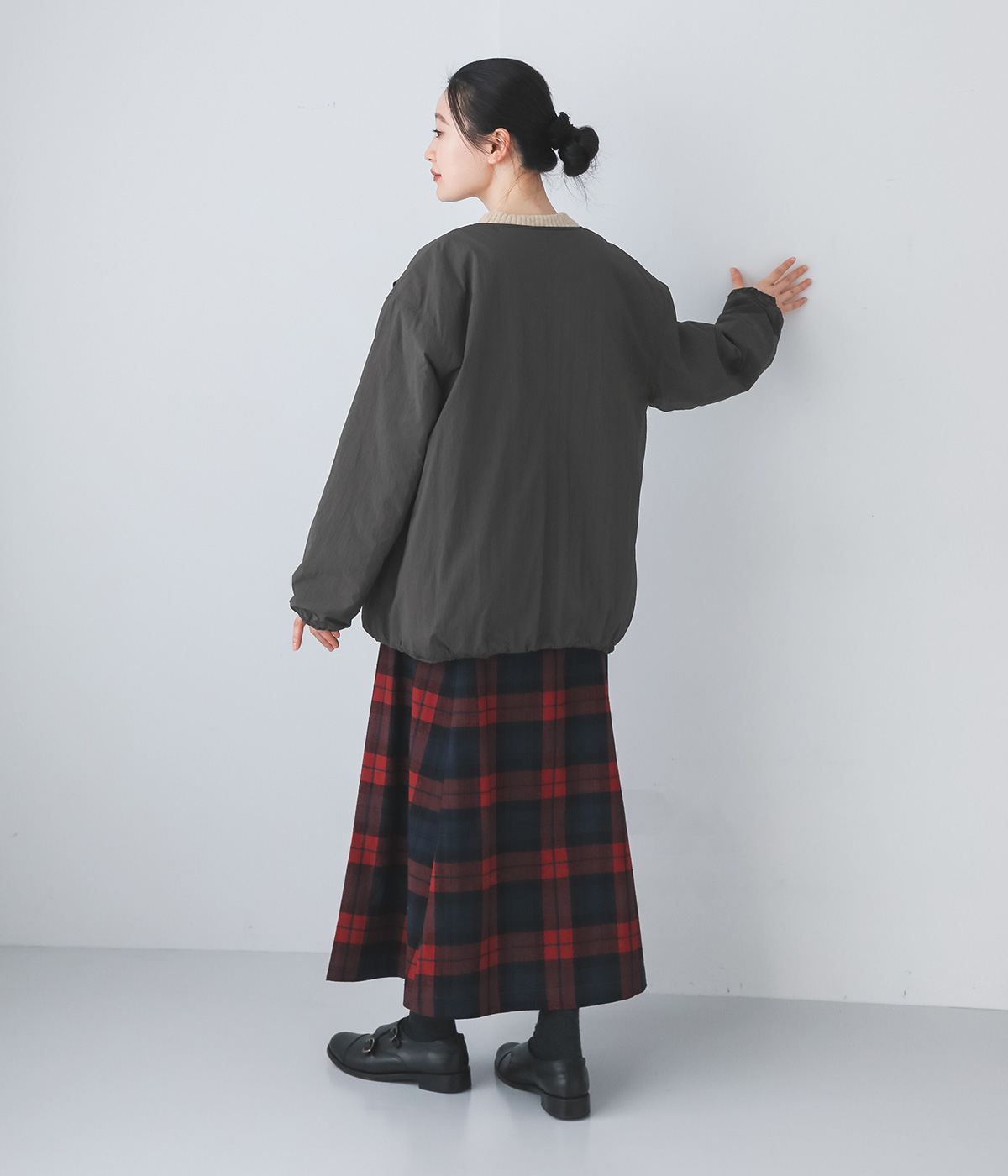 カジュアルな素材のコートは、チェックのプリーツスカートを合わせて、上品な印象にまとめました。