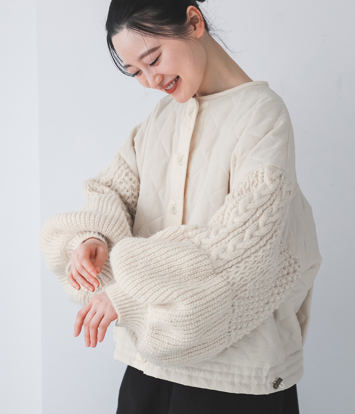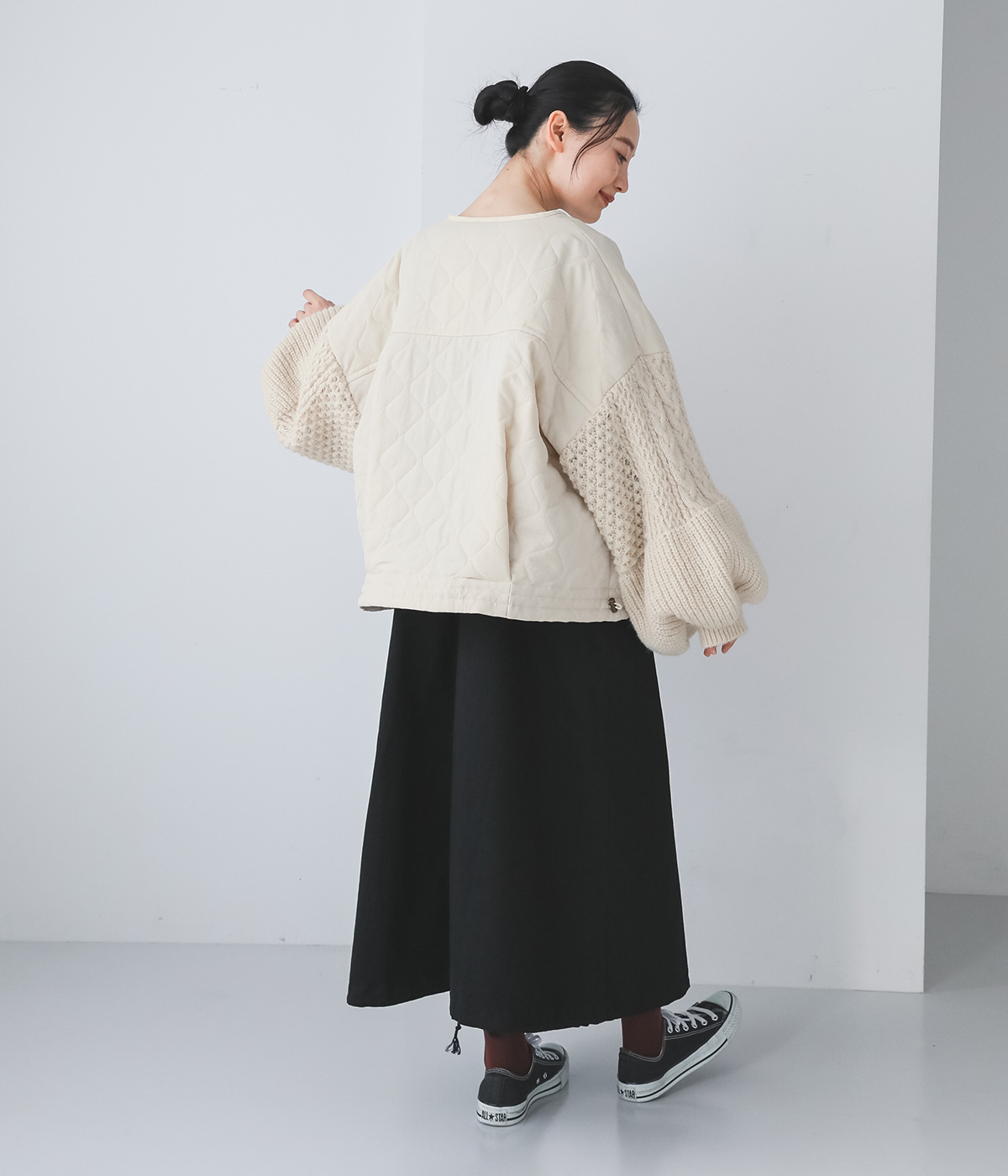 ケーブル編みのニットと、丸みを持たせた袖が目を惹くブルゾンを主役にしたコーディネート。