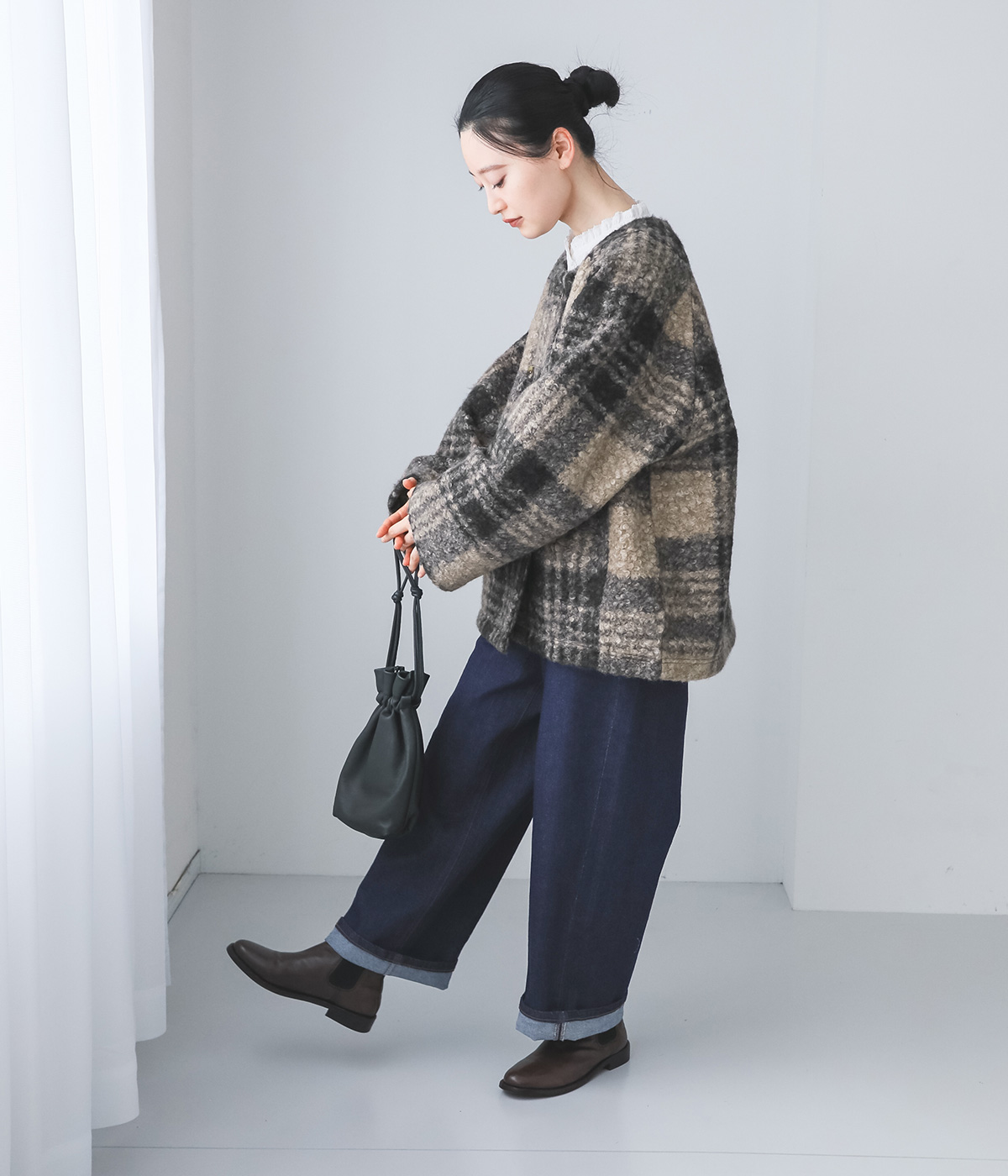 ノーカラー袖ニットブルゾンの着用コーディネート