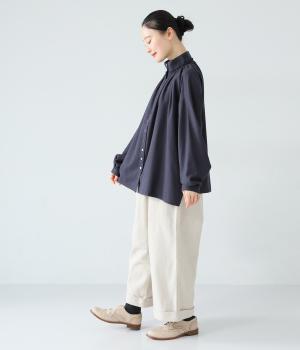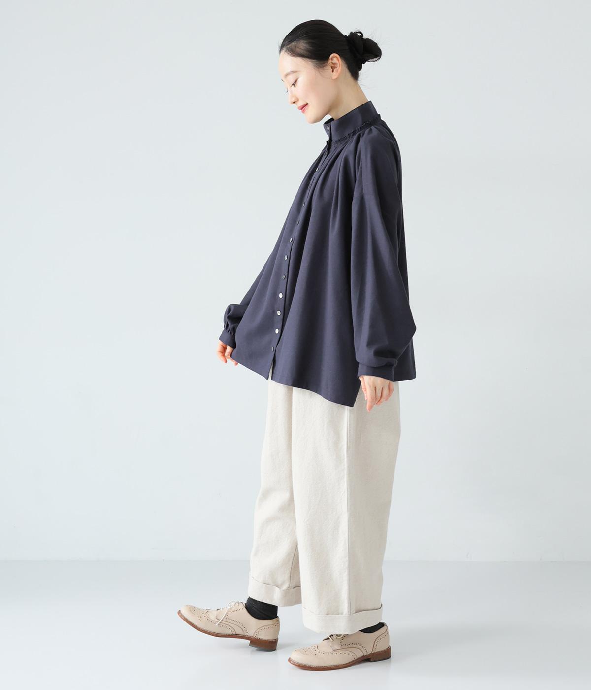 ゆったりとした着心地のドロップショルダーのブラウス。首まわりのギャザーや袖口カフスのデザインが、少しレトロな雰囲気を漂わせます。一枚でシンプルにボトムと合わせてもサマになり、前開きなので、羽織りものとしても着まわすのもおすすめです。