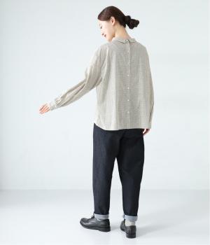ボタンをあしらった後ろ襟が、バックスタイルまで上品に見せてくれます。裾はやや後ろ下がりにすることで、腰からヒップラインにかけて自然な流れをつくり、立体感をプラス。