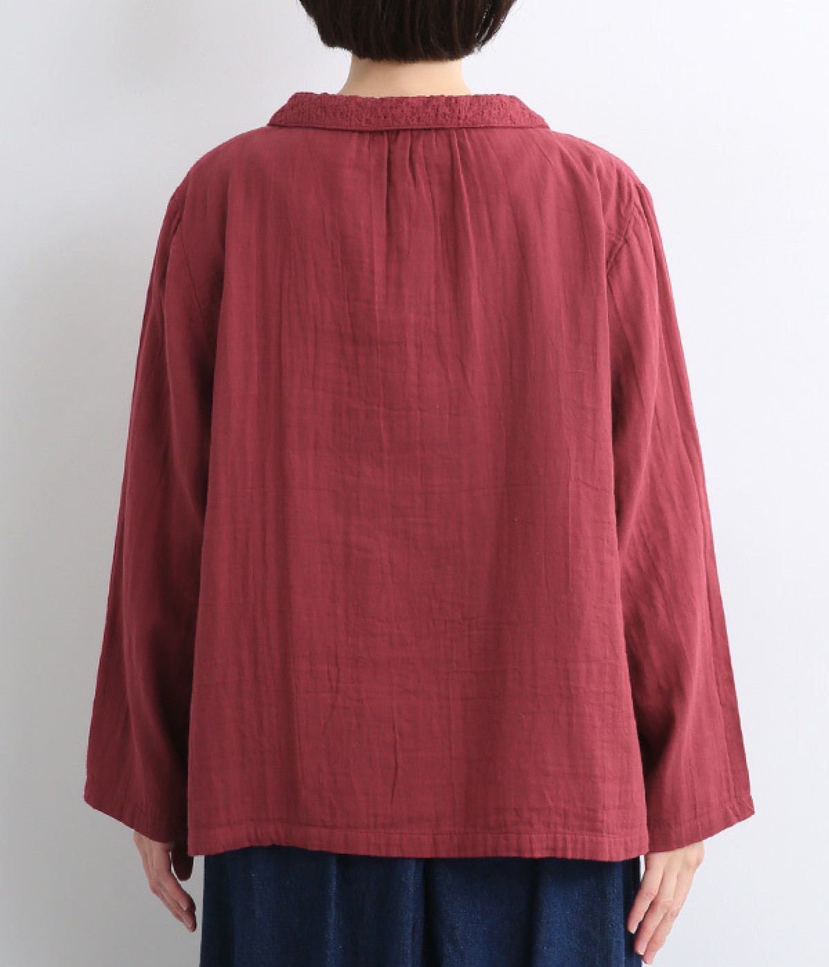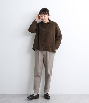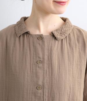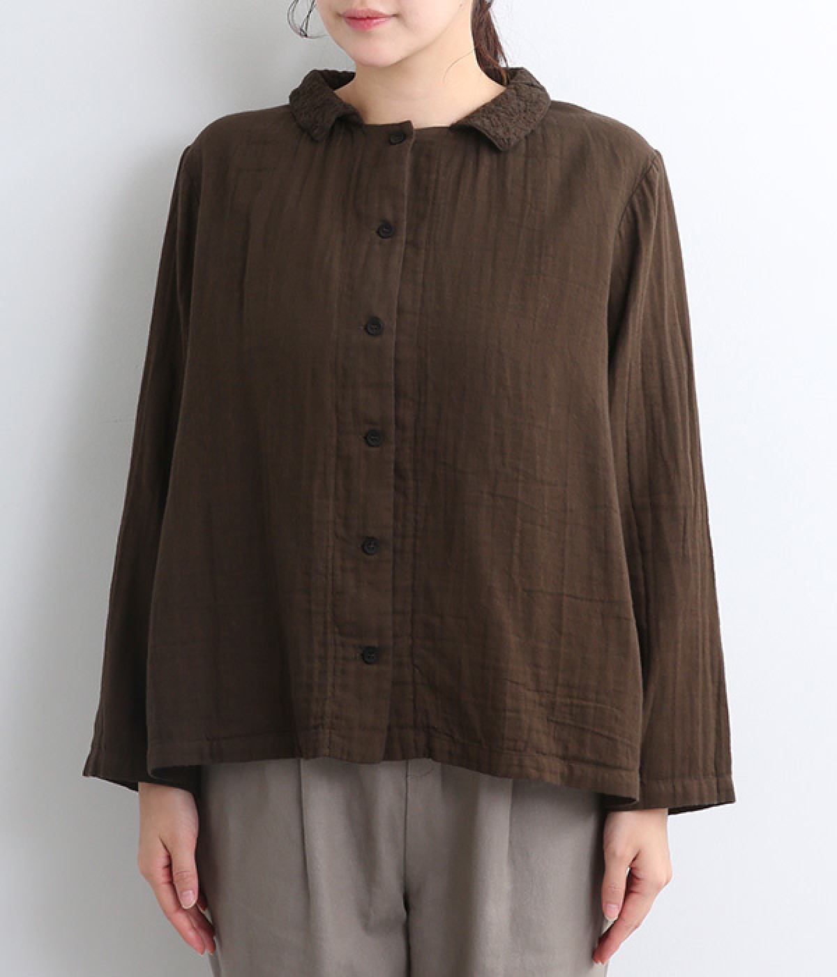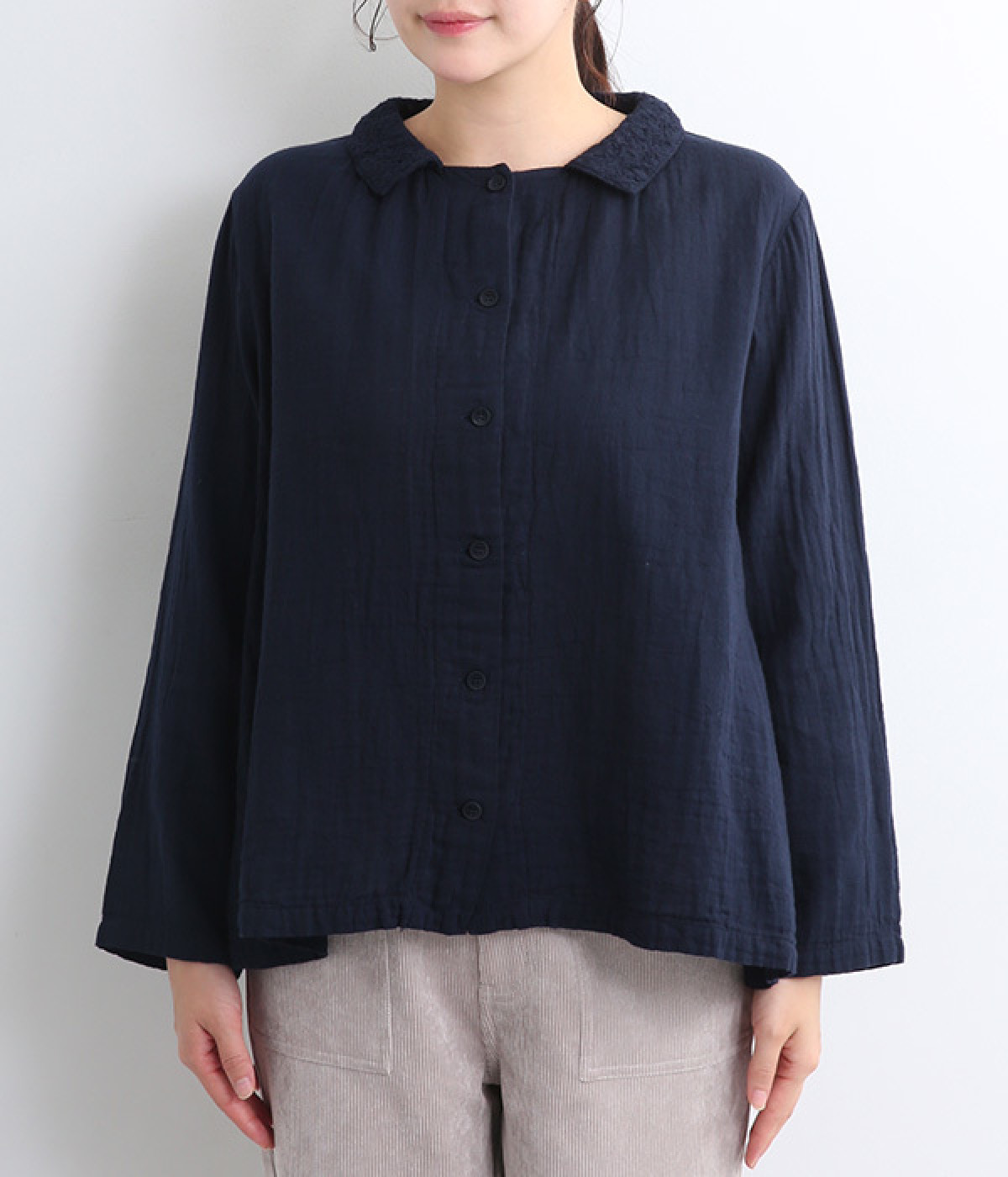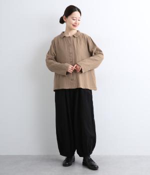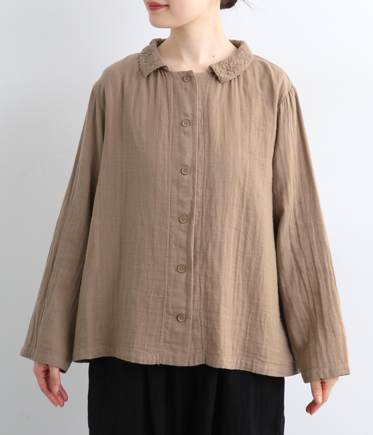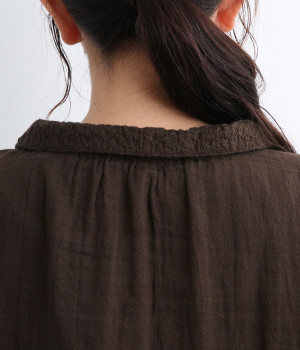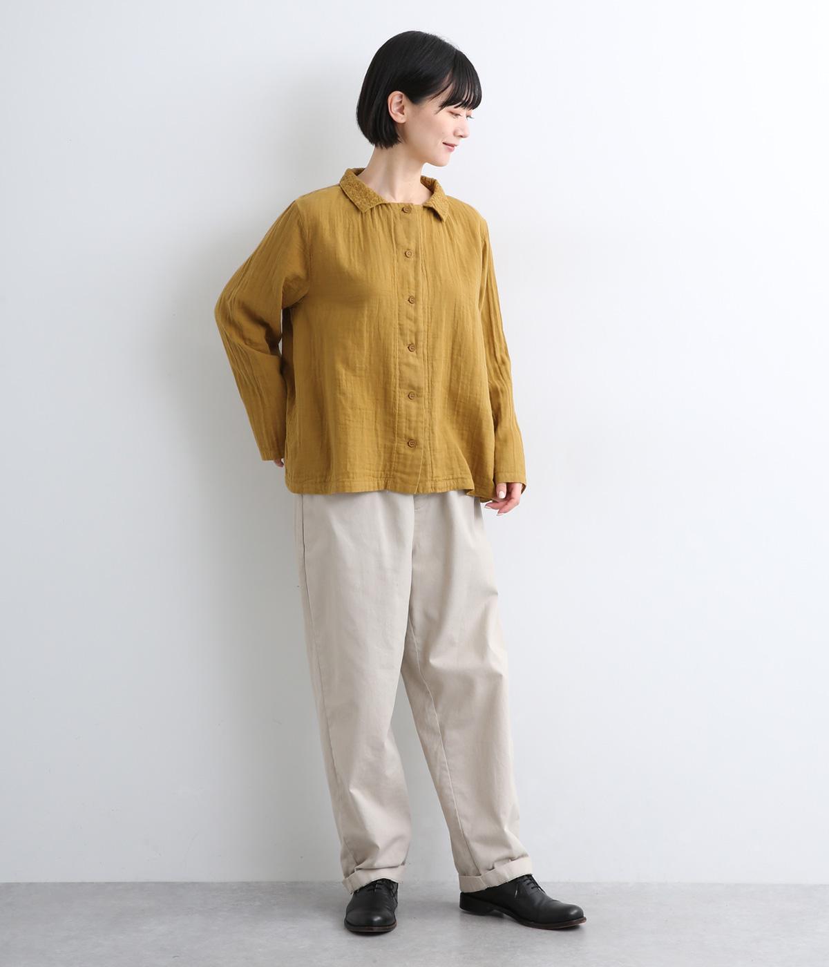 ガーゼのやさしい雰囲気にマッチした襟刺しゅうデザインが特徴的なブラウス。大人ガーリーな雰囲気に仕上がっていて、カジュアルなアイテム合わせもナチュラルにまとめてくれます。ボタンあき仕様なのであたたかな季節は羽織り使いもおすすめ。