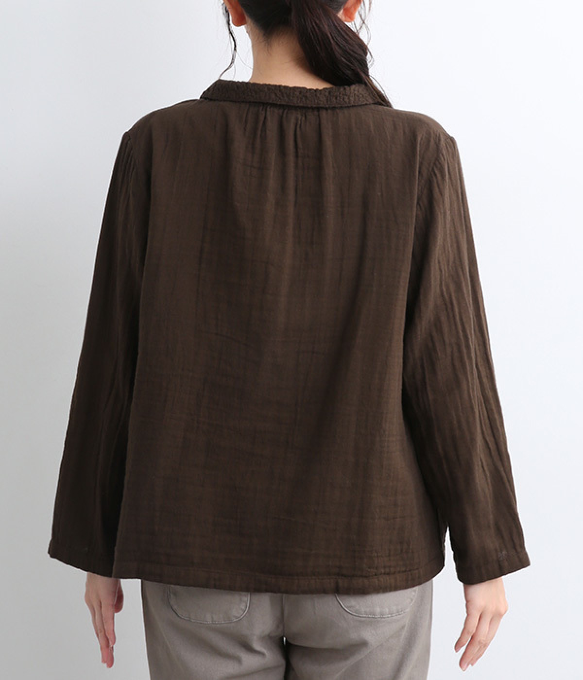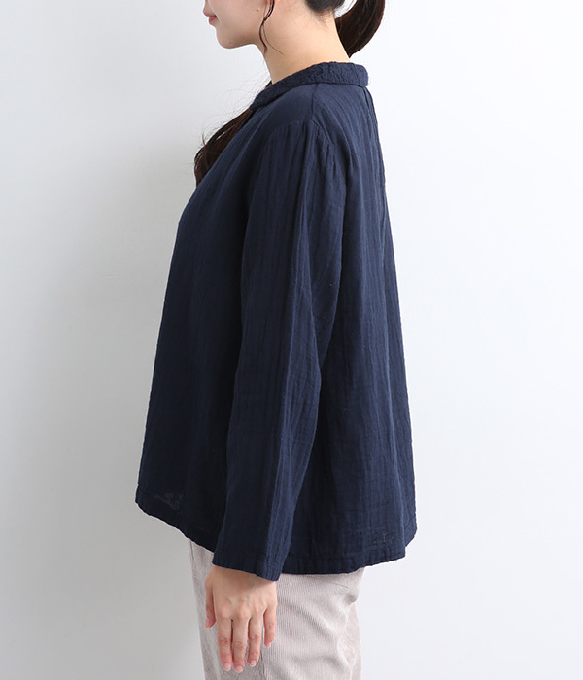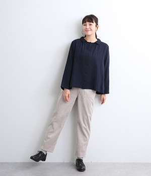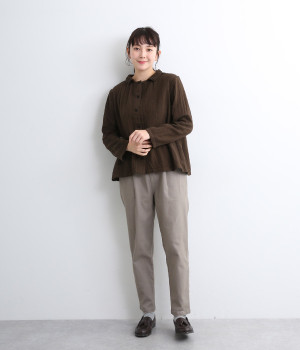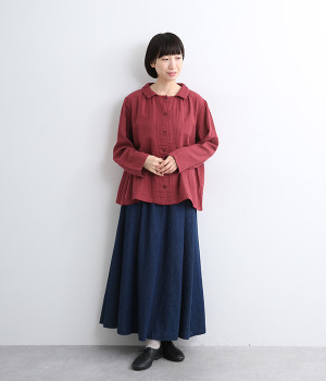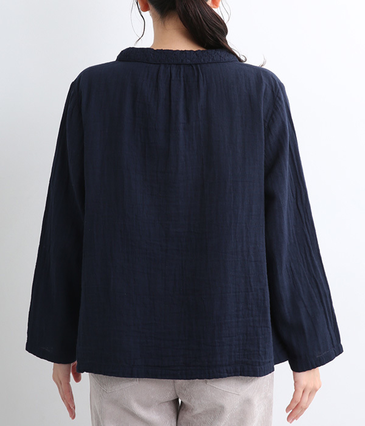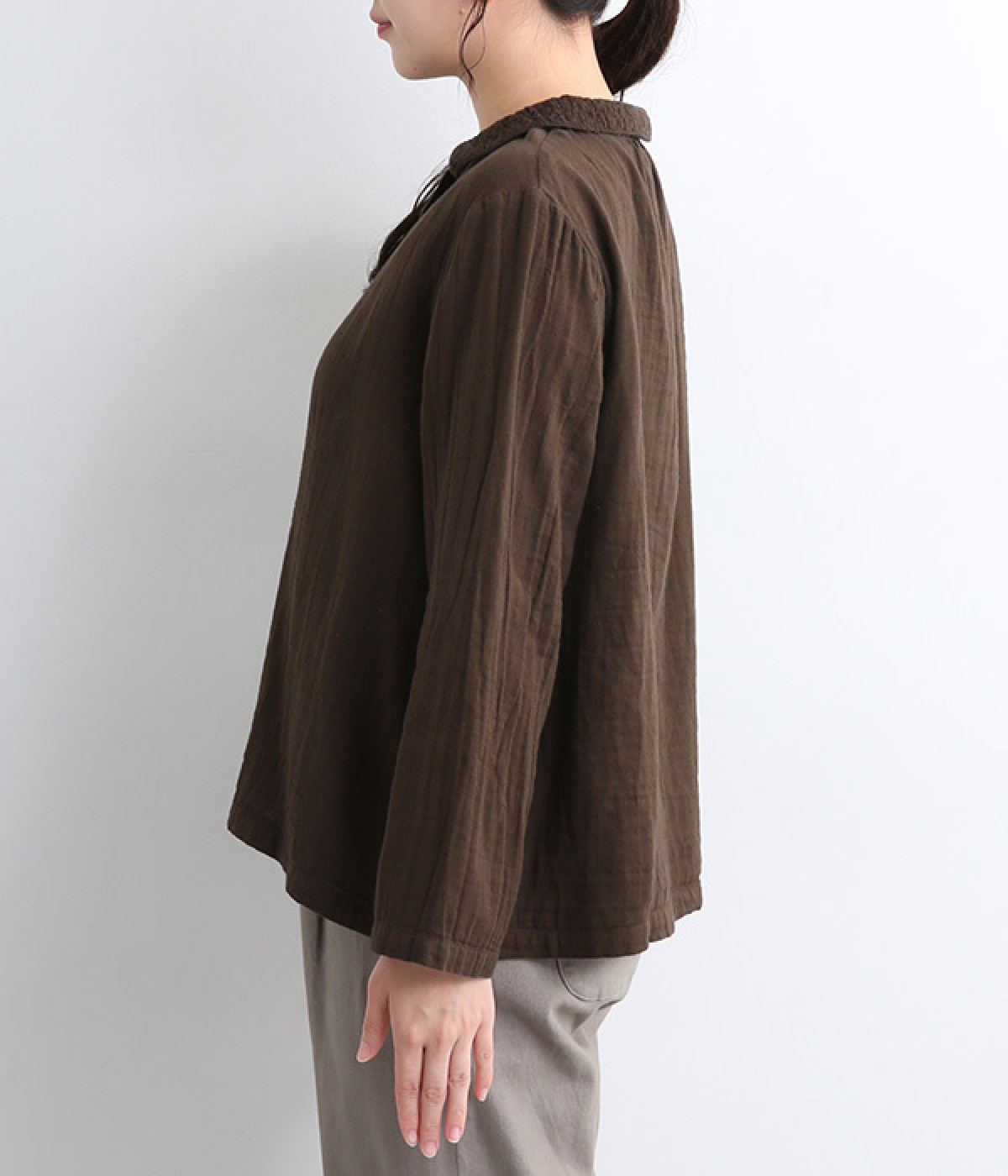ガーゼのやさしい雰囲気にマッチした襟刺しゅうデザインが特徴的なブラウス。大人ガーリーな雰囲気に仕上がっていて、カジュアルなアイテム合わせもナチュラルにまとめてくれます。ボタンあき仕様なのであたたかな季節は羽織り使いもおすすめ。