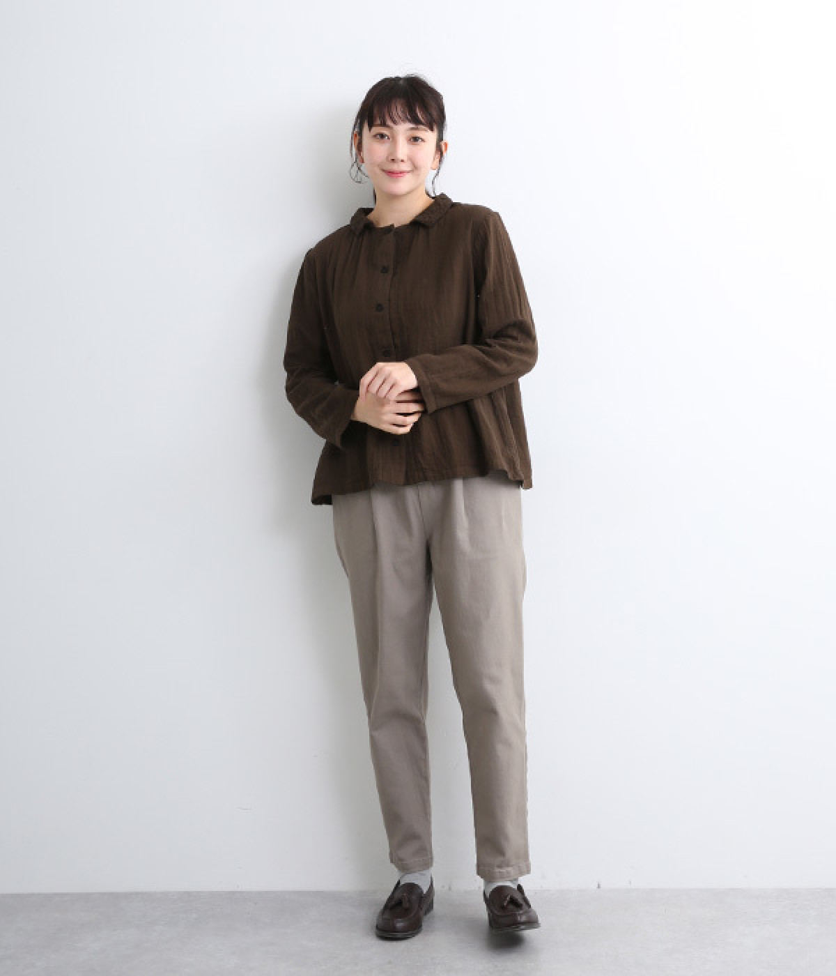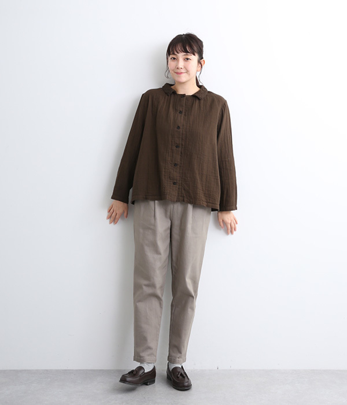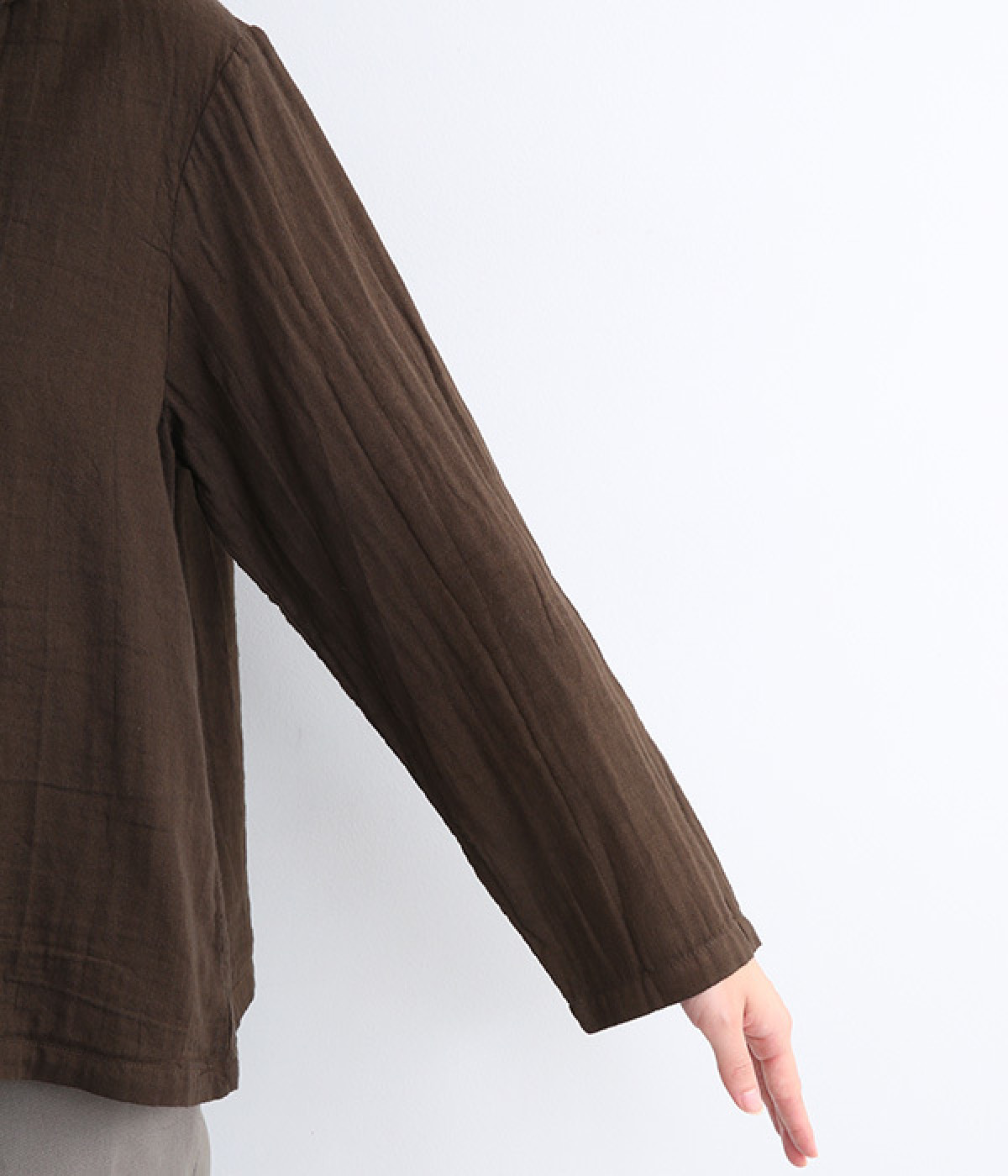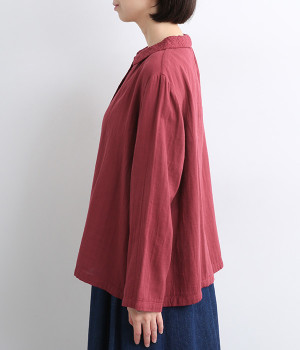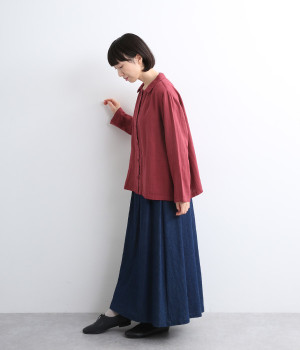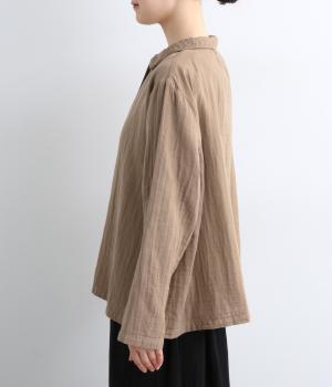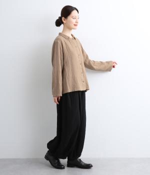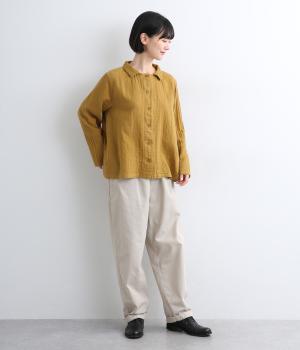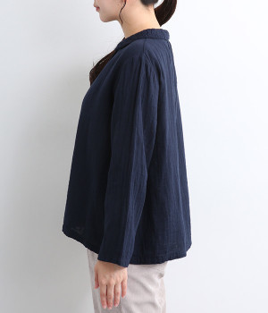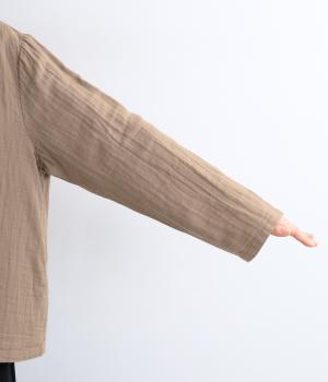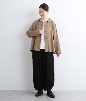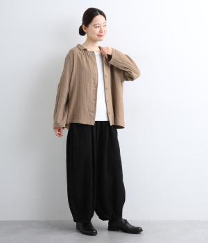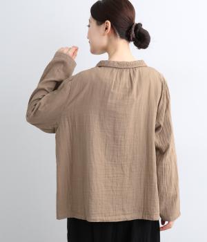 ふんわりとした肌あたりにやさしい表情が魅力的なコットンダブルガーゼで仕立てました。吸湿・速乾・通気性に優れた薄めの中厚手生地でロングシーズン活躍します。