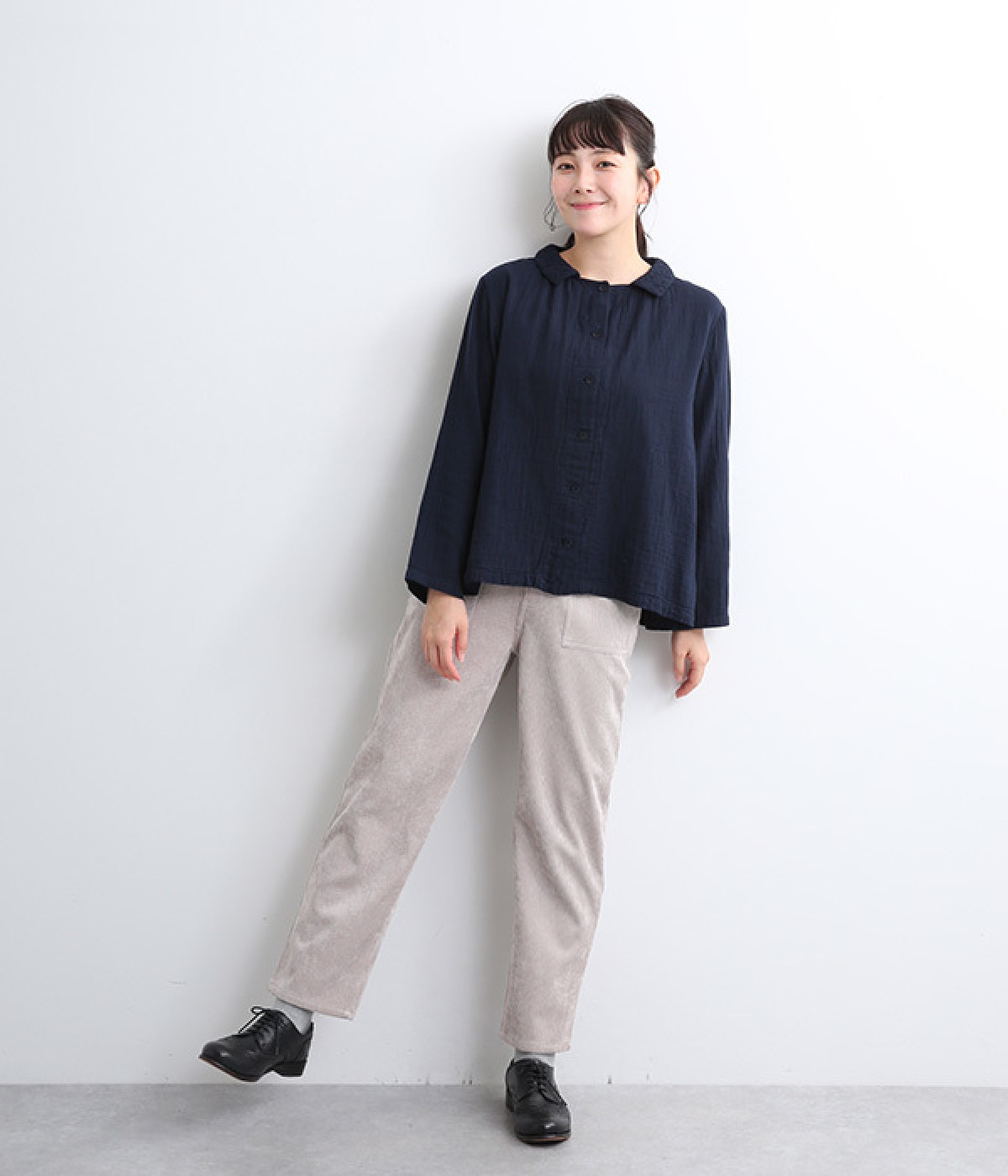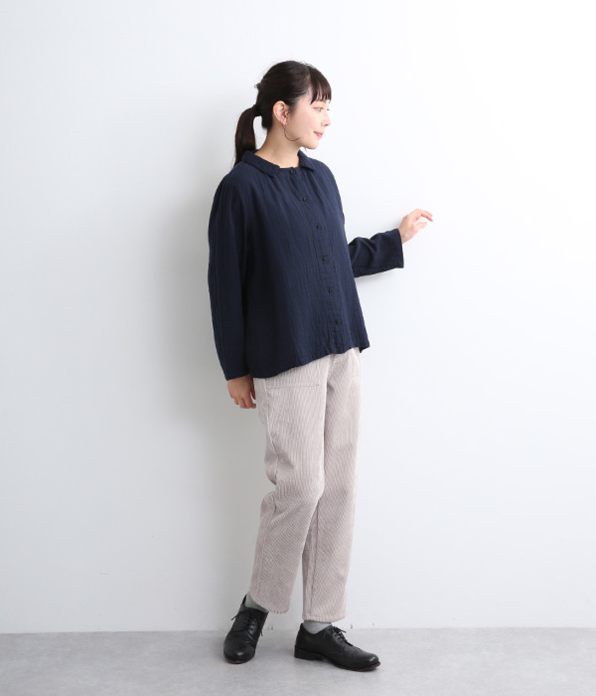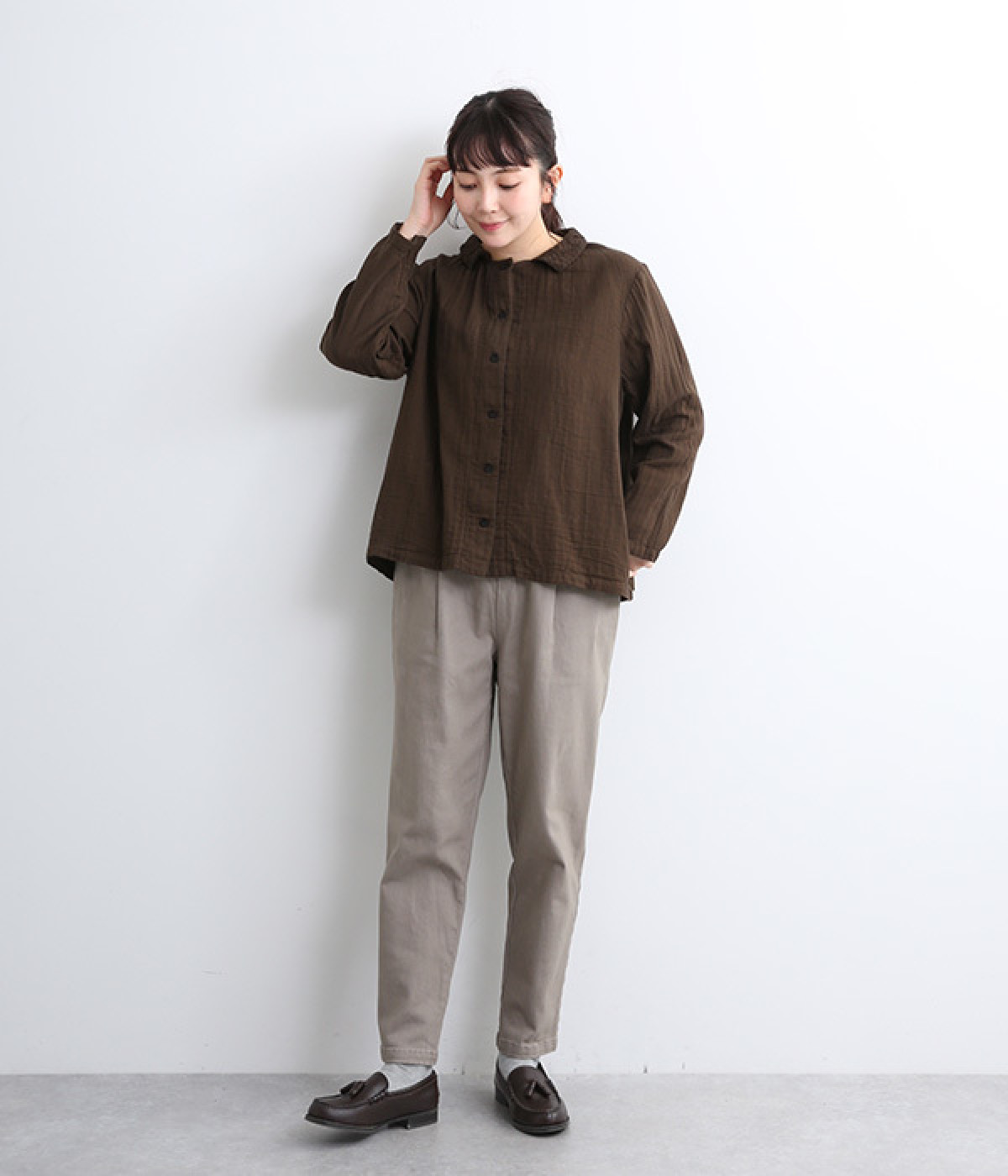 ふんわりとした肌あたりにやさしい表情が魅力的なコットンダブルガーゼで仕立てました。吸湿・速乾・通気性に優れた薄めの中厚手生地でロングシーズン活躍します。