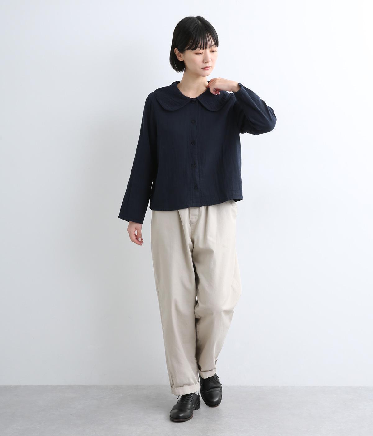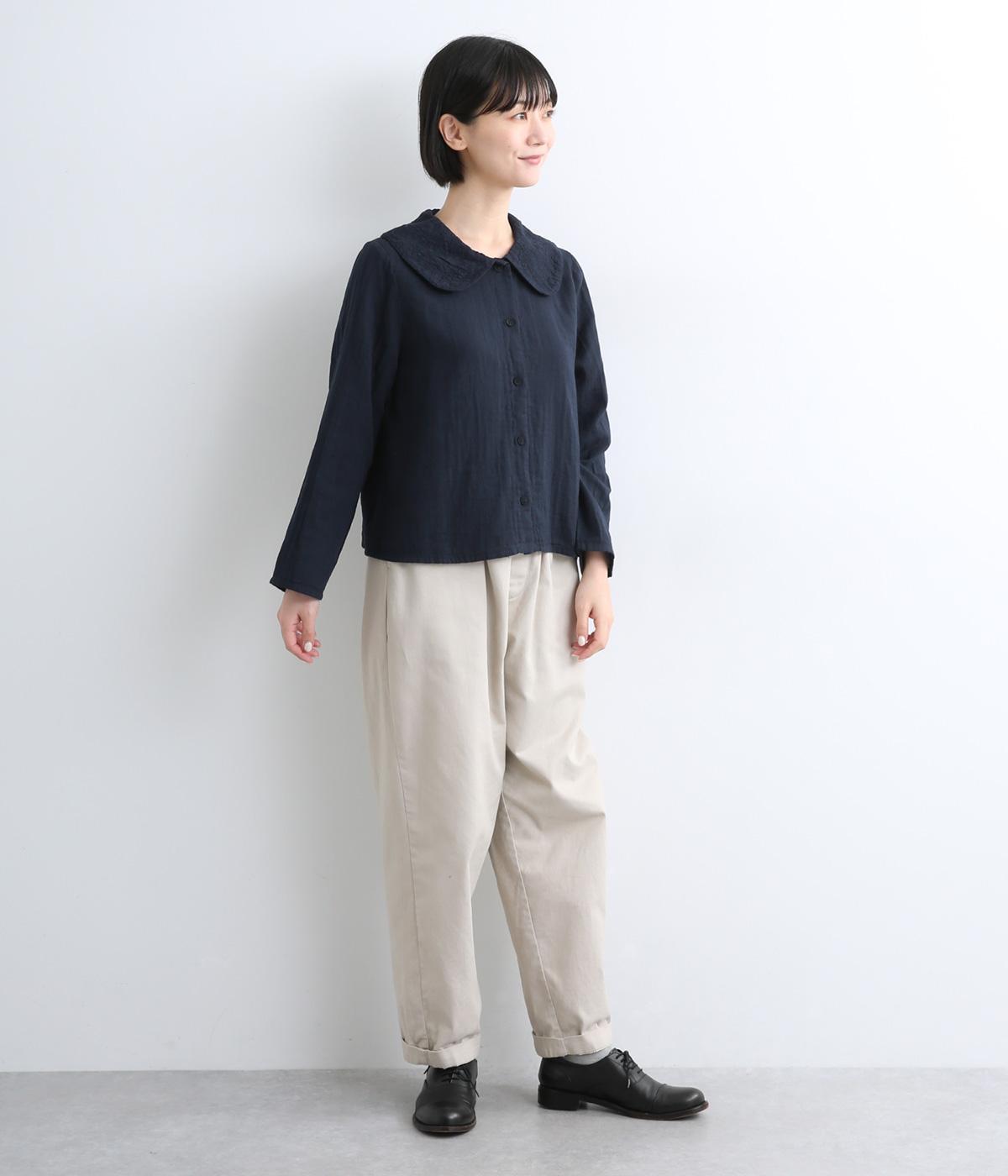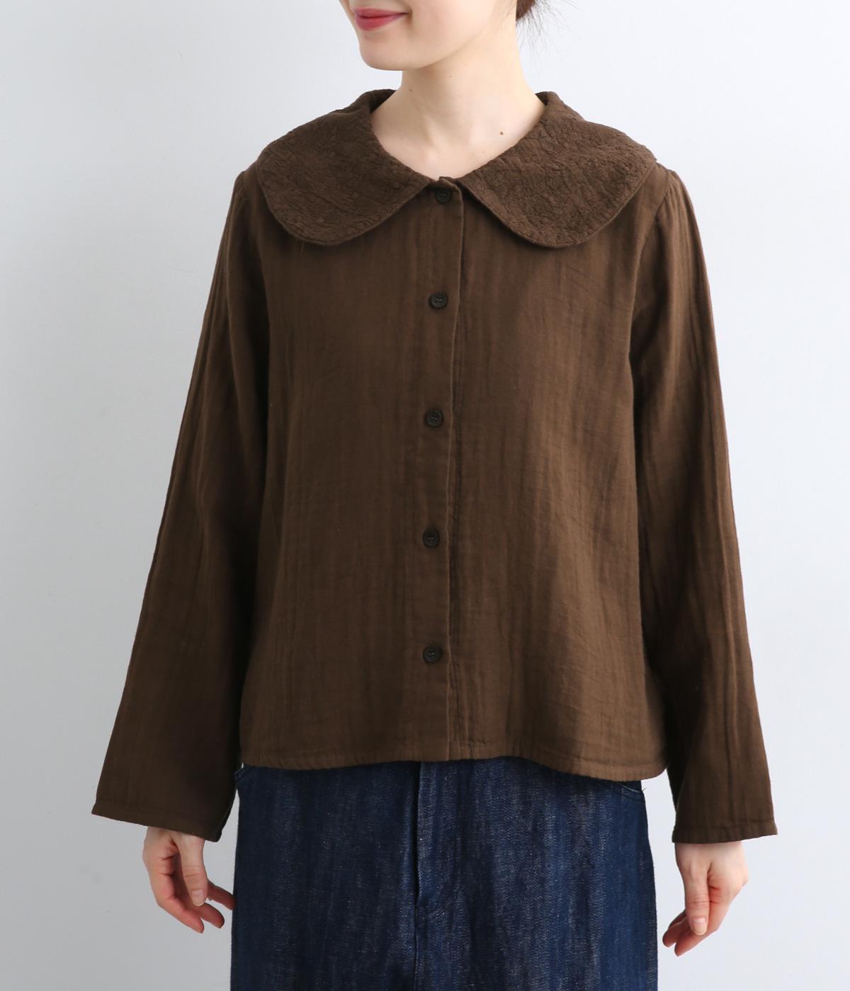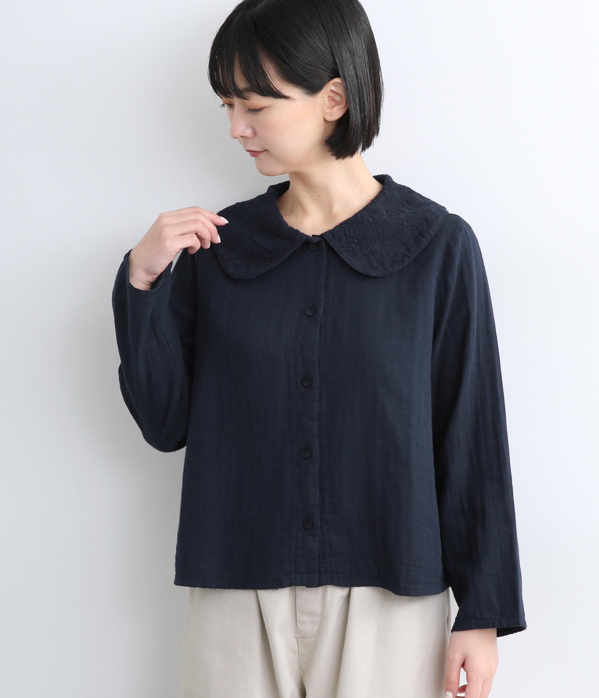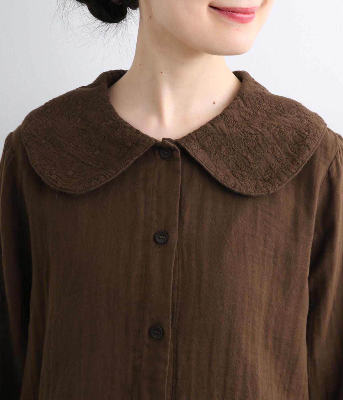 さり気なく刺しゅうをほどこした、大きな丸襟が目を惹くブラウスです。ガーゼのやさしい雰囲気にマッチした大人ガーリーな仕上がりで、甘すぎずデイリーに着まわしやすい一枚。ボタンあき仕様なので羽織り使いもおすすめです。