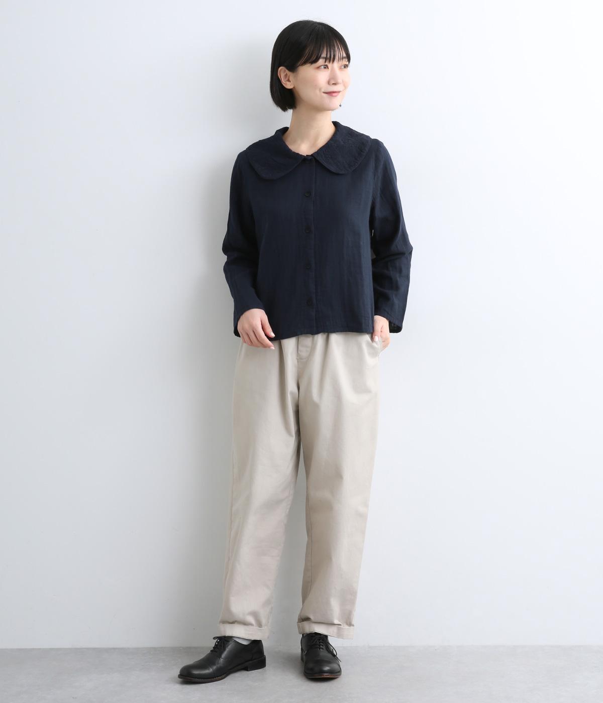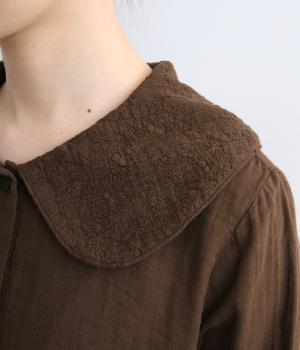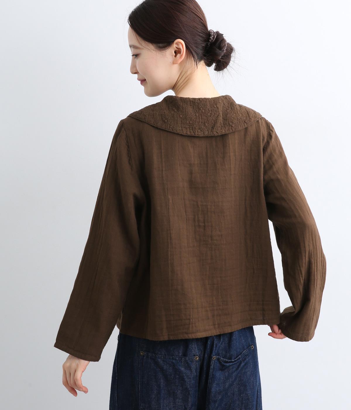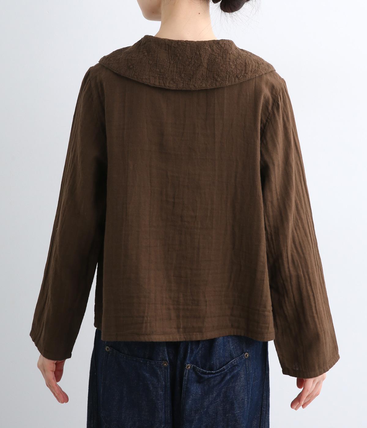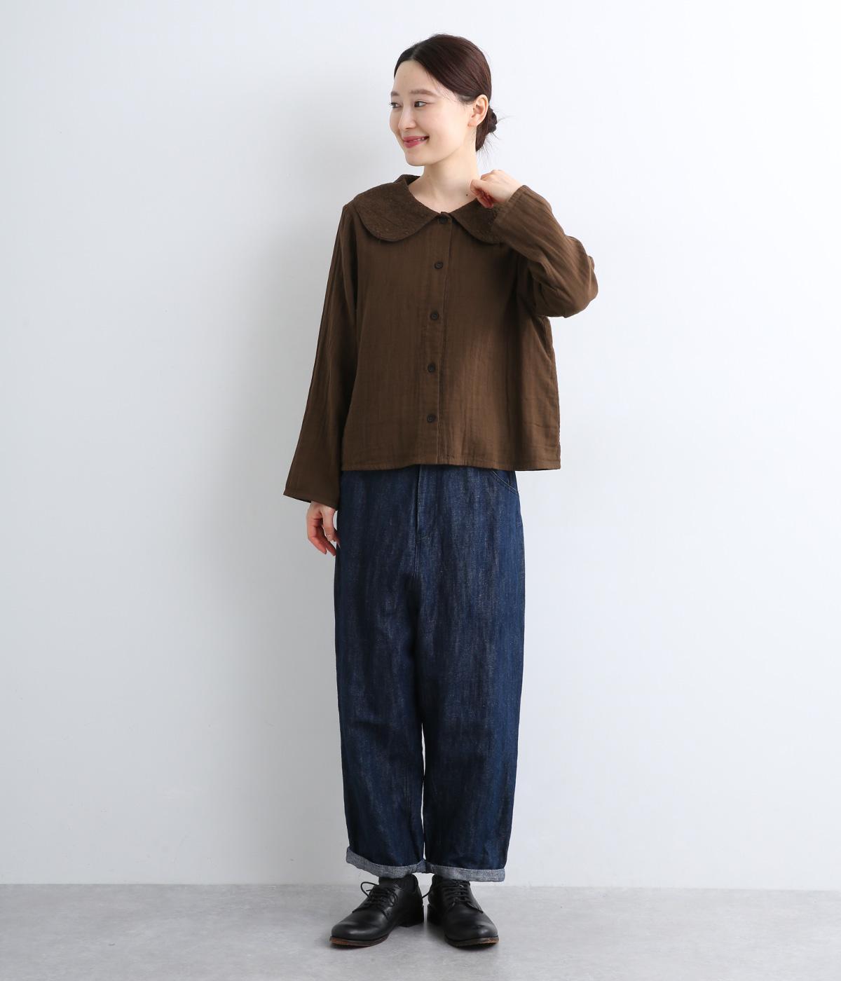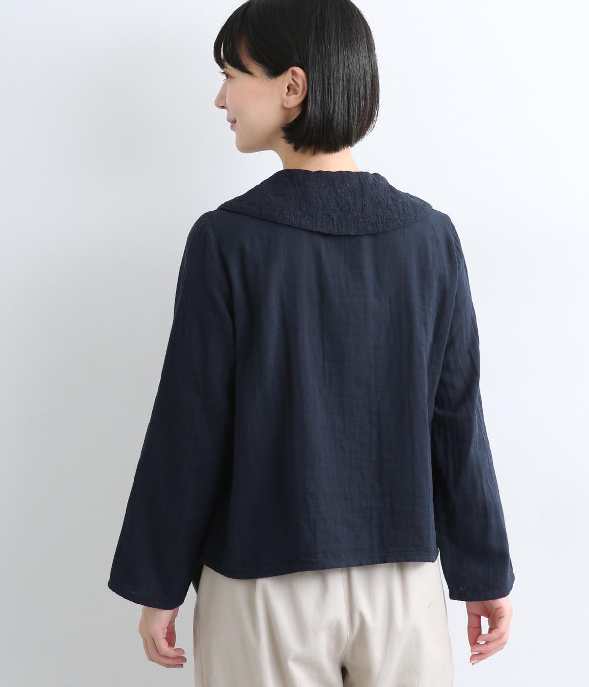 さり気なく刺しゅうをほどこした、大きな丸襟が目を惹くブラウスです。ガーゼのやさしい雰囲気にマッチした大人ガーリーな仕上がりで、甘すぎずデイリーに着まわしやすい一枚。ボタンあき仕様なので羽織り使いもおすすめです。