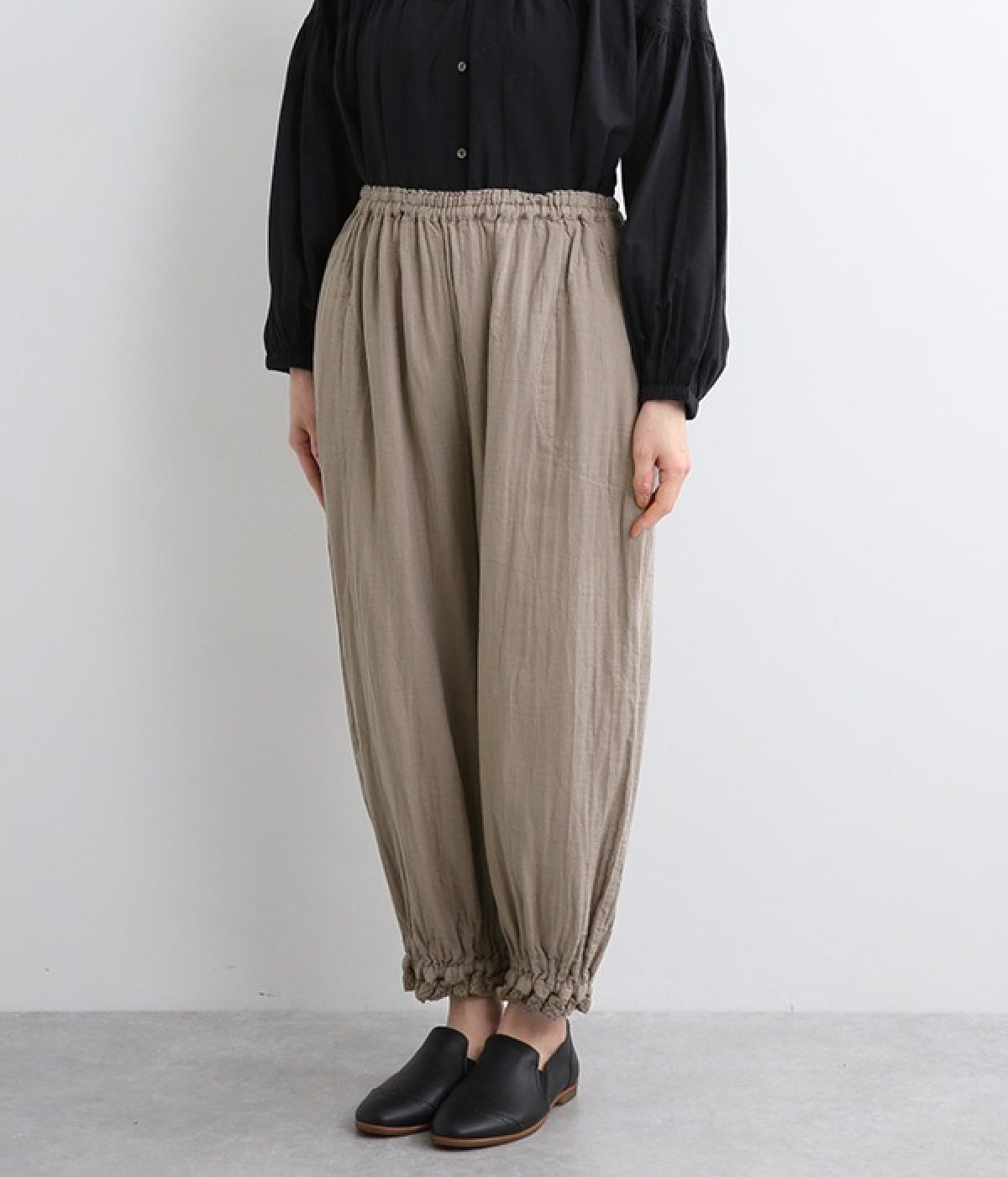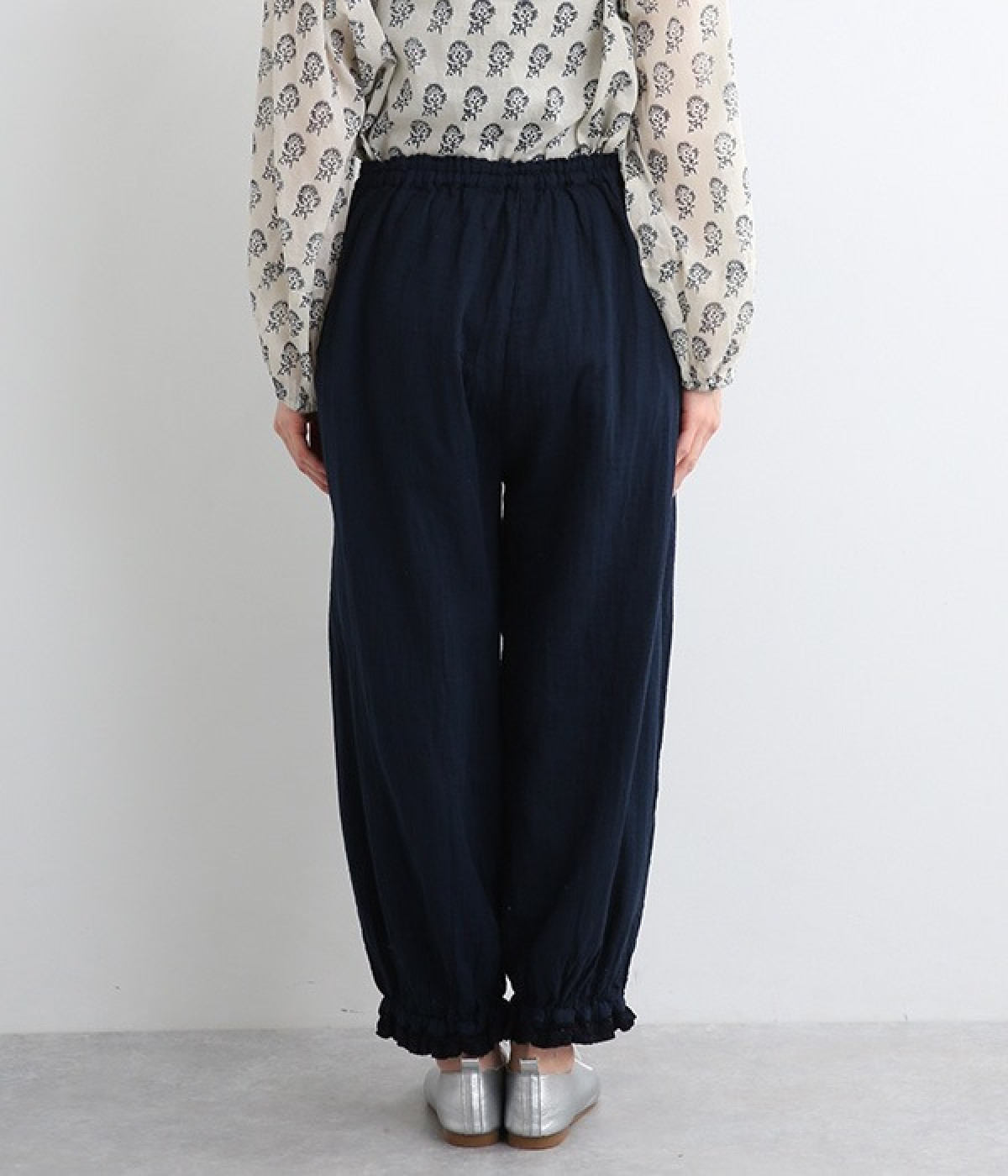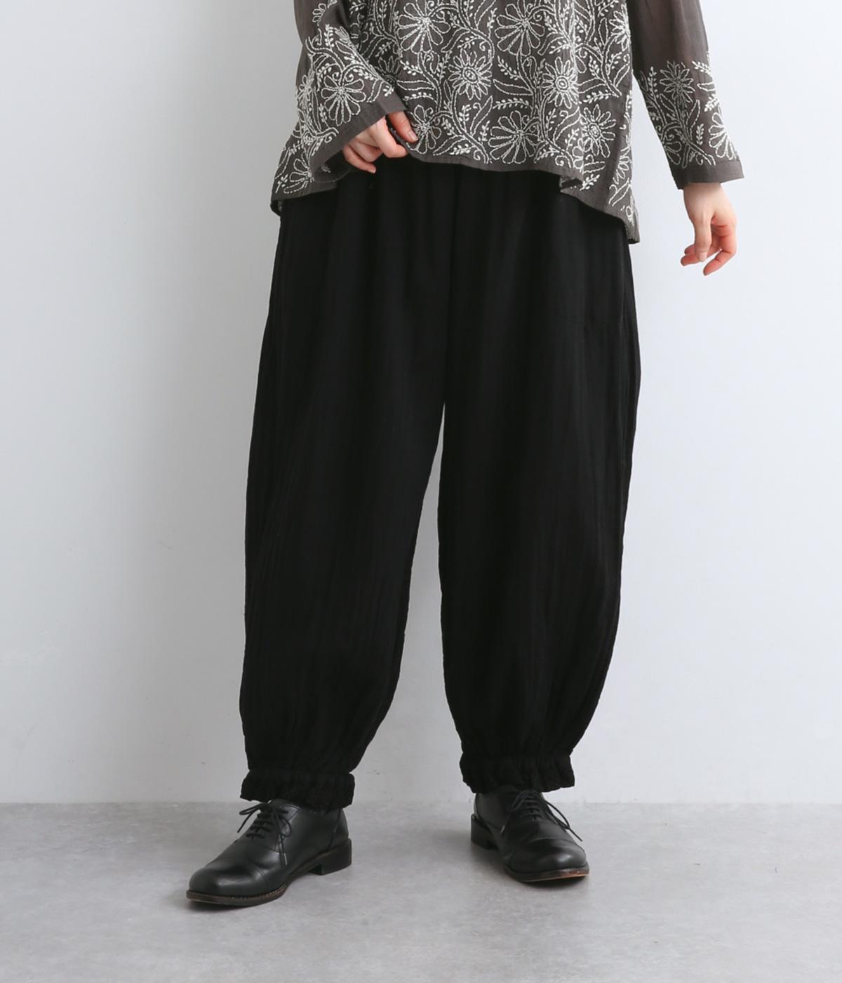 裾のレース使いが特徴的なパンツは、メリハリのあるシルエットでボリュームトップスやワンピースなどとのレイヤードにも活躍。ゴムギャザーを寄せているので裾をたくし上げて丈感のアレンジも◎。ウエストは総ゴムのイージー仕様。