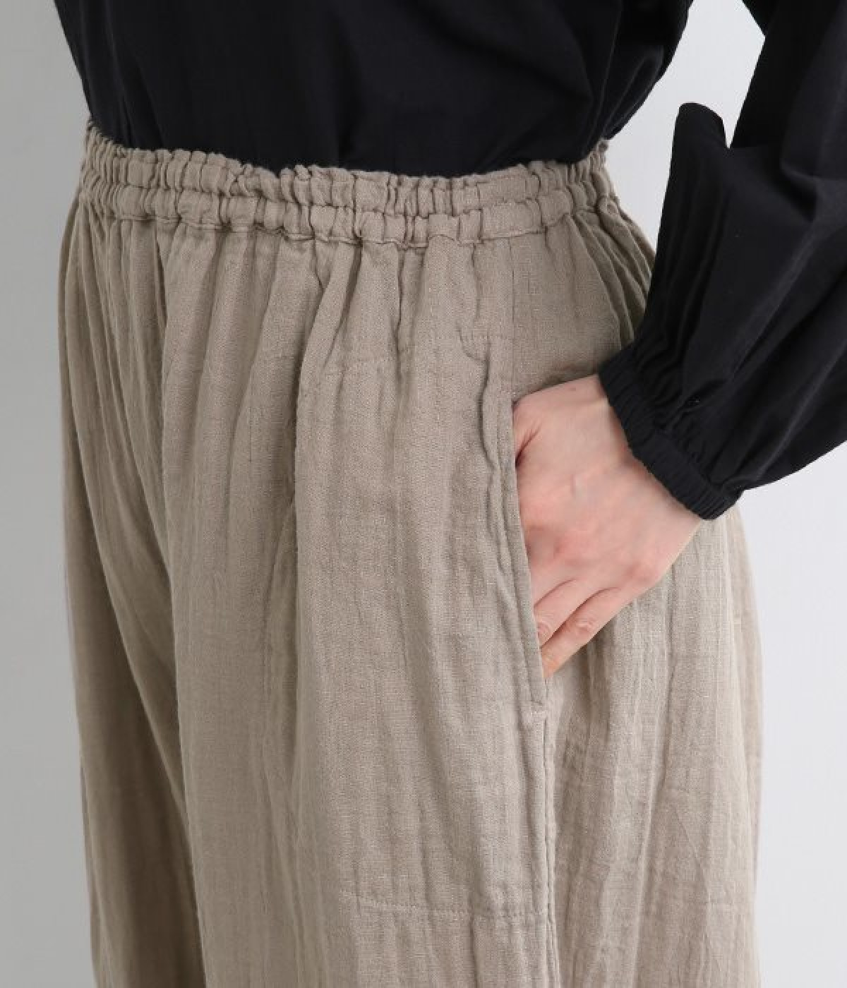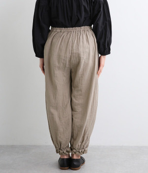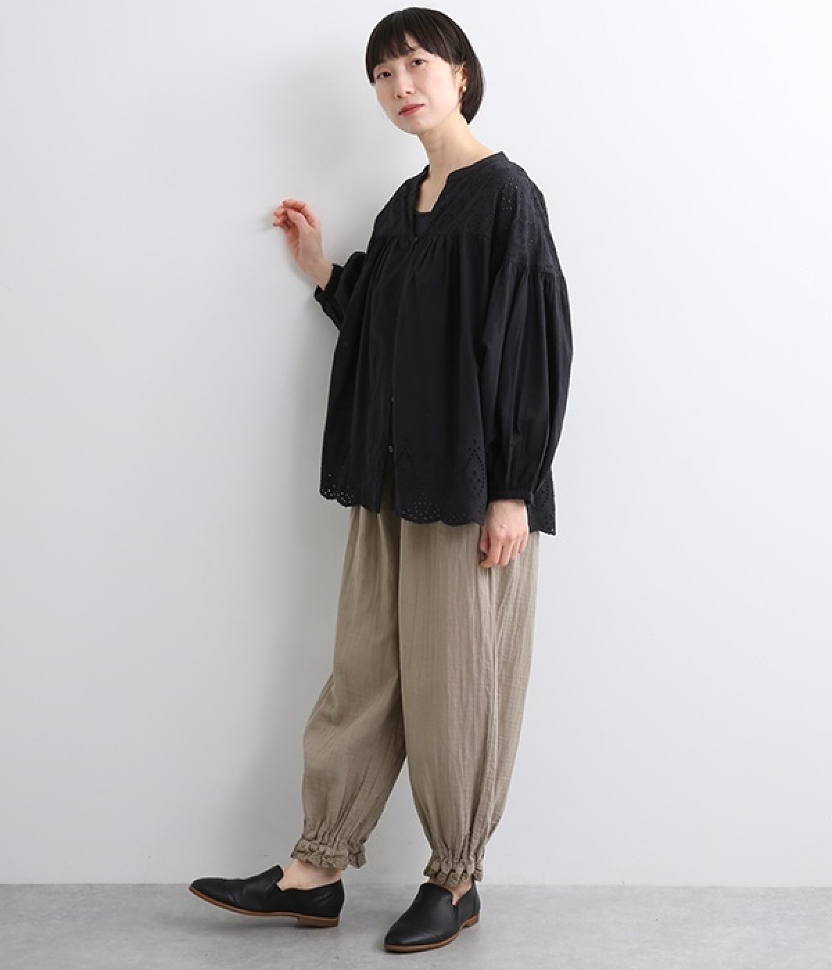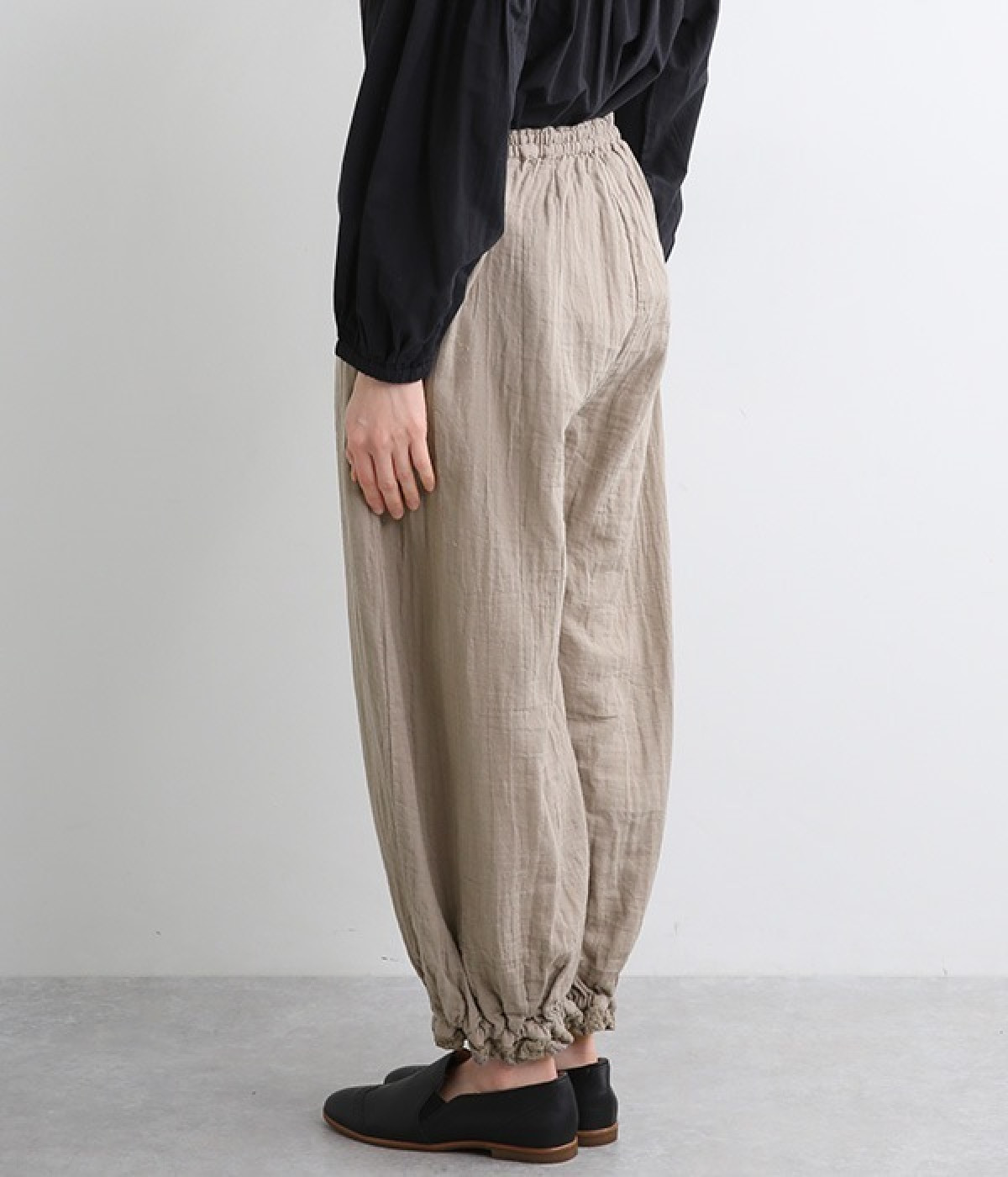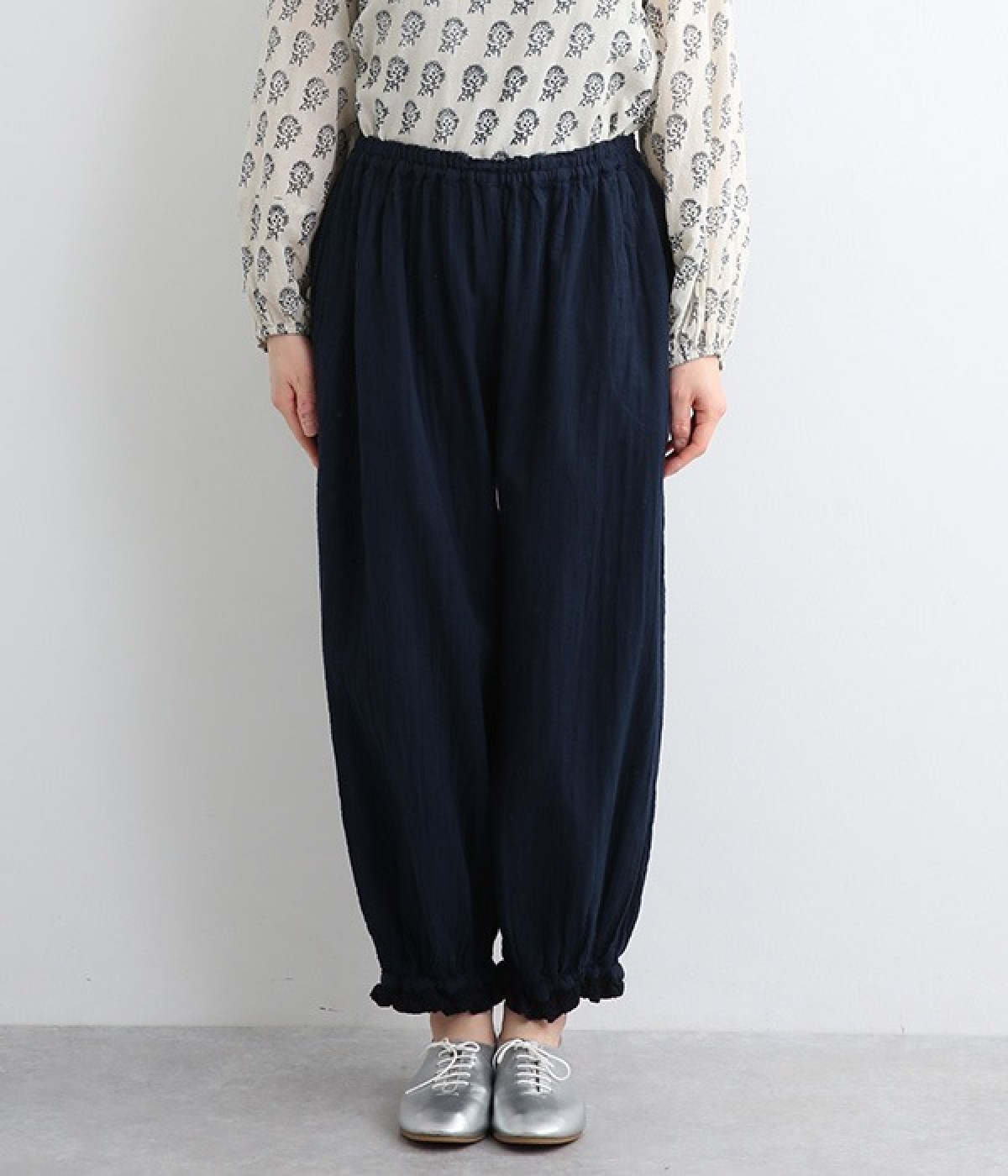 裾のレース使いが特徴的なパンツは、メリハリのあるシルエットでボリュームトップスやワンピースなどとのレイヤードにも活躍。ゴムギャザーを寄せているので裾をたくし上げて丈感のアレンジも◎。ウエストは総ゴムのイージー仕様。