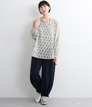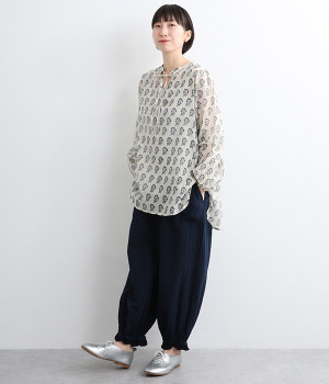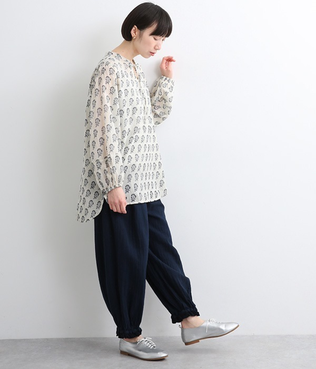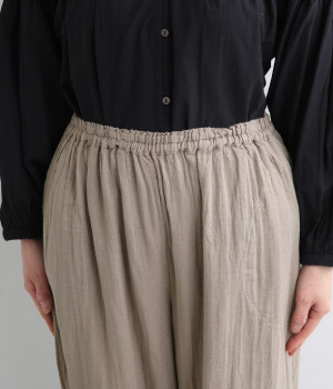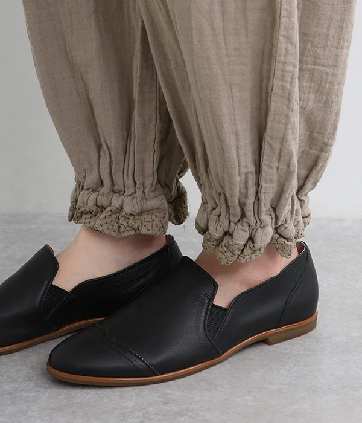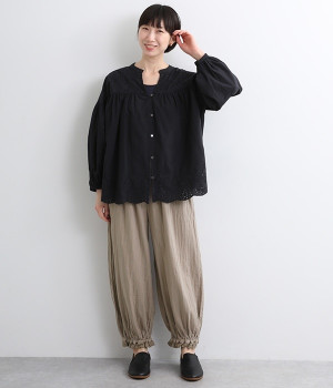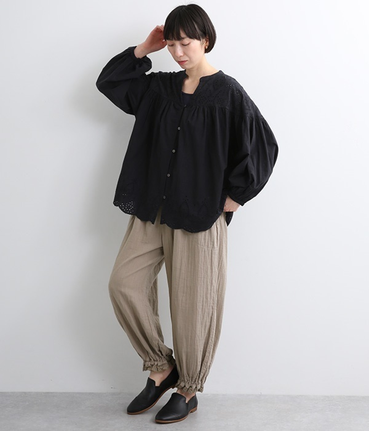 裾のレース使いが特徴的なパンツは、メリハリのあるシルエットでボリュームトップスやワンピースなどとのレイヤードにも活躍。ゴムギャザーを寄せているので裾をたくし上げて丈感のアレンジも◎。ウエストは総ゴムのイージー仕様。