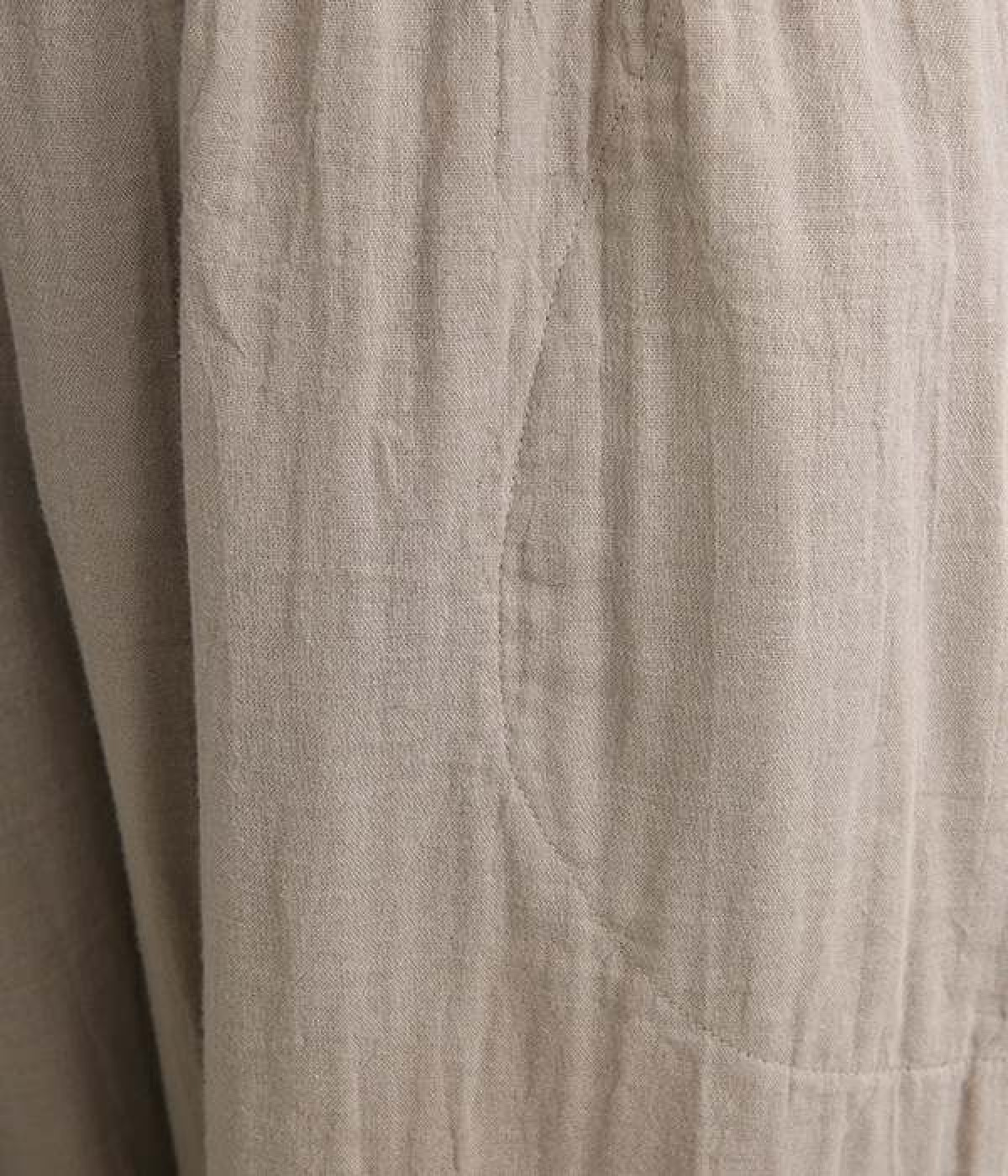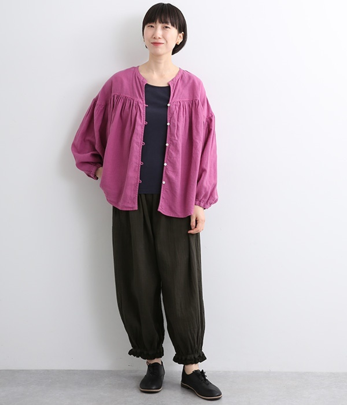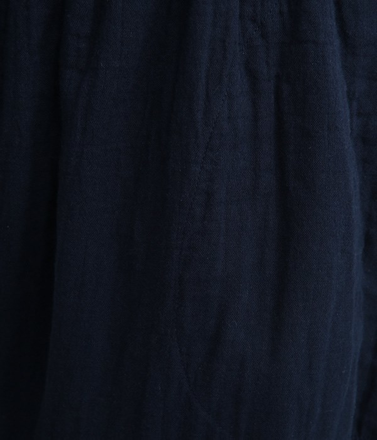 ふんわりとした肌あたりにやさしい表情が魅力的なコットンダブルガーゼで仕立てました。吸湿・速乾・通気性に優れた薄めの中厚手生地でロングシーズン活躍します。
