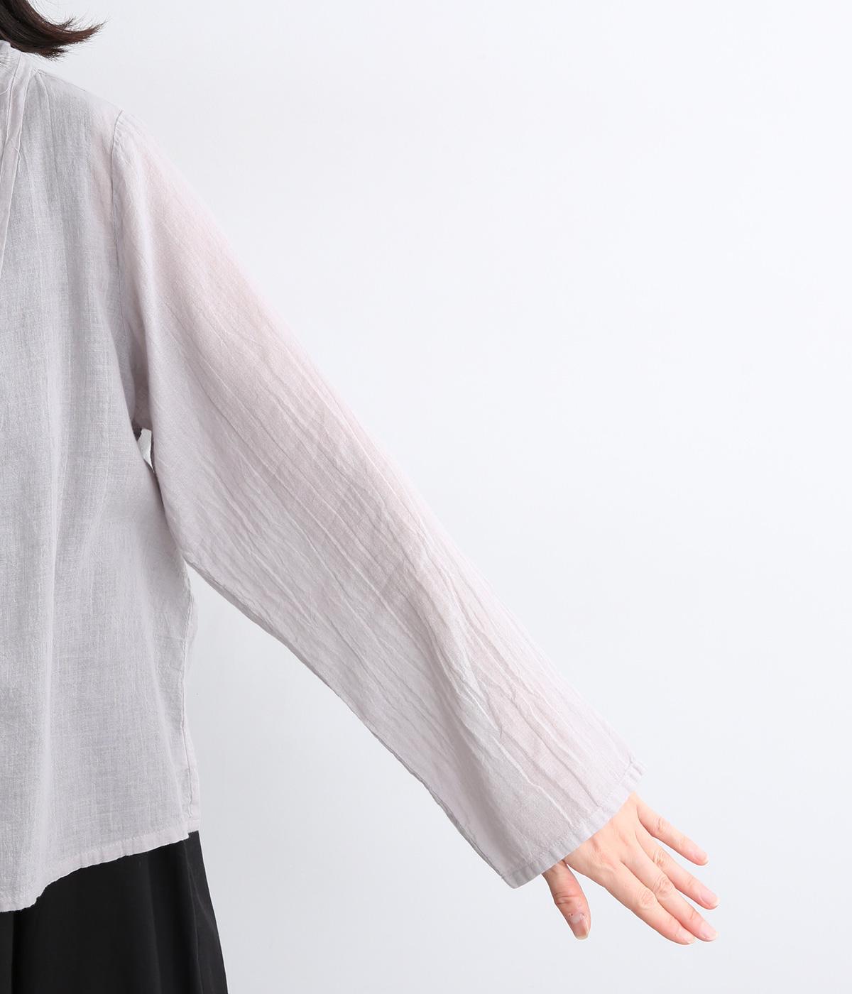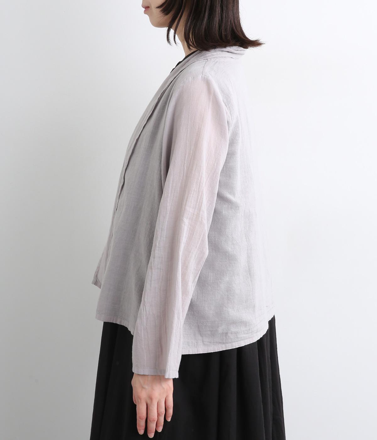 カーディガン感覚でさっとラフに羽織りやすいオープンタイプのブラウスです。襟元から前身頃中心に切り替えを入れて帯状に生地を足すことで、首後ろを少し隠して陽射しから守ったり、動きのあるデザインポイントにしました。シンプルで使い勝手も抜群です。