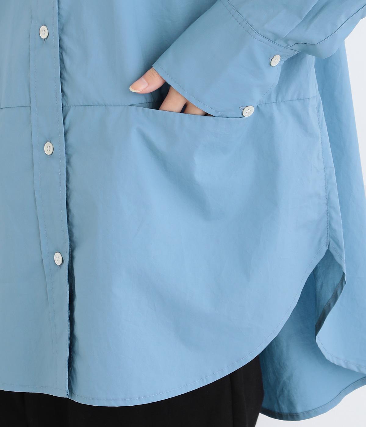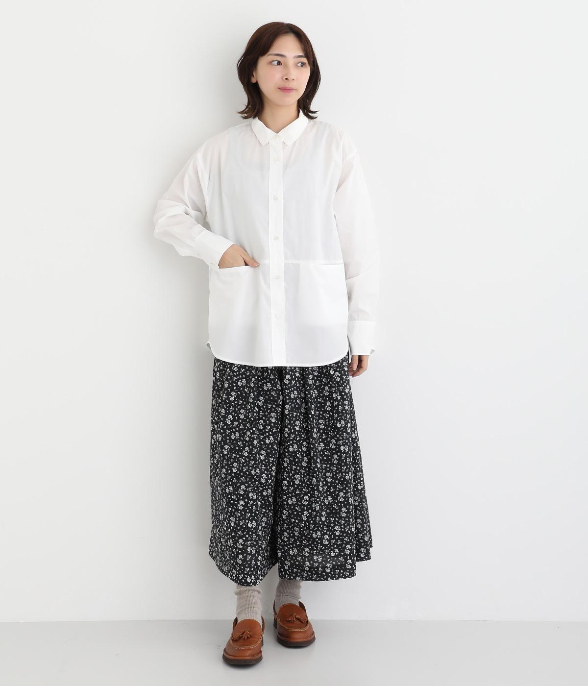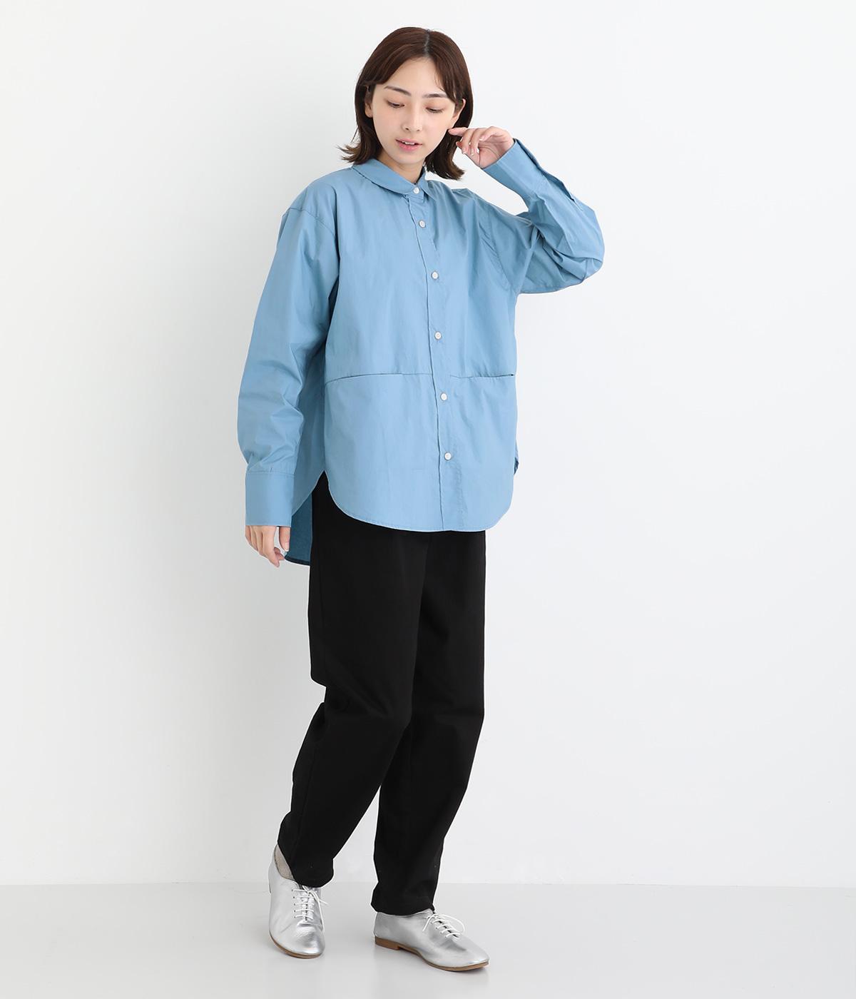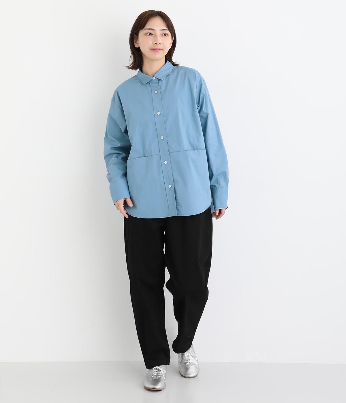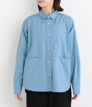 シャツのきちんと感はそのままに、身幅とアームホールを広めにとってリラクシーに仕上げました。フロントに切り替えを入れ、そこに沿うようにさりげなくポケットを配置。シルエットを間延びさせないアクセントになりつつ、実用性も◎です。