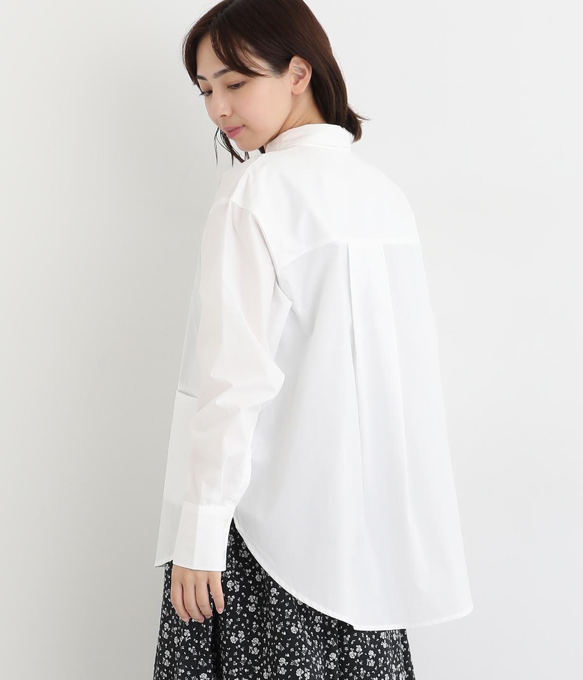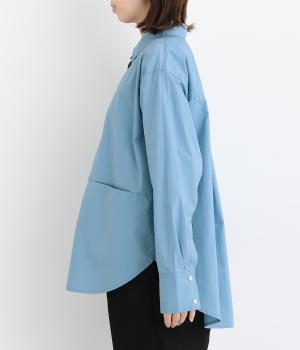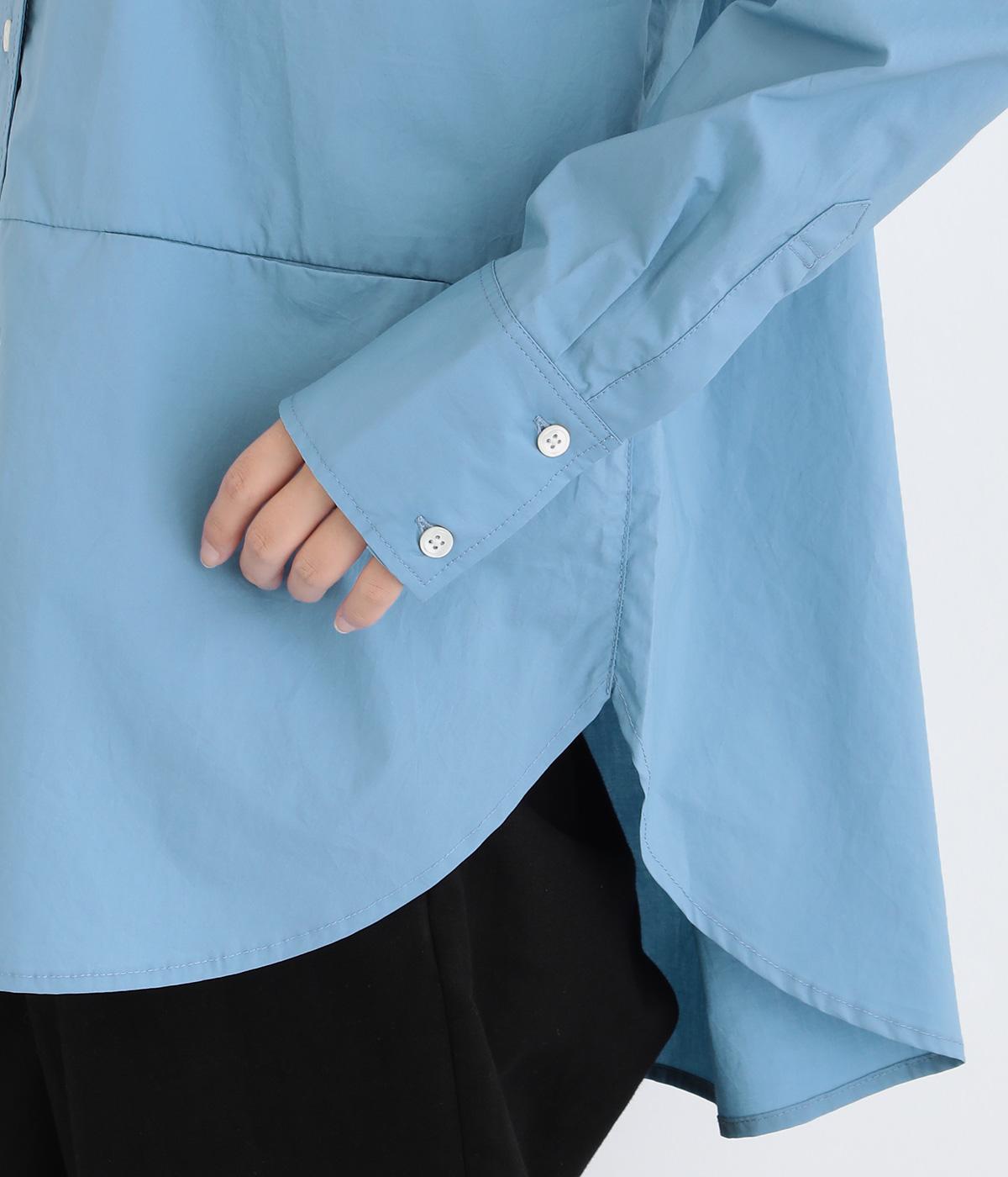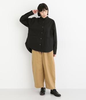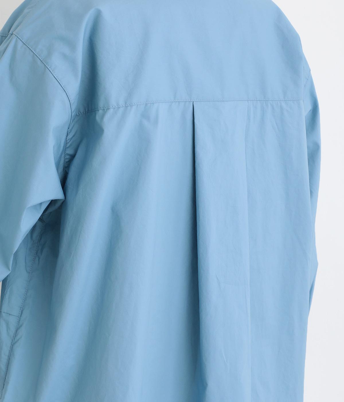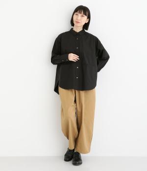シャツのきちんと感はそのままに、身幅とアームホールを広めにとってリラクシーに仕上げました。フロントに切り替えを入れ、そこに沿うようにさりげなくポケットを配置。シルエットを間延びさせないアクセントになりつつ、実用性も◎です。