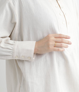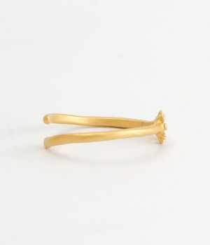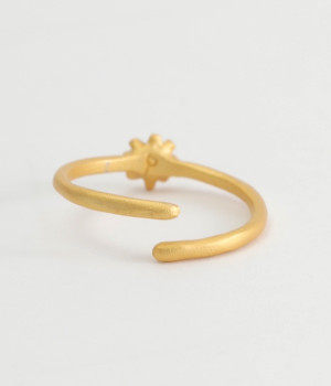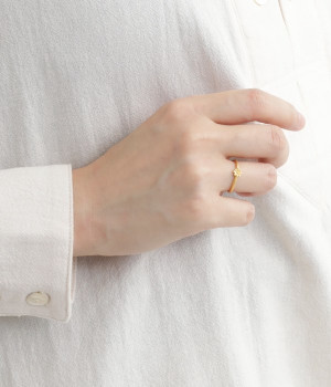 中央に花のモチーフをあしらい、大人かわいいデザインに仕上げたストッパーリング。ゆるいリングの上から重ね付けすることで、指から外れないように調整できる便利なアイテムです。モチーフは「恋占い」「真実の愛」「信頼」などの花言葉を持つ、マーガレットをイメージして作られました。単品でも、ファランジリングとして関節につけるのもおすすめです。マットな質感のゴールドカラーなので派手になりすぎず、大人の装いに品よくマッチします。
