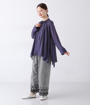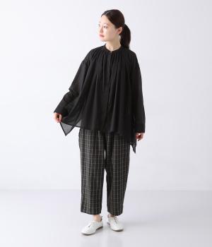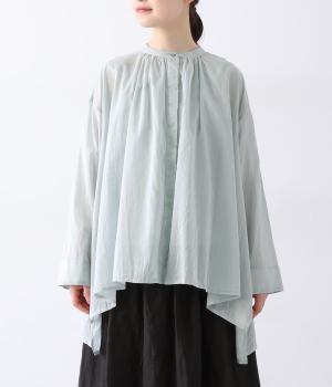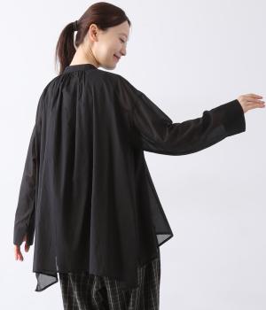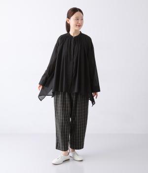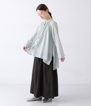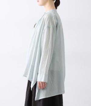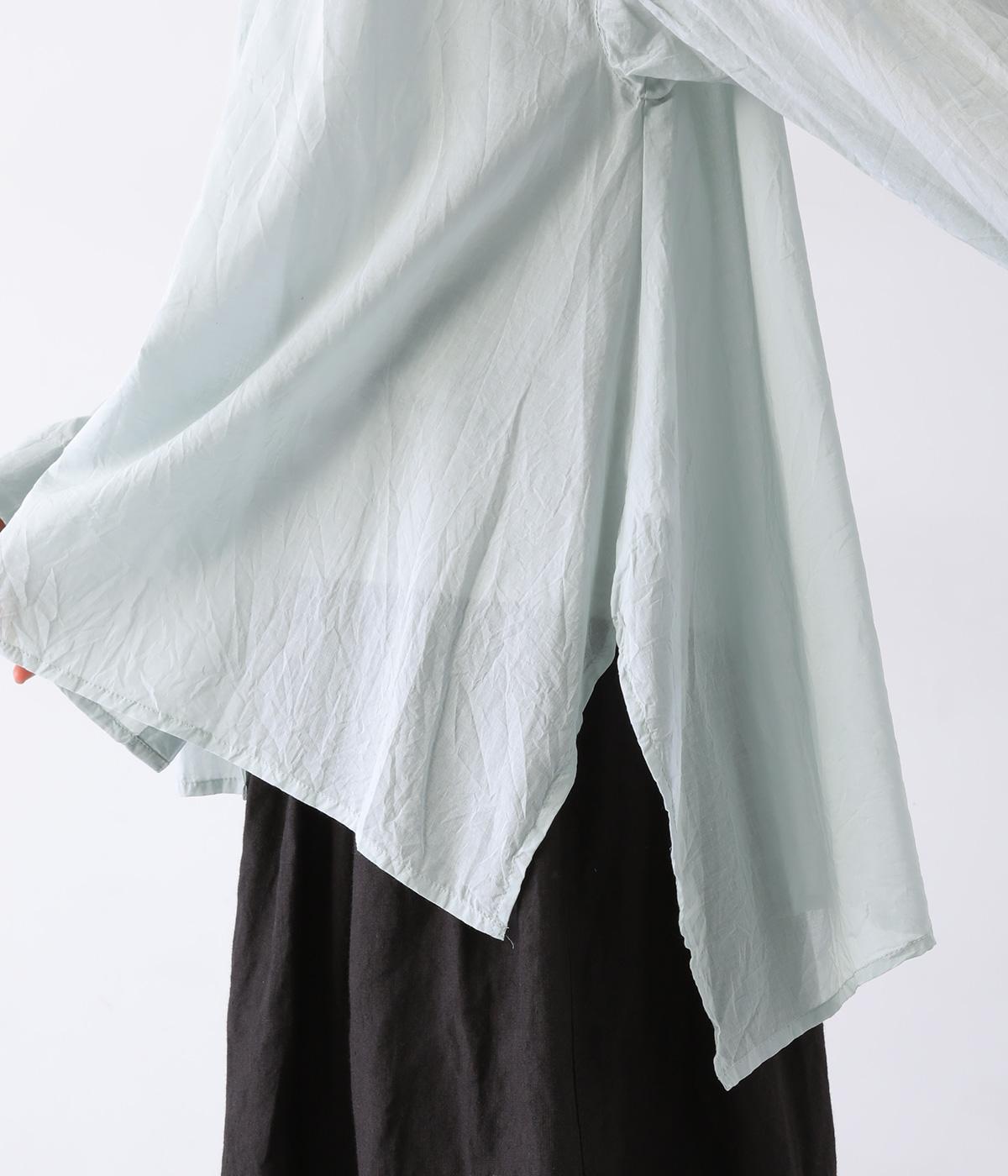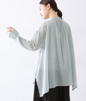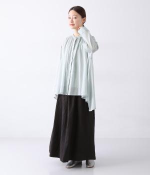 サイドを長くしたヘムラインで、ふわりと流れるようなシルエットを強調した優雅なブラウスです。着丈はボトムスとのバランスを取りやすいよう、前を短く設定。比翼仕立てでボタンを隠し、上品なムードを引き立てています。