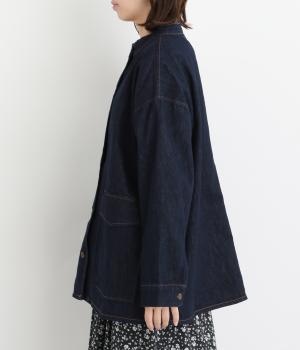 きれいなデニム生地にステッチが映える大人らしいジャケット。低めに立ち上がった襟が品の良さを添え、カジュアルに転びすぎないのが魅力です。ゆったりとした身幅とドロップショルダーでラフな羽織り心地に。大きめのフラップポケットもアクセントになっています。