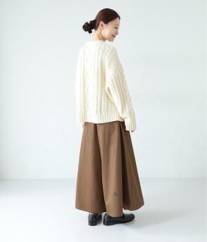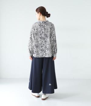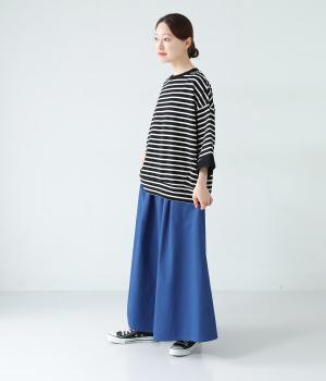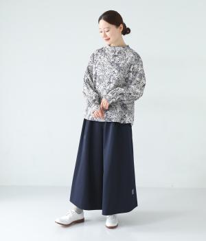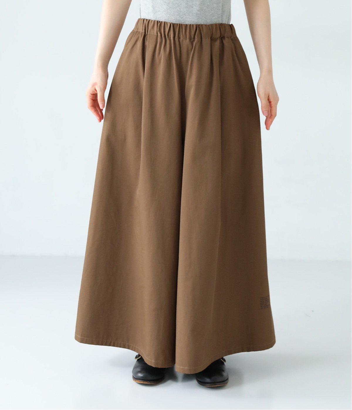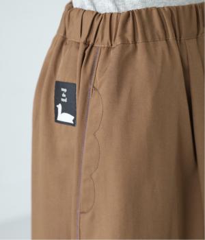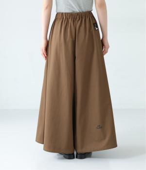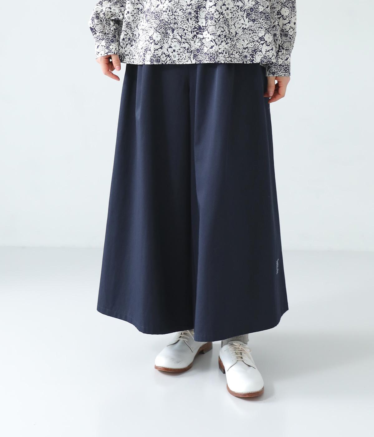 体のラインをカバーしつつ優雅な着こなしを叶えるフレアーシルエットのマキシパンツ。左裾にロゴを、右後ろ裾に文字プリントをあしらってアクセントにしています。さらにポケットのステッチや右後ろのスワンネームなど、細かなこだわりが詰まった一着。総ゴム仕様のウエストには内紐をプラスしています。