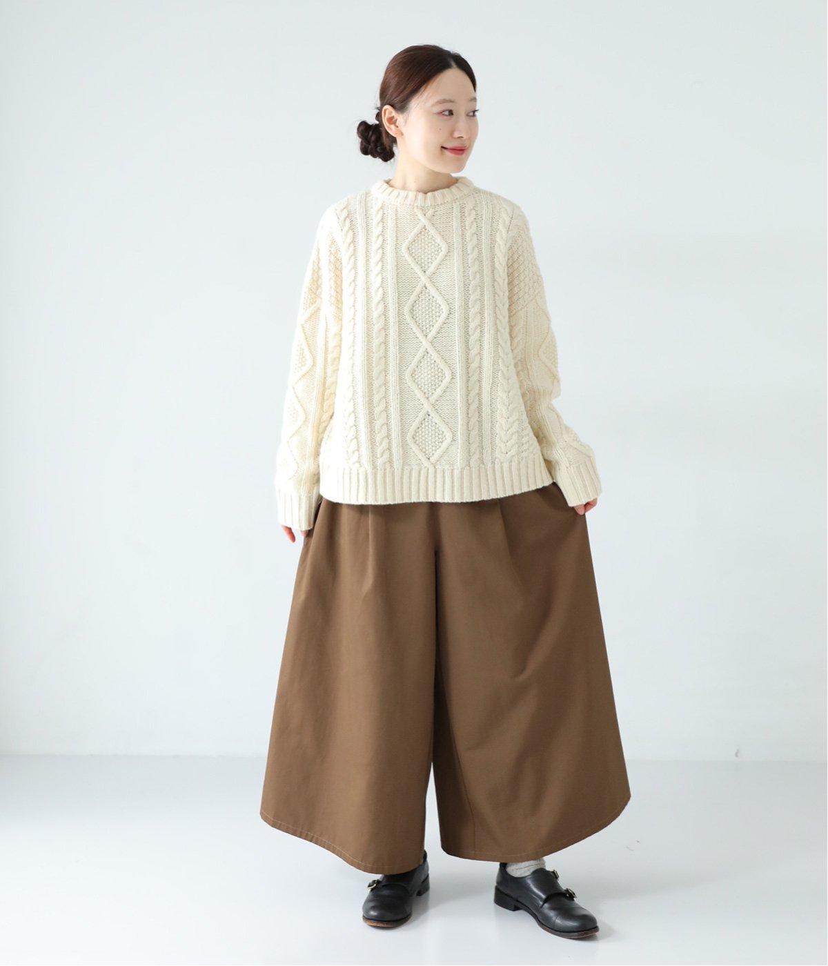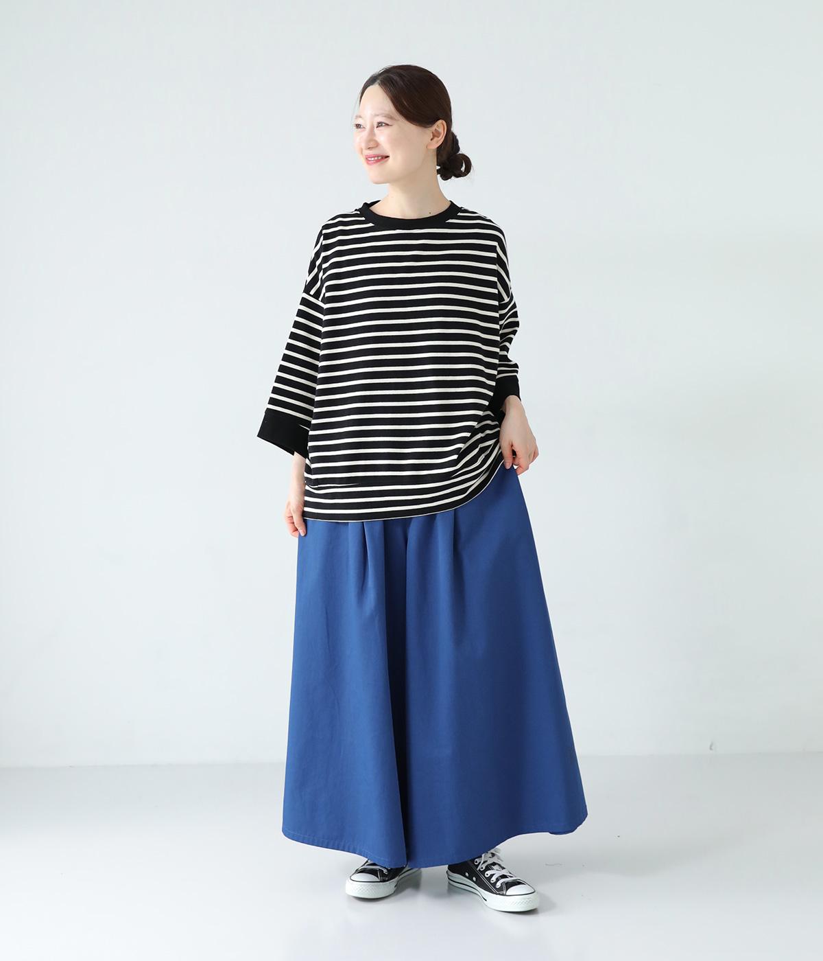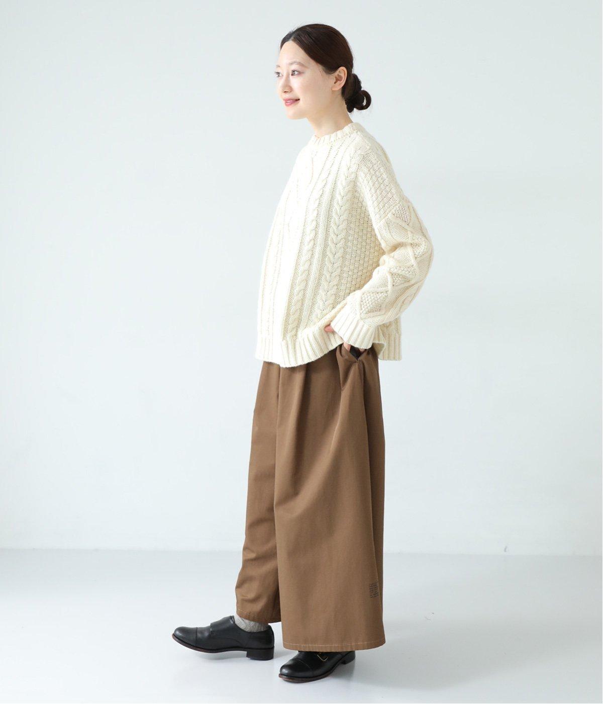 体のラインをカバーしつつ優雅な着こなしを叶えるフレアーシルエットのマキシパンツ。左裾にロゴを、右後ろ裾に文字プリントをあしらってアクセントにしています。さらにポケットのステッチや右後ろのスワンネームなど、細かなこだわりが詰まった一着。総ゴム仕様のウエストには内紐をプラスしています。