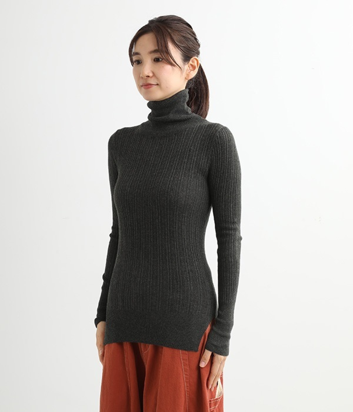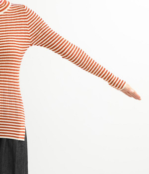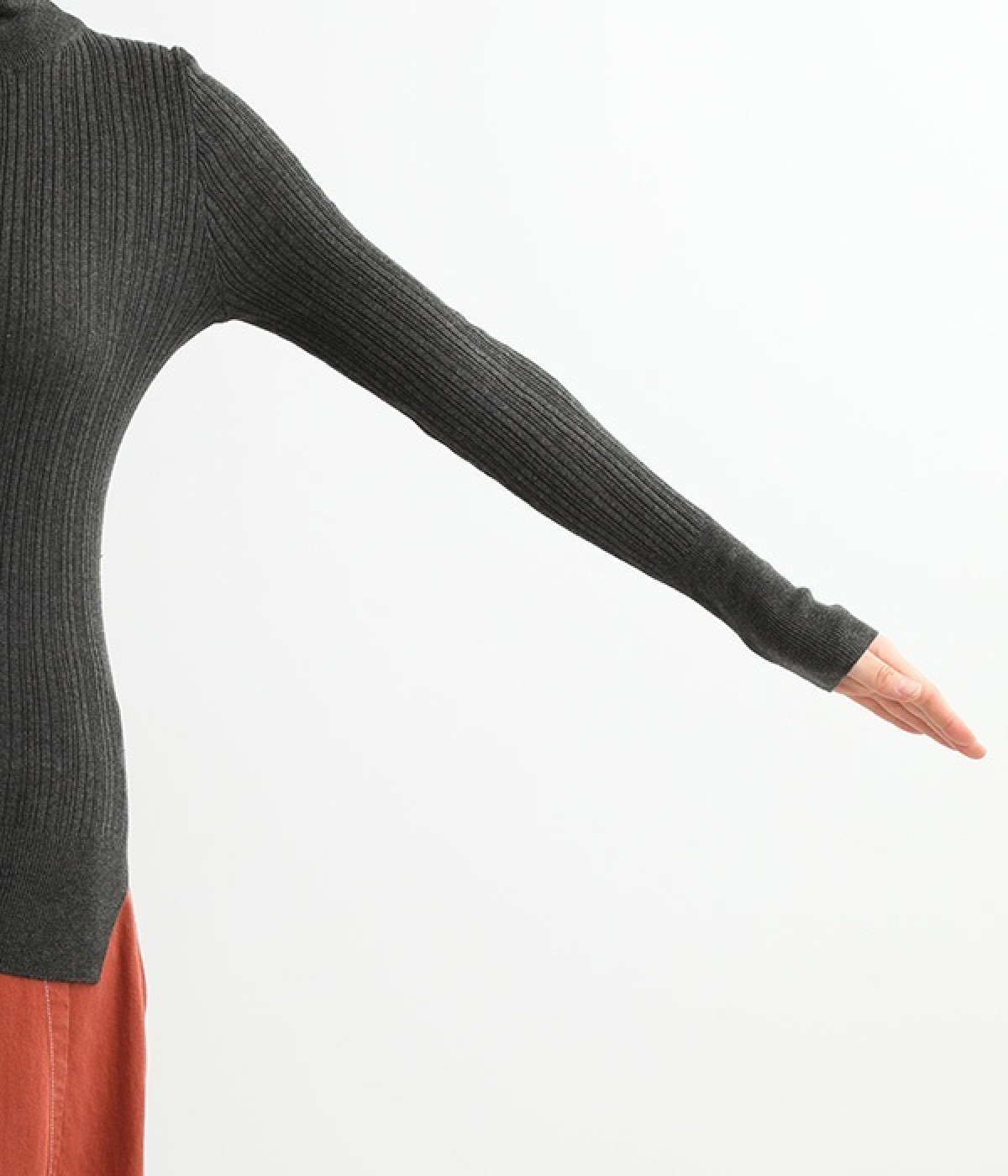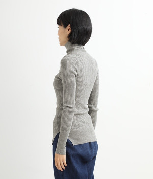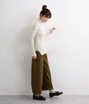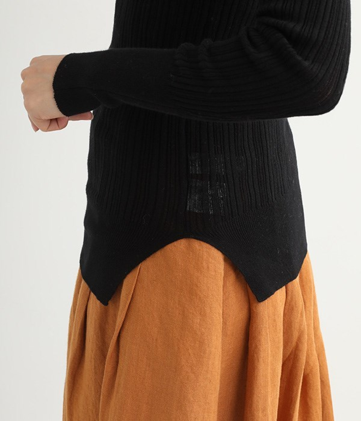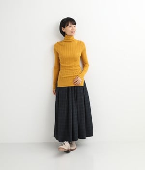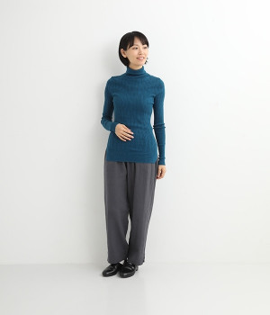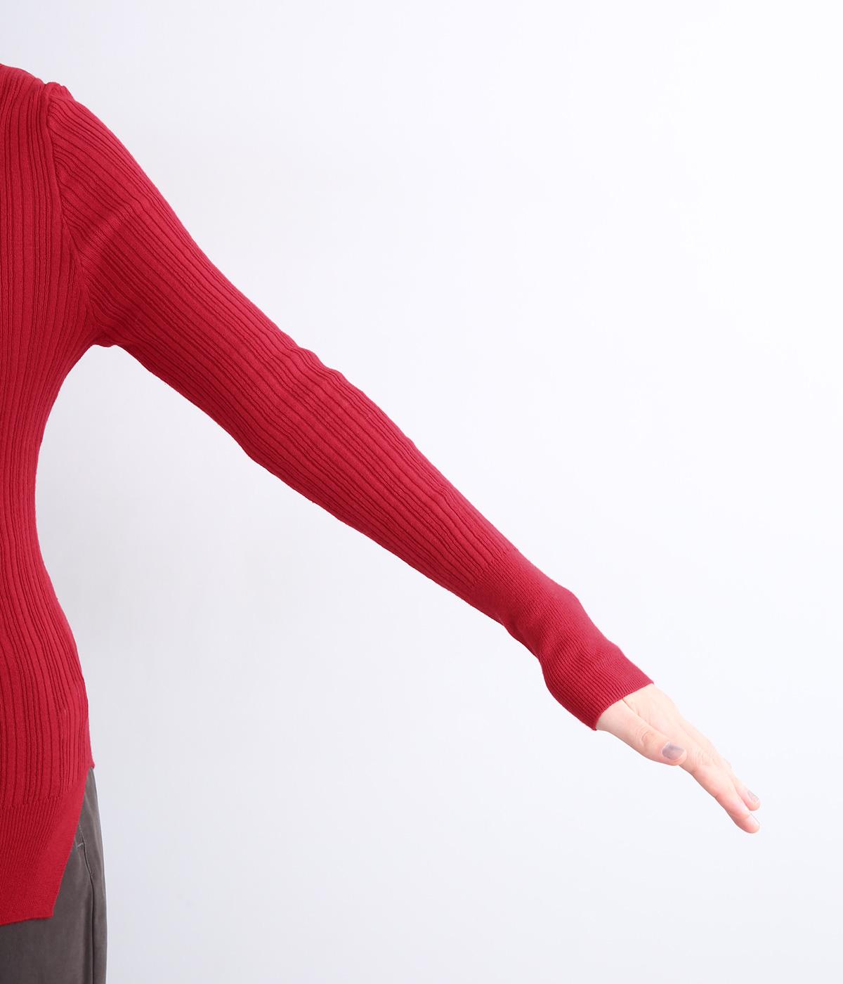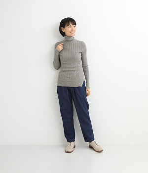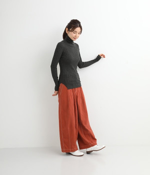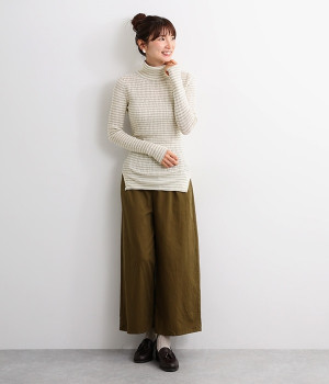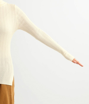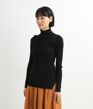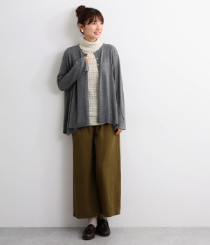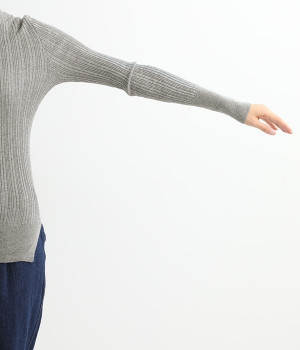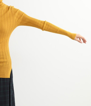 長めの袖と丈感で、一枚で着るのはもちろん、重ね着のインナーにも重宝します。首元や袖から差し色としてのぞかせるのにぴったりです。裾のスリットが動きやすさを出してくれ、心地よく着られます。