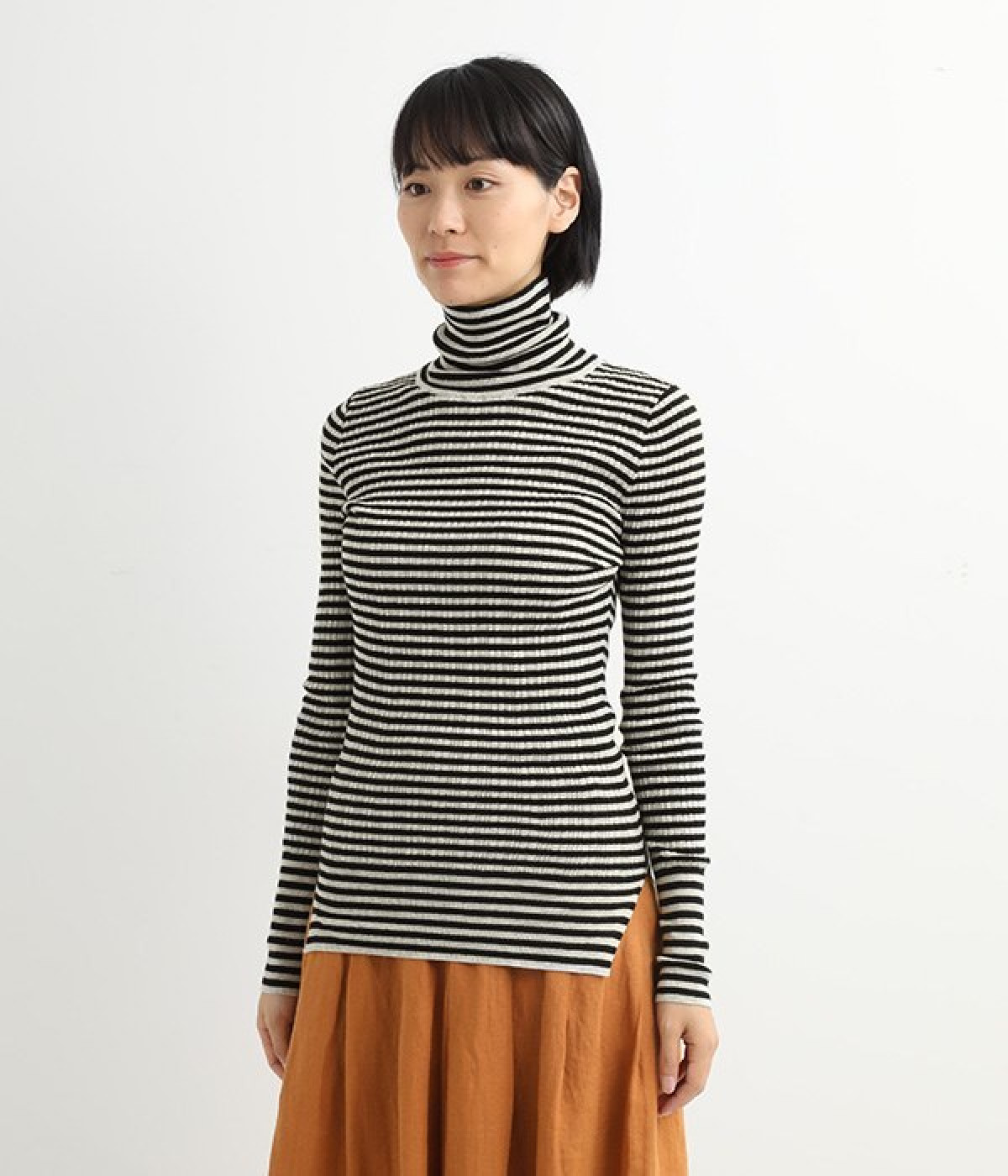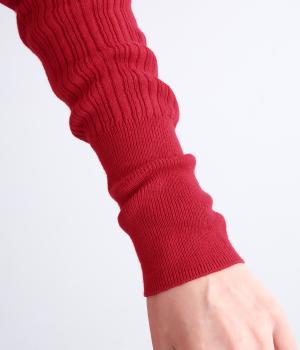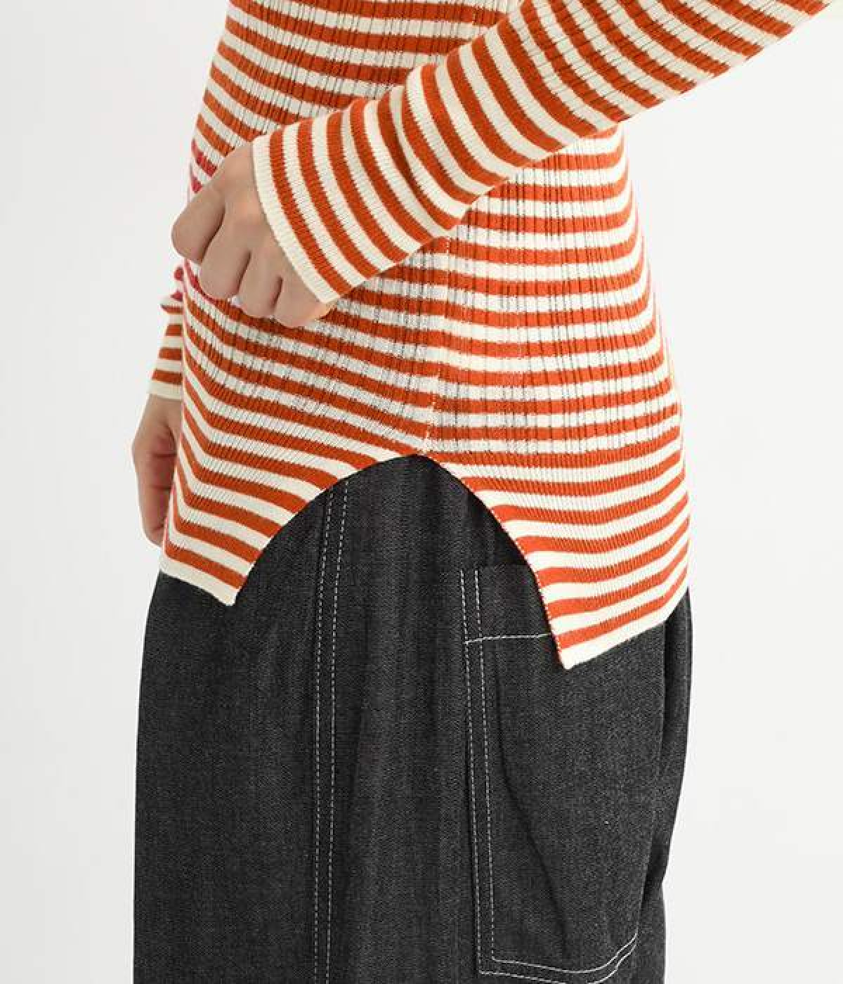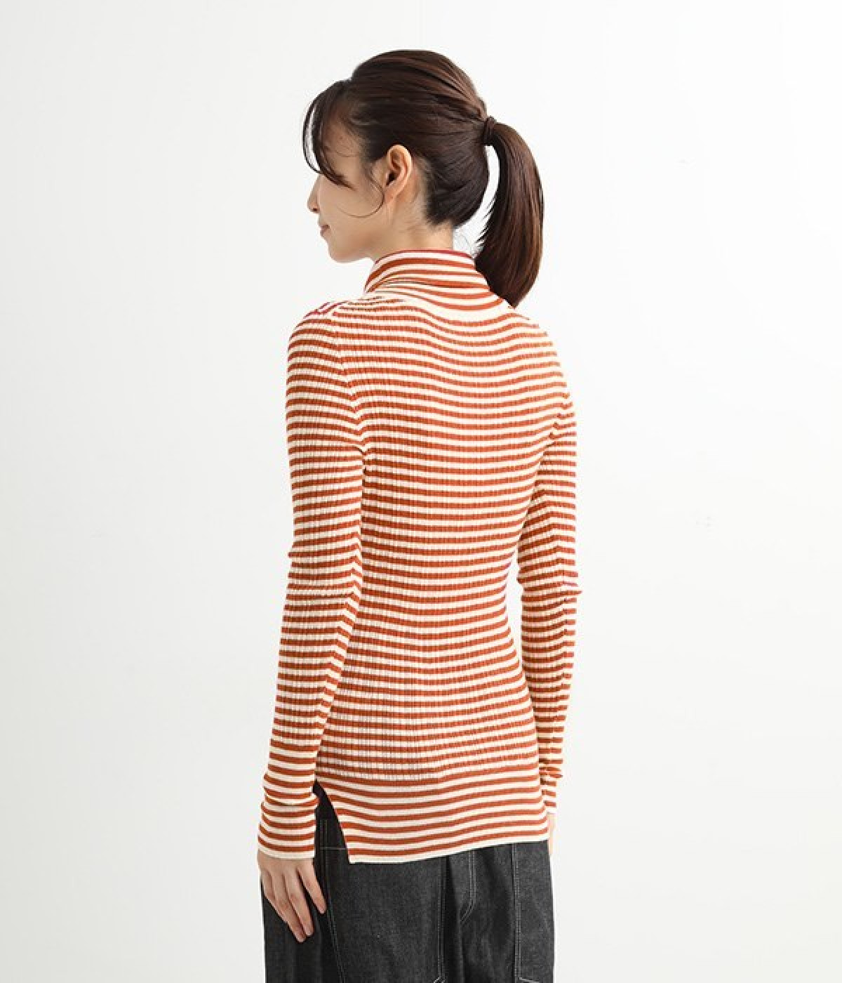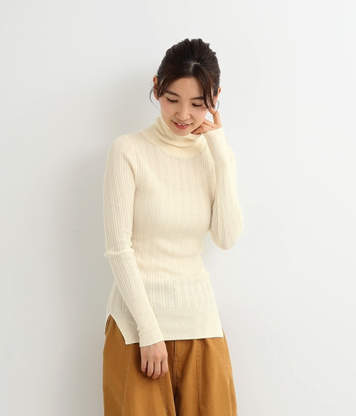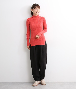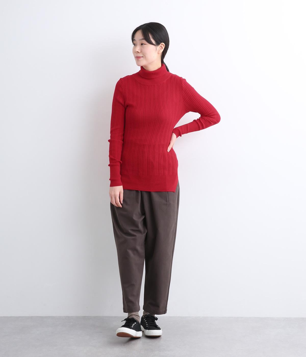 長めの袖と丈感で、一枚で着るのはもちろん、重ね着のインナーにも重宝します。首元や袖から差し色としてのぞかせるのにぴったりです。裾のスリットが動きやすさを出してくれ、心地よく着られます。