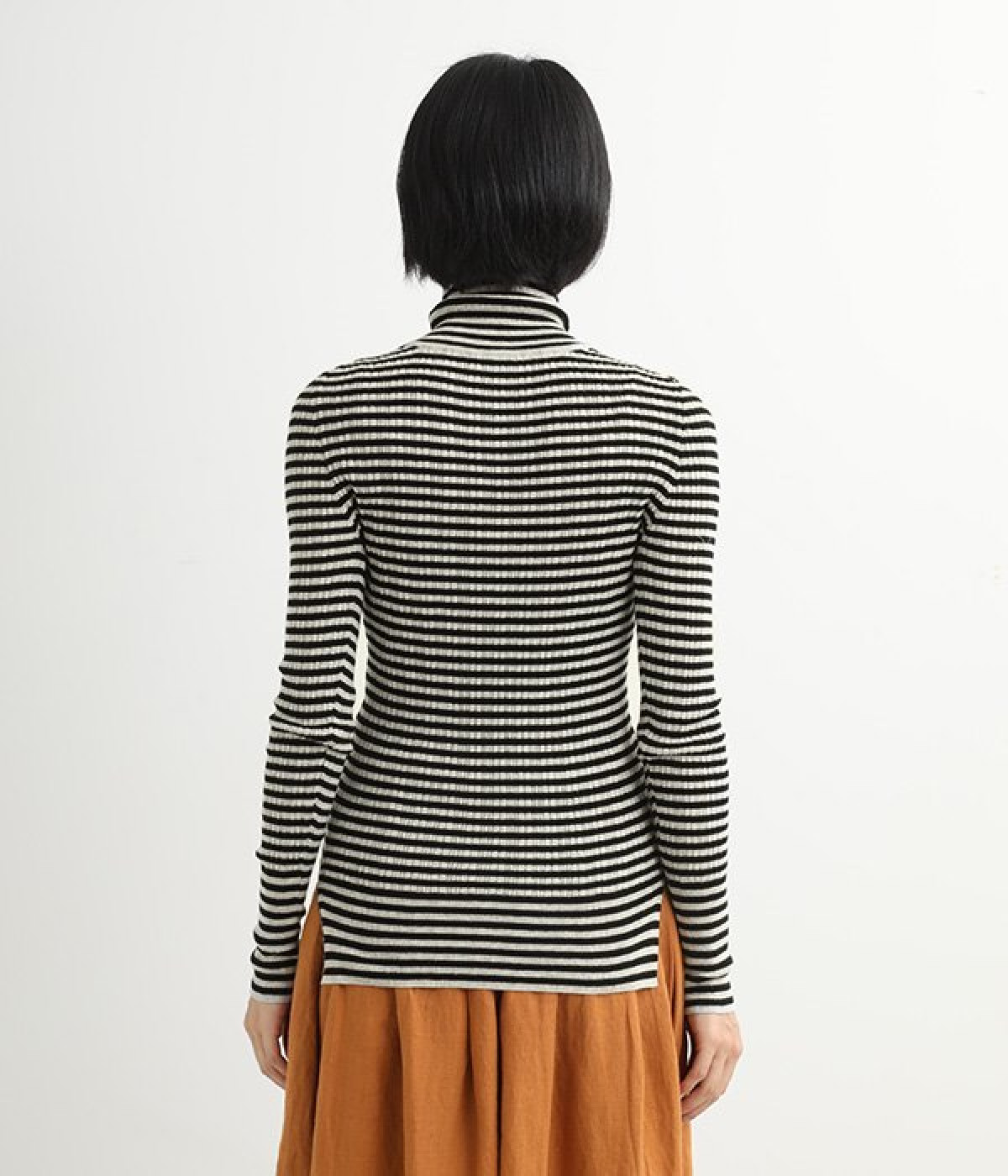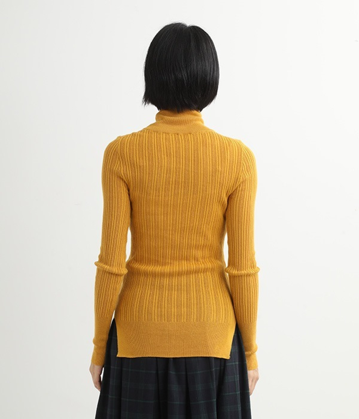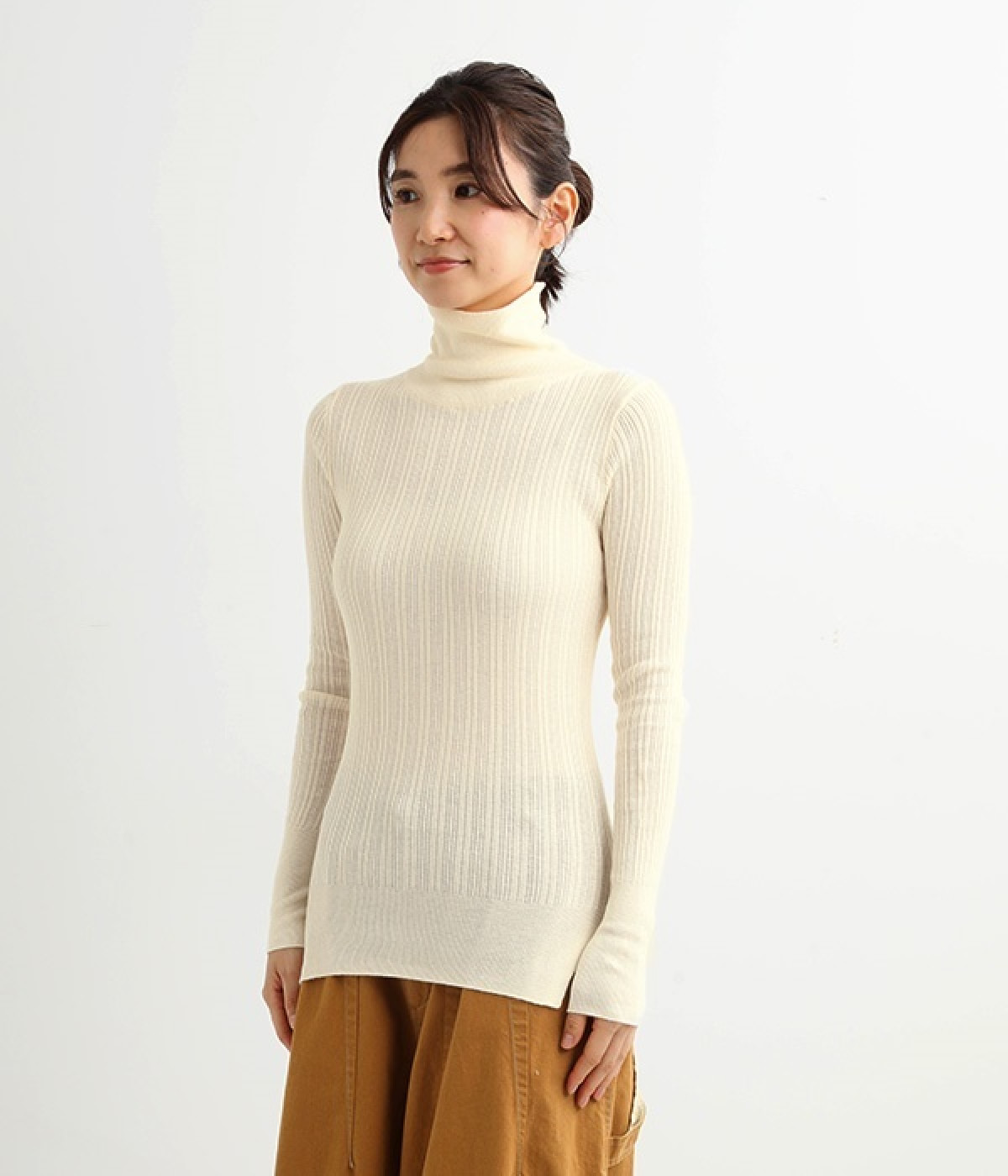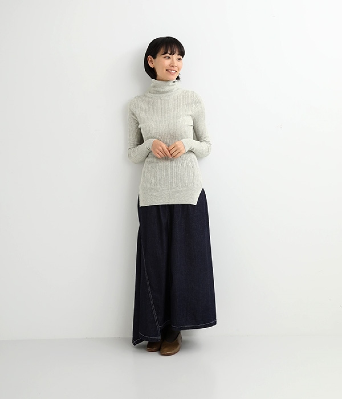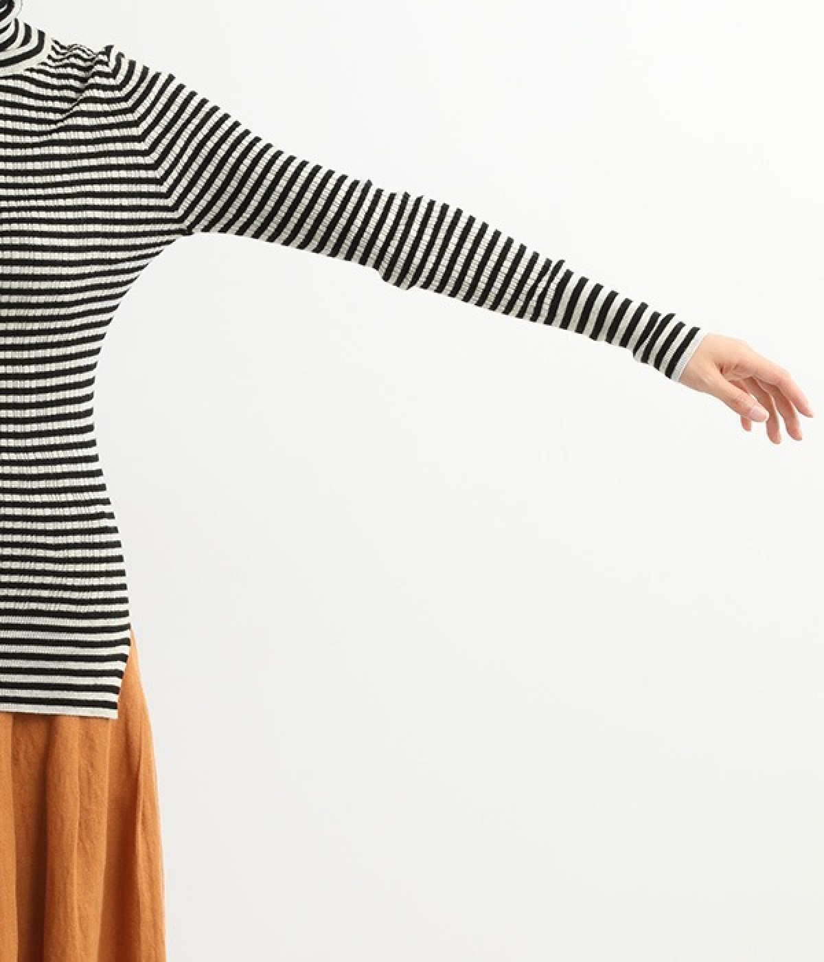長めの袖と丈感で、一枚で着るのはもちろん、重ね着のインナーにも重宝します。首元や袖から差し色としてのぞかせるのにぴったりです。裾のスリットが動きやすさを出してくれ、心地よく着られます。