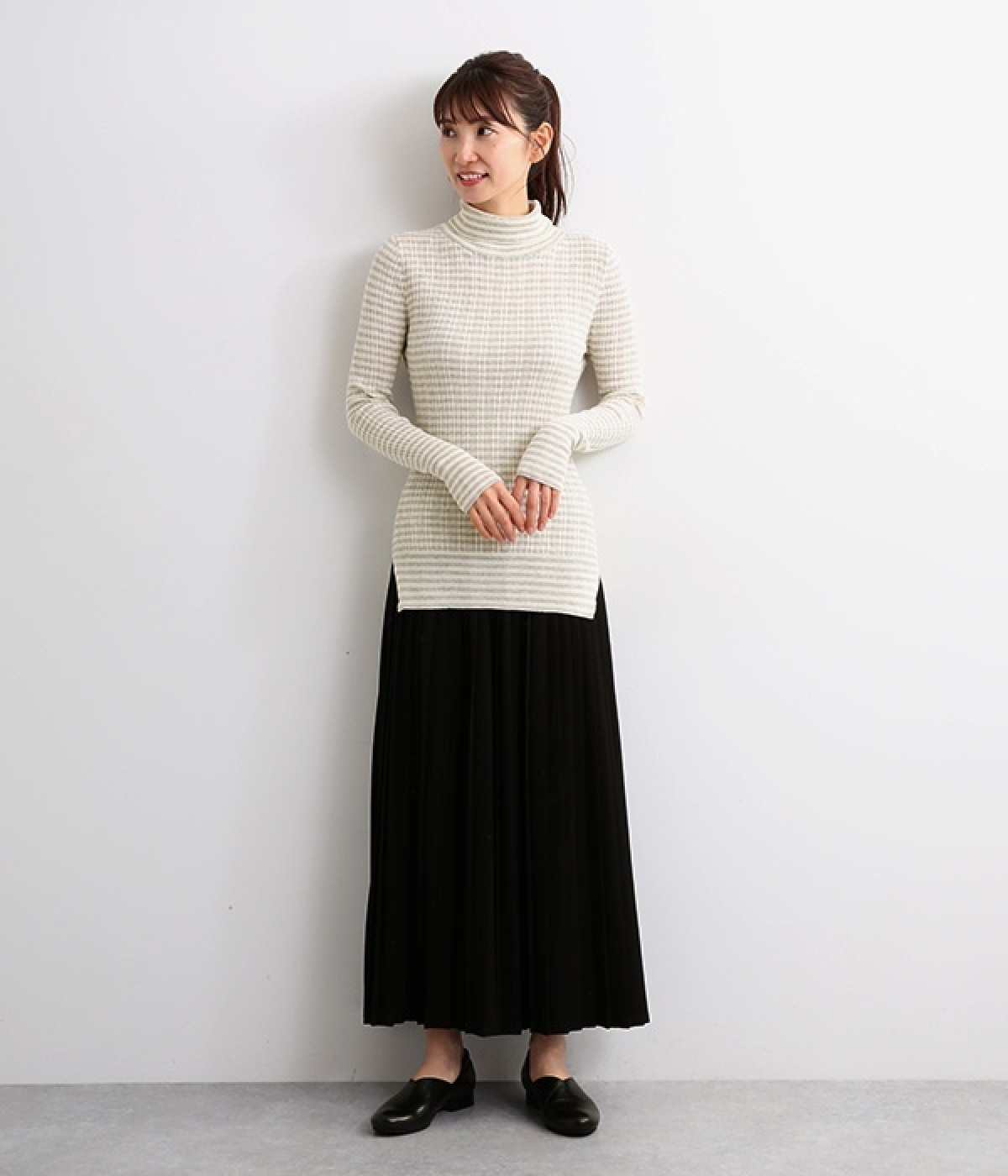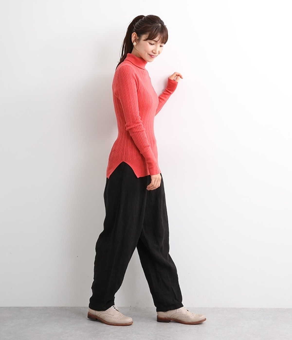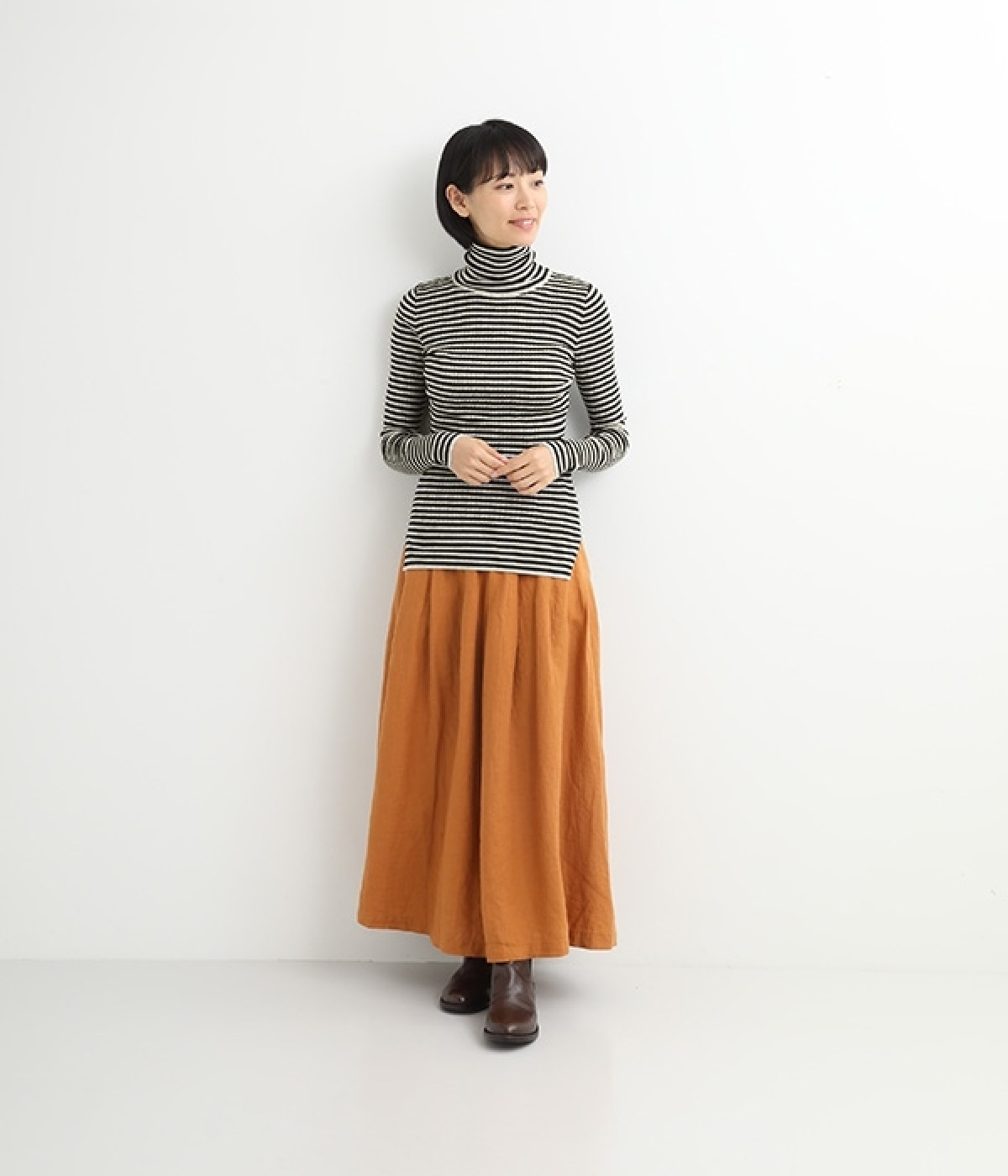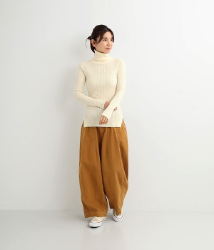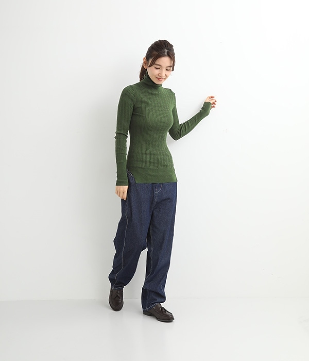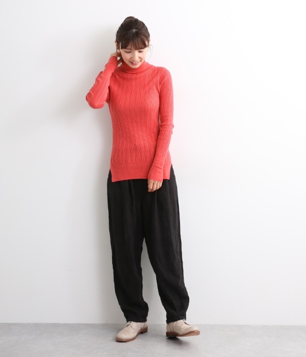 長めの袖と丈感で、一枚で着るのはもちろん、重ね着のインナーにも重宝します。首元や袖から差し色としてのぞかせるのにぴったりです。裾のスリットが動きやすさを出してくれ、心地よく着られます。