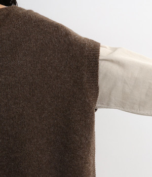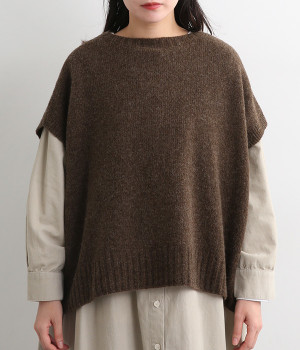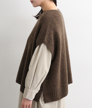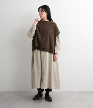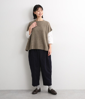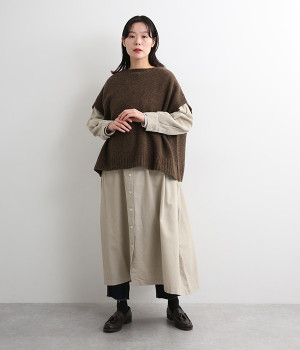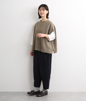 脇のガーター編みや裾のリブ使いが、着こなしにアクセントをプラス