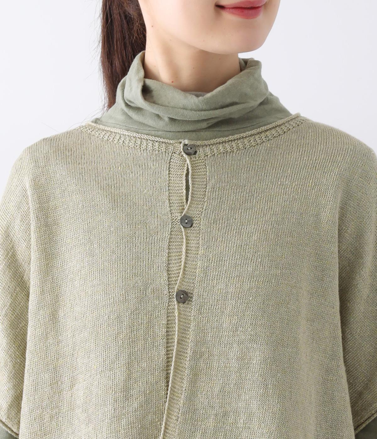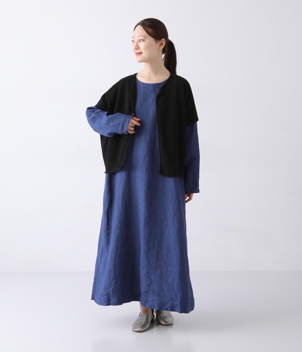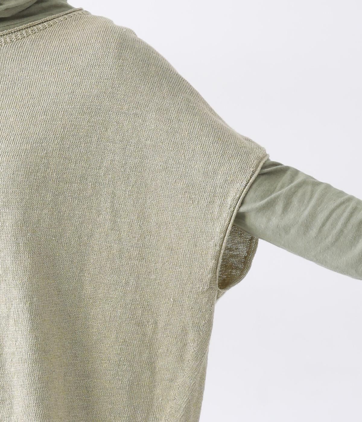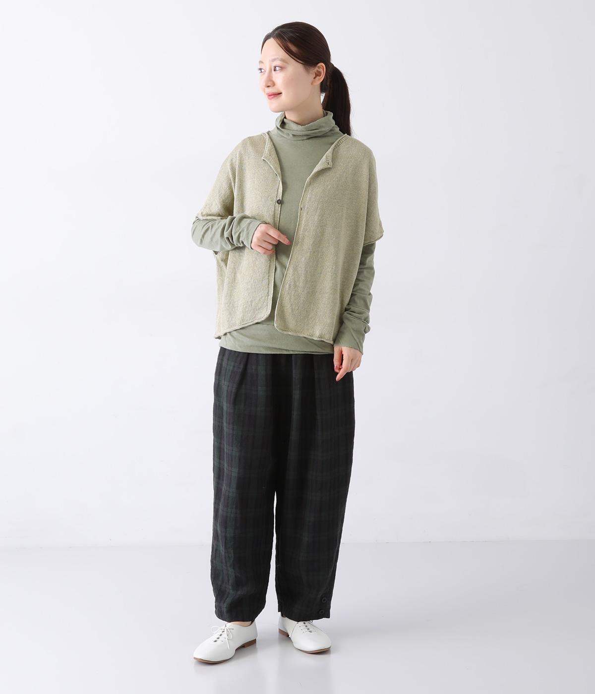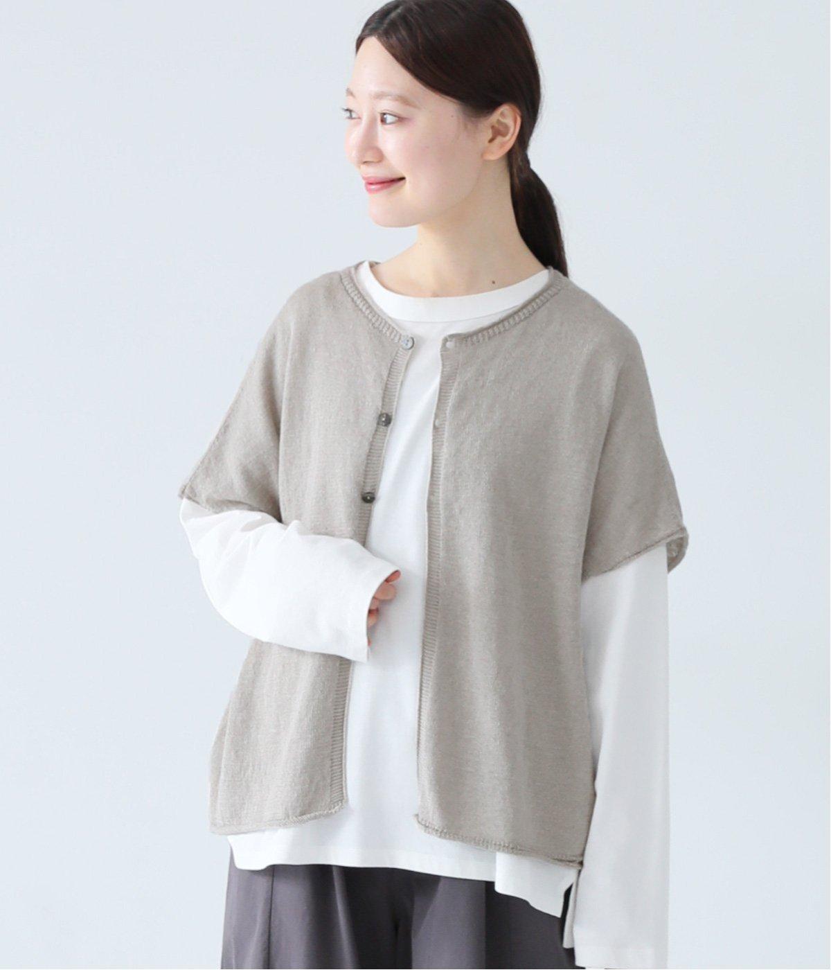 リネンならではのナチュラルな風合いを存分にたのしめるニット生地です。さらさらとした心地よい肌触りと清涼感たっぷりの見た目が特徴。薄手でやや透け感があり、レイヤードスタイルも軽やかに決まります。