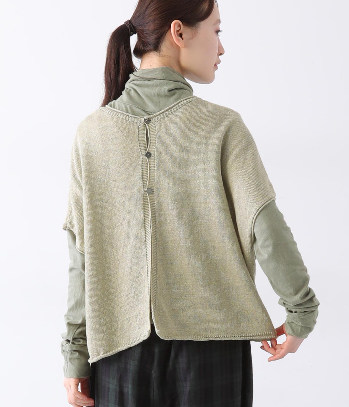 カーディガンとしても後ろ開きとしても着まわせる2way仕様のベストです。小さなボタンを3つのみ配して抜け感のある仕上がりに。裾などのくるりと丸まった編み端が愛らしいポイントです。ゆったりとしたドロップショルダーでインナーを合わせやすく、着こなしの幅が広がります。