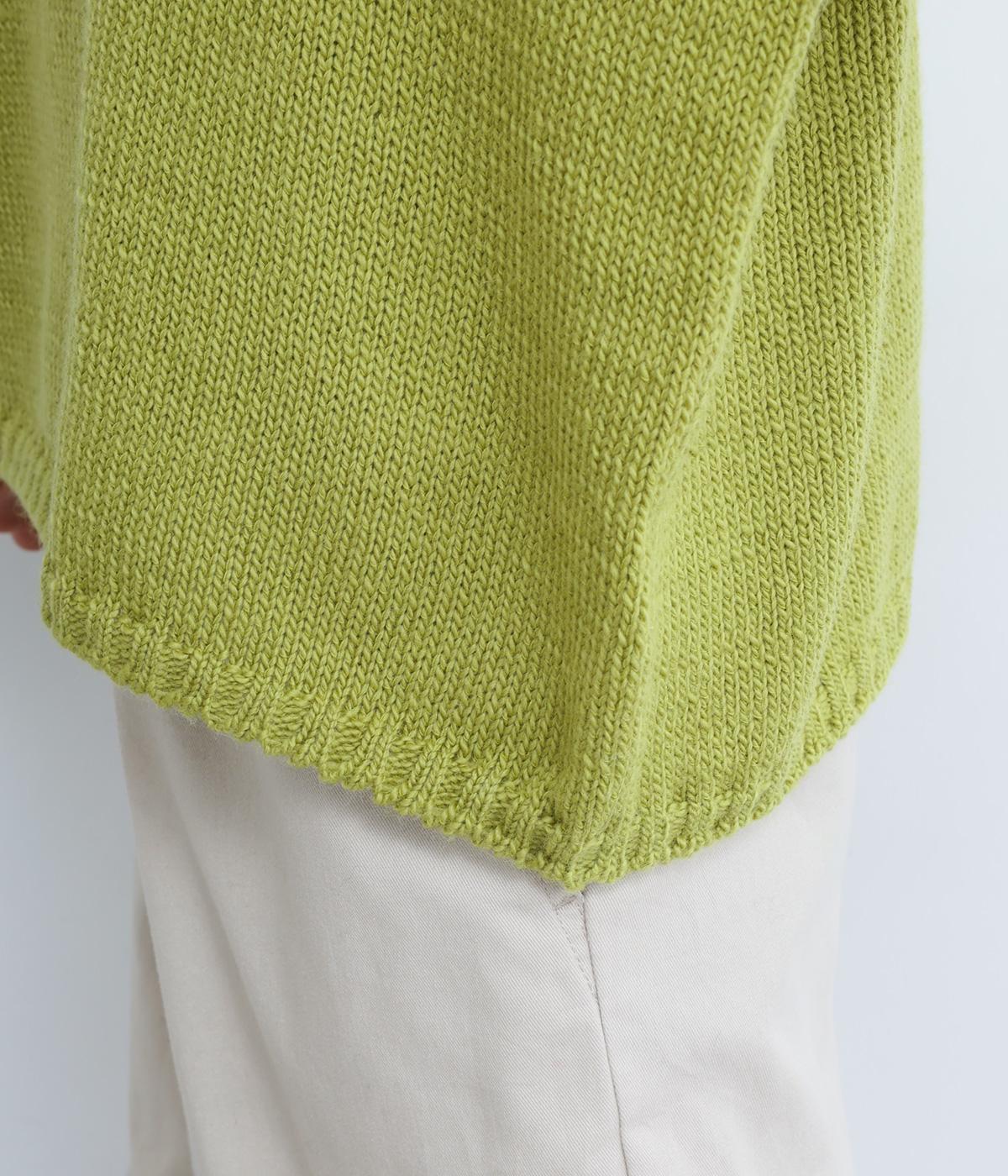 甘く撚ったロービングウールをざっくり編み上げ、ふわりと空気をふくんだような軽やかな生地に仕上げました。やわらかな風合いで、肌に触れたときの心地よさも魅力。伸縮性があり、フィット感もばつぐんです。