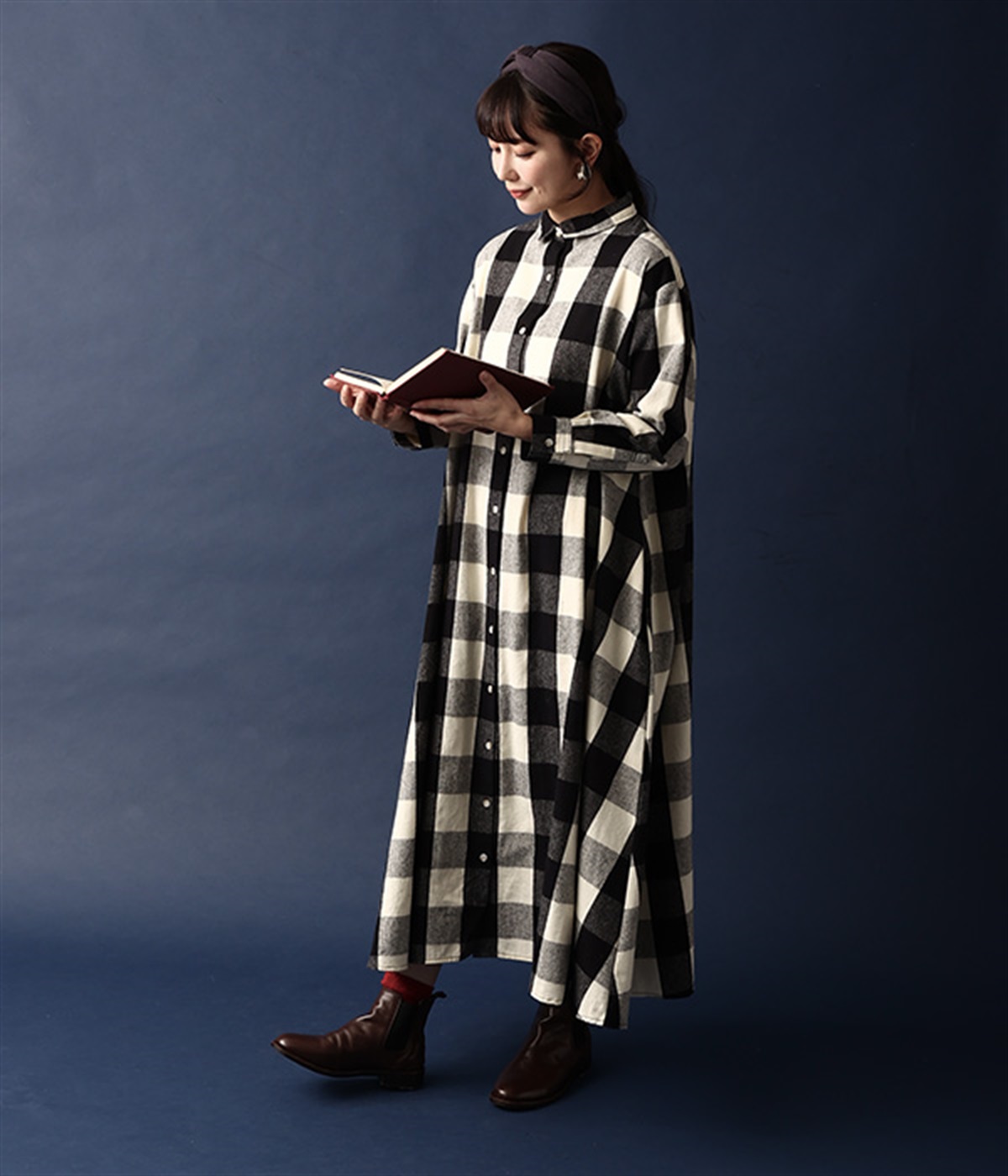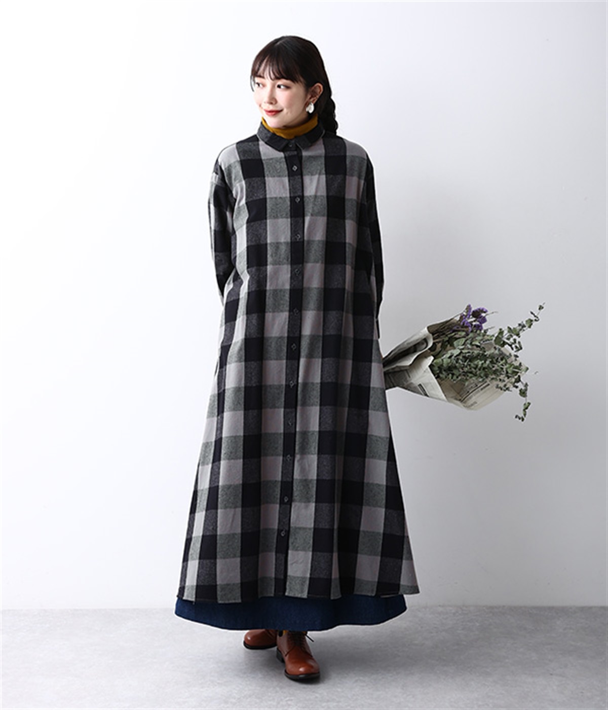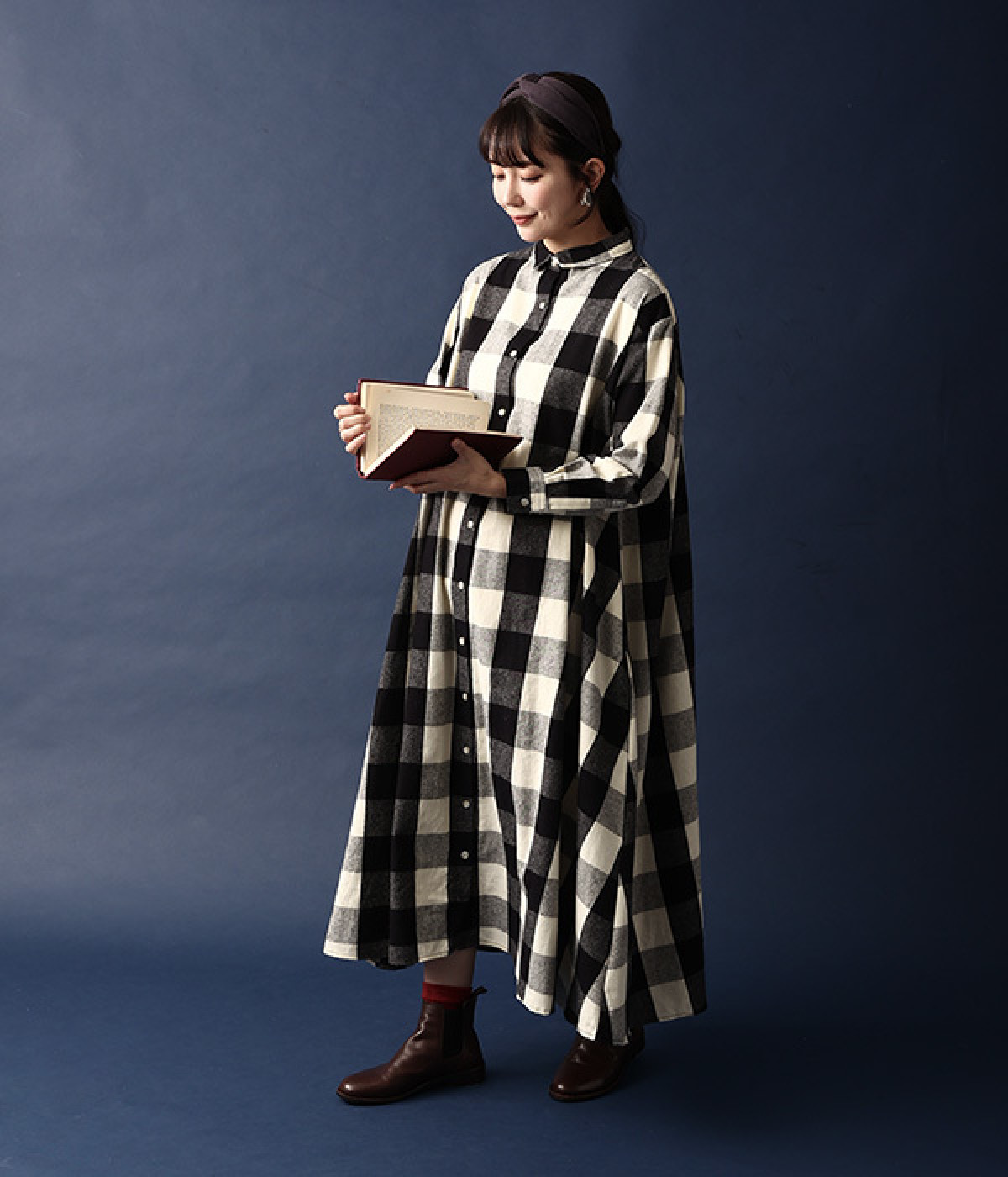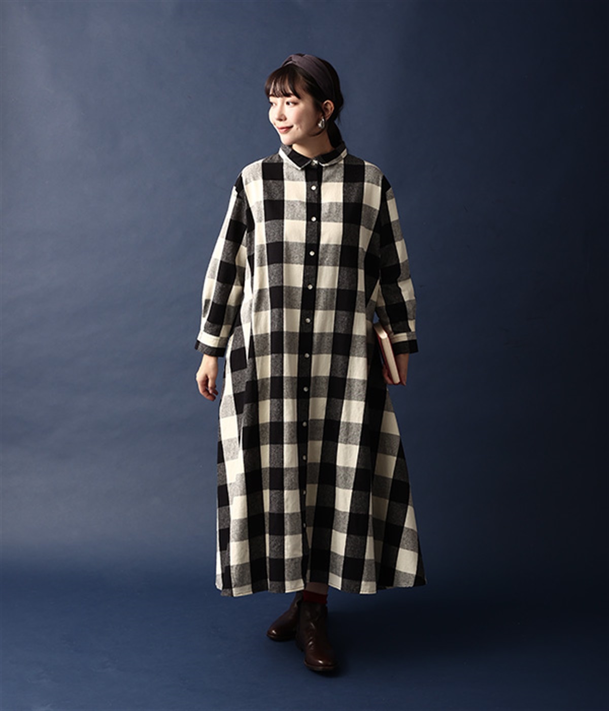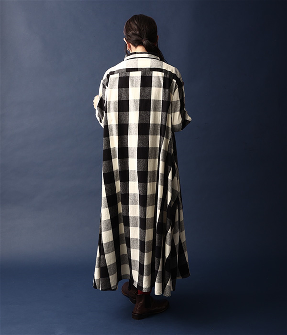 あたたかみのある優しい肌触りの綿ビエラ生地で仕立てたチェック柄シャツワンピース。生地をたっぷりと使用することで落ち感が出る、優雅なシルエットが魅力です。一枚ではもちろん、前ボタンをあけてパンツスタイルにコート感覚で合わせるのもおすすめ。大柄チェックの分量をおさえた重ね着をすると、また違った印象で着こなせます。