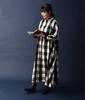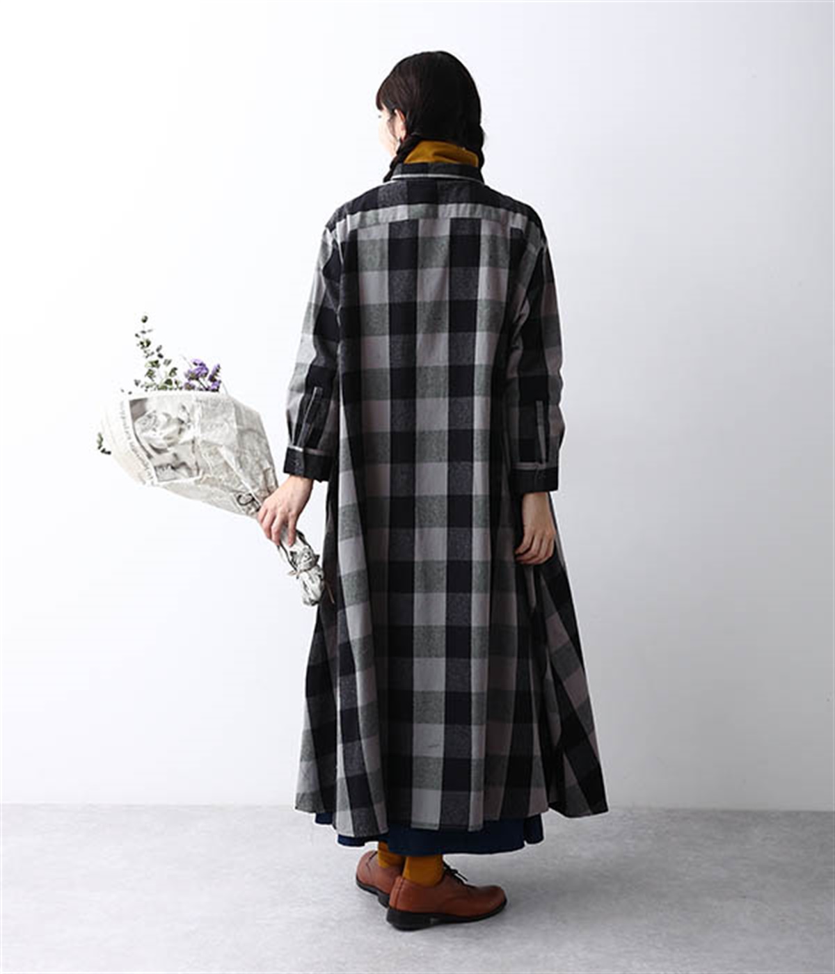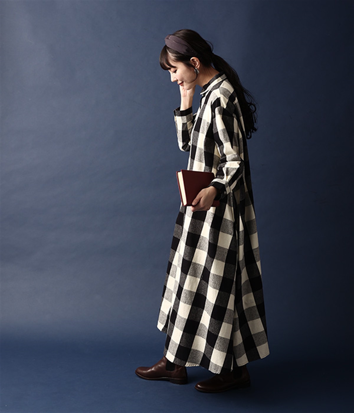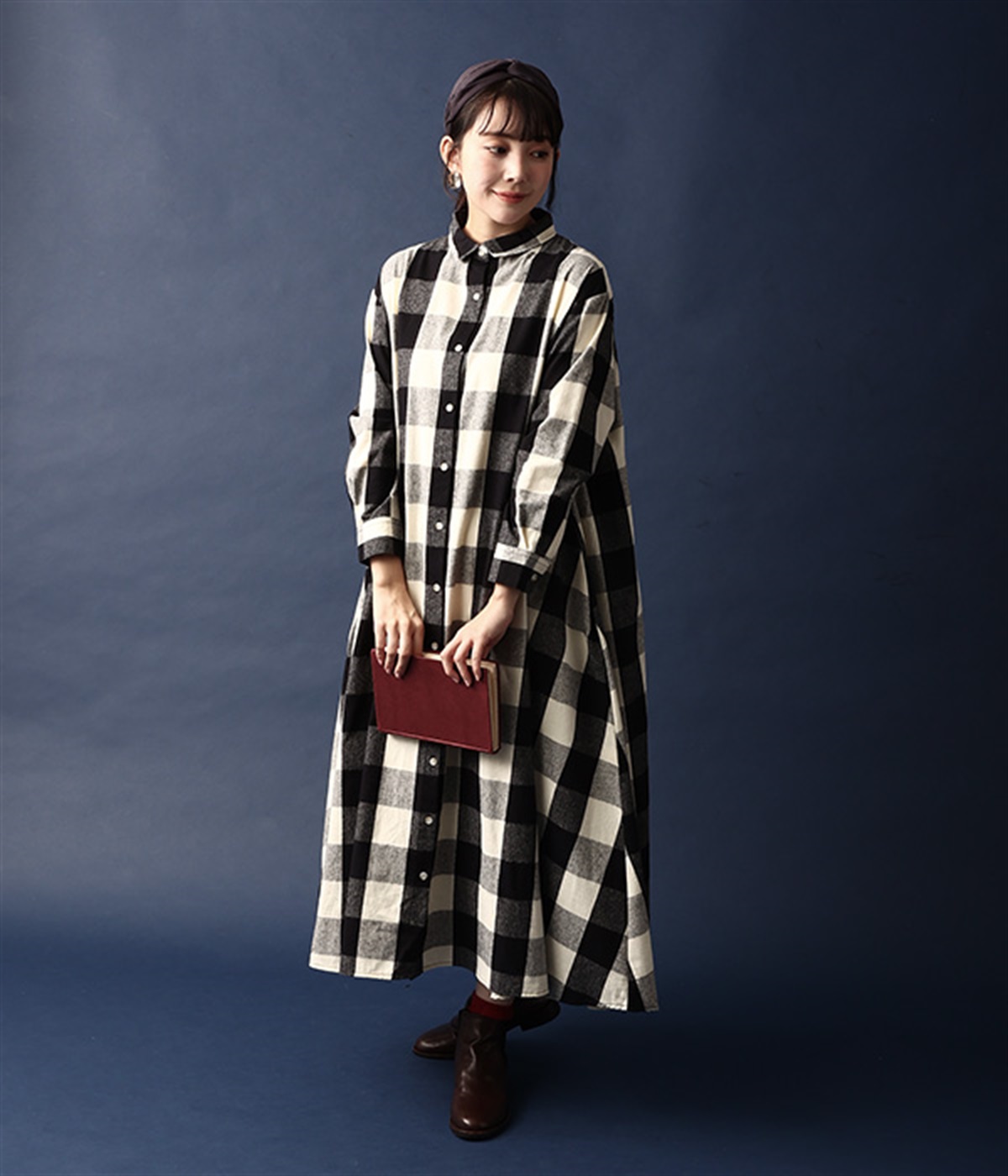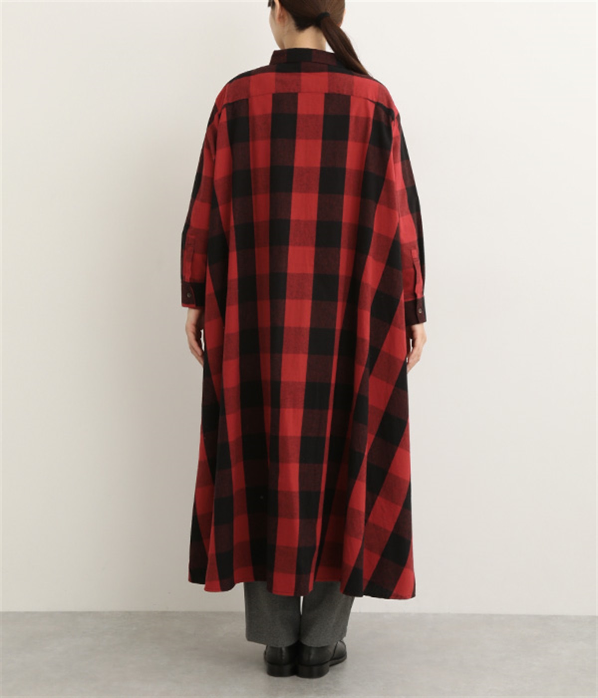 あたたかみのある優しい肌触りの綿ビエラ生地で仕立てたチェック柄シャツワンピース。生地をたっぷりと使用することで落ち感が出る、優雅なシルエットが魅力です。一枚ではもちろん、前ボタンをあけてパンツスタイルにコート感覚で合わせるのもおすすめ。大柄チェックの分量をおさえた重ね着をすると、また違った印象で着こなせます。