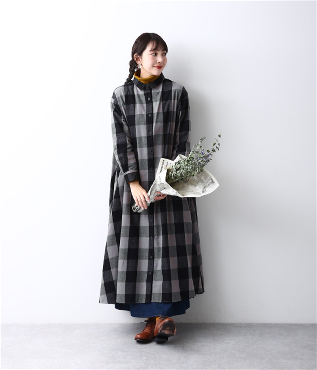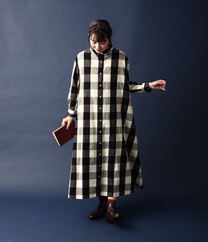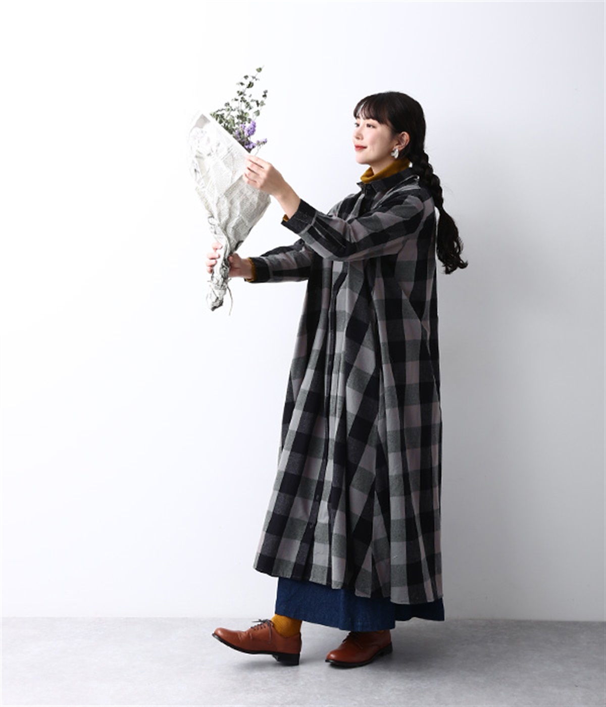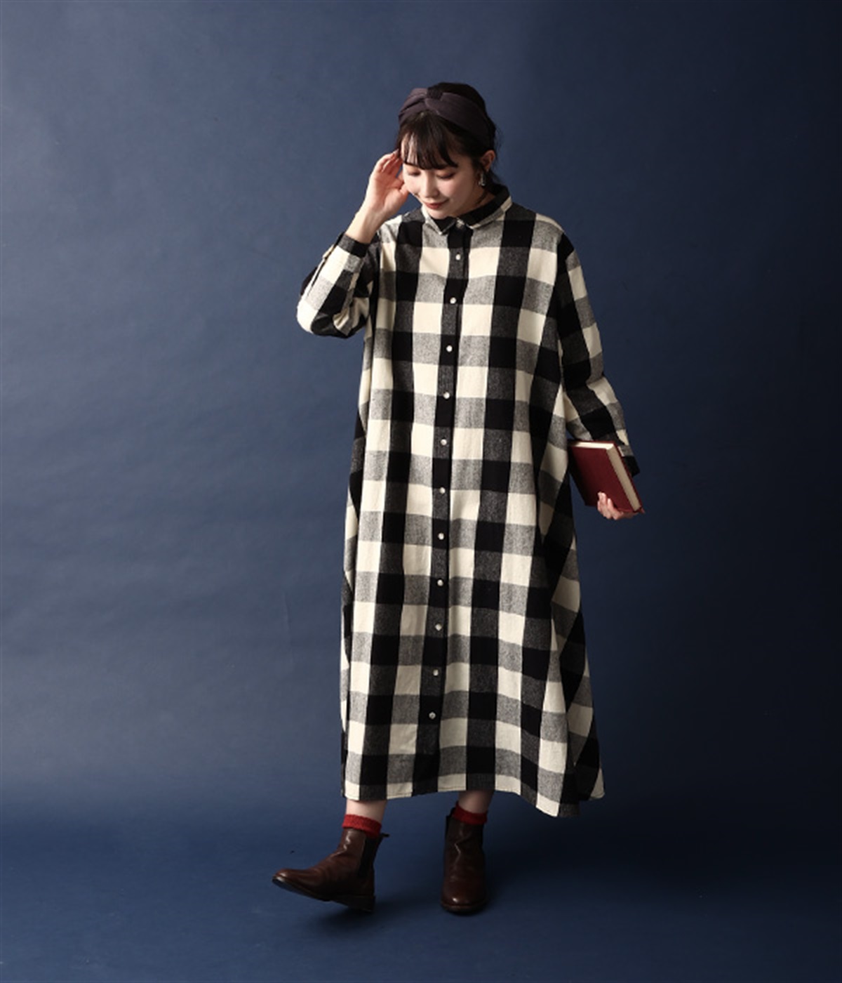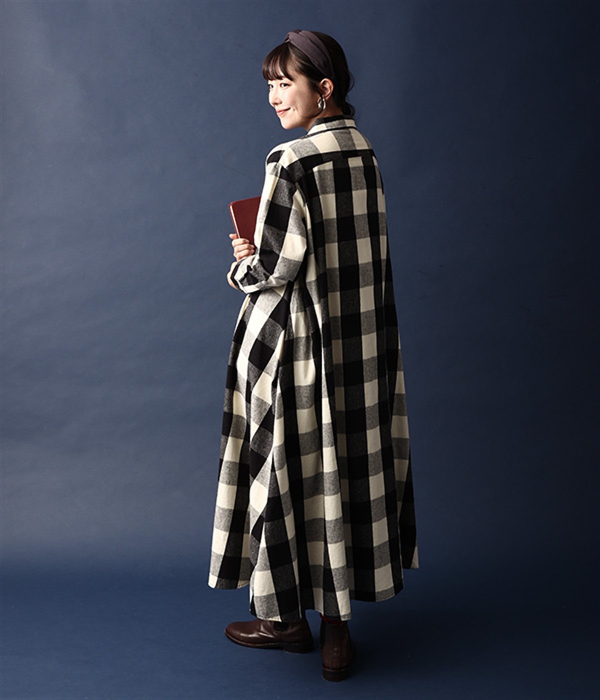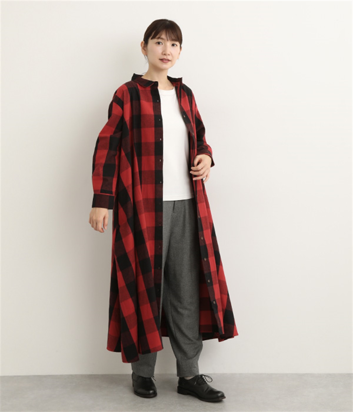 あたたかみのある優しい肌触りの綿ビエラ生地で仕立てたチェック柄シャツワンピース。生地をたっぷりと使用することで落ち感が出る、優雅なシルエットが魅力です。一枚ではもちろん、前ボタンをあけてパンツスタイルにコート感覚で合わせるのもおすすめ。大柄チェックの分量をおさえた重ね着をすると、また違った印象で着こなせます。