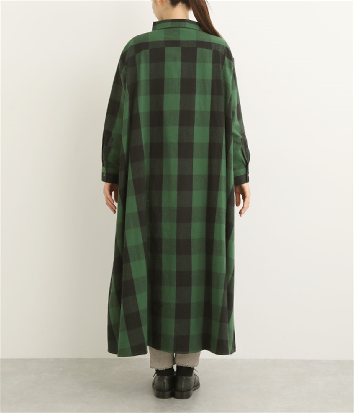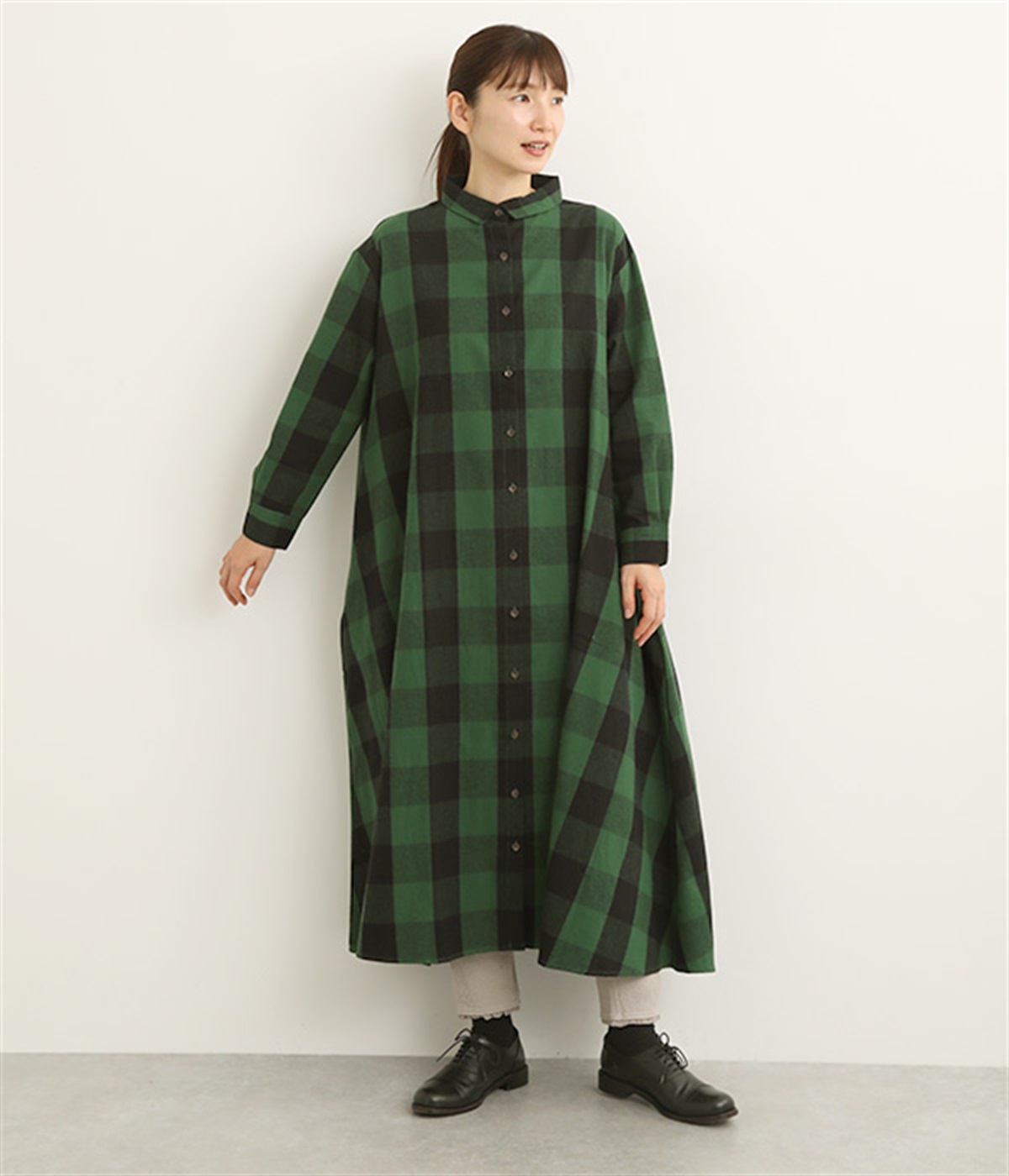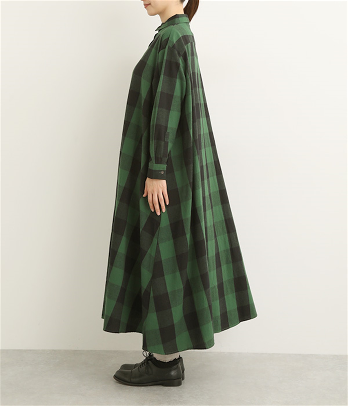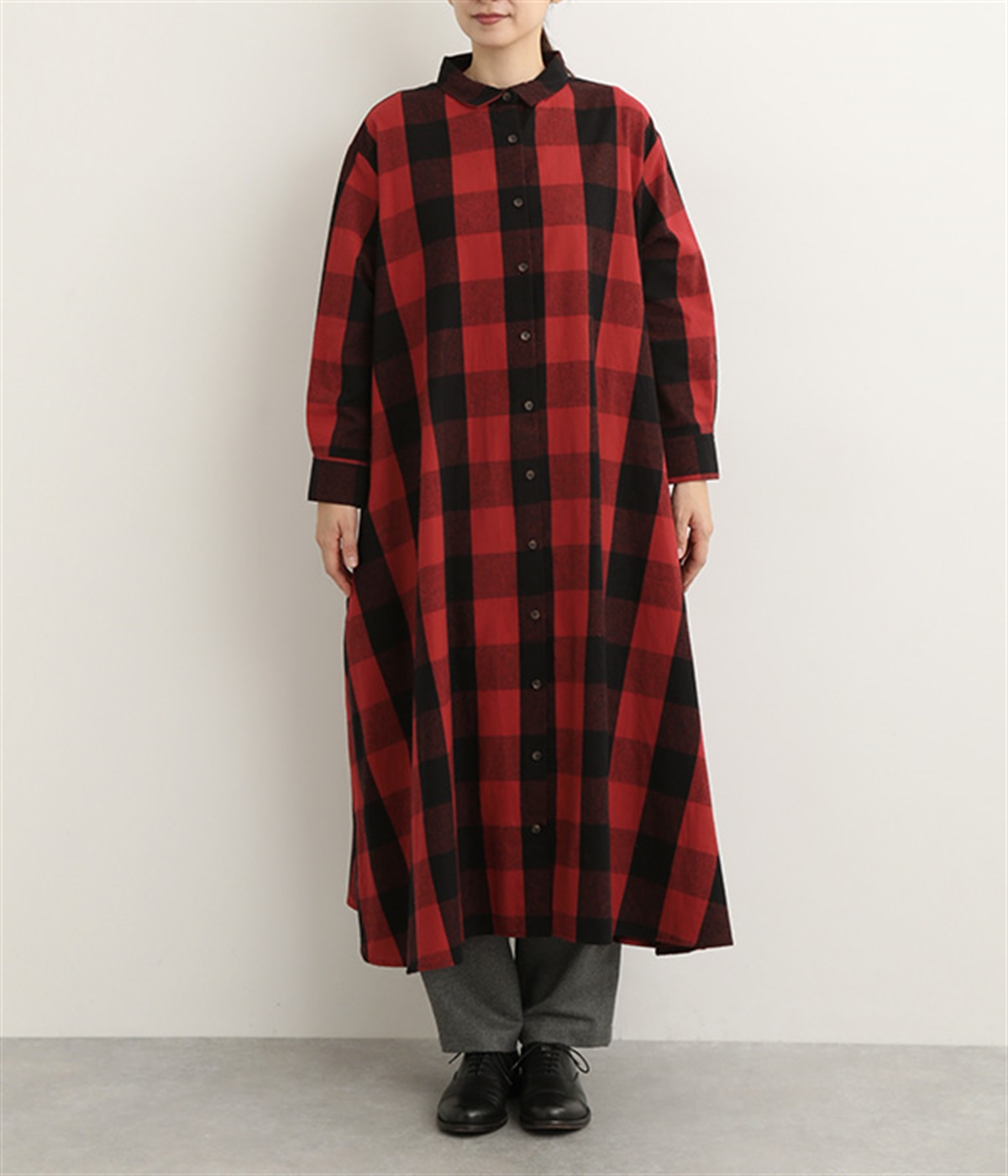 あたたかみのある優しい肌触りの綿ビエラ生地で仕立てたチェック柄シャツワンピース。生地をたっぷりと使用することで落ち感が出る、優雅なシルエットが魅力です。一枚ではもちろん、前ボタンをあけてパンツスタイルにコート感覚で合わせるのもおすすめ。大柄チェックの分量をおさえた重ね着をすると、また違った印象で着こなせます。