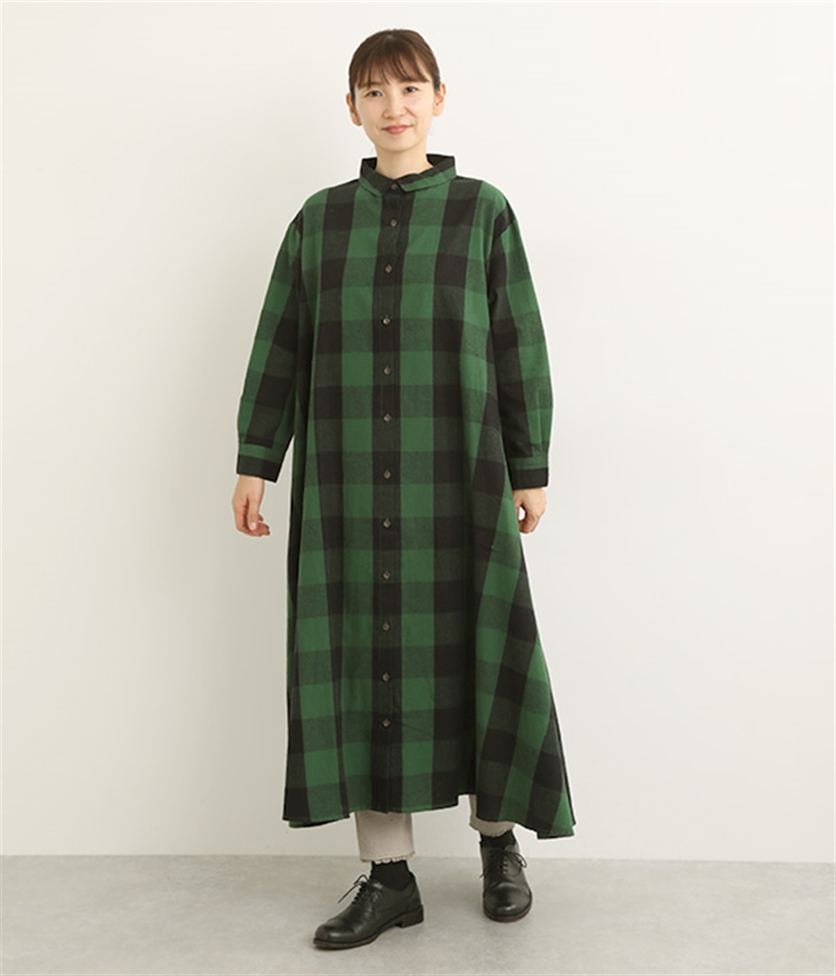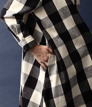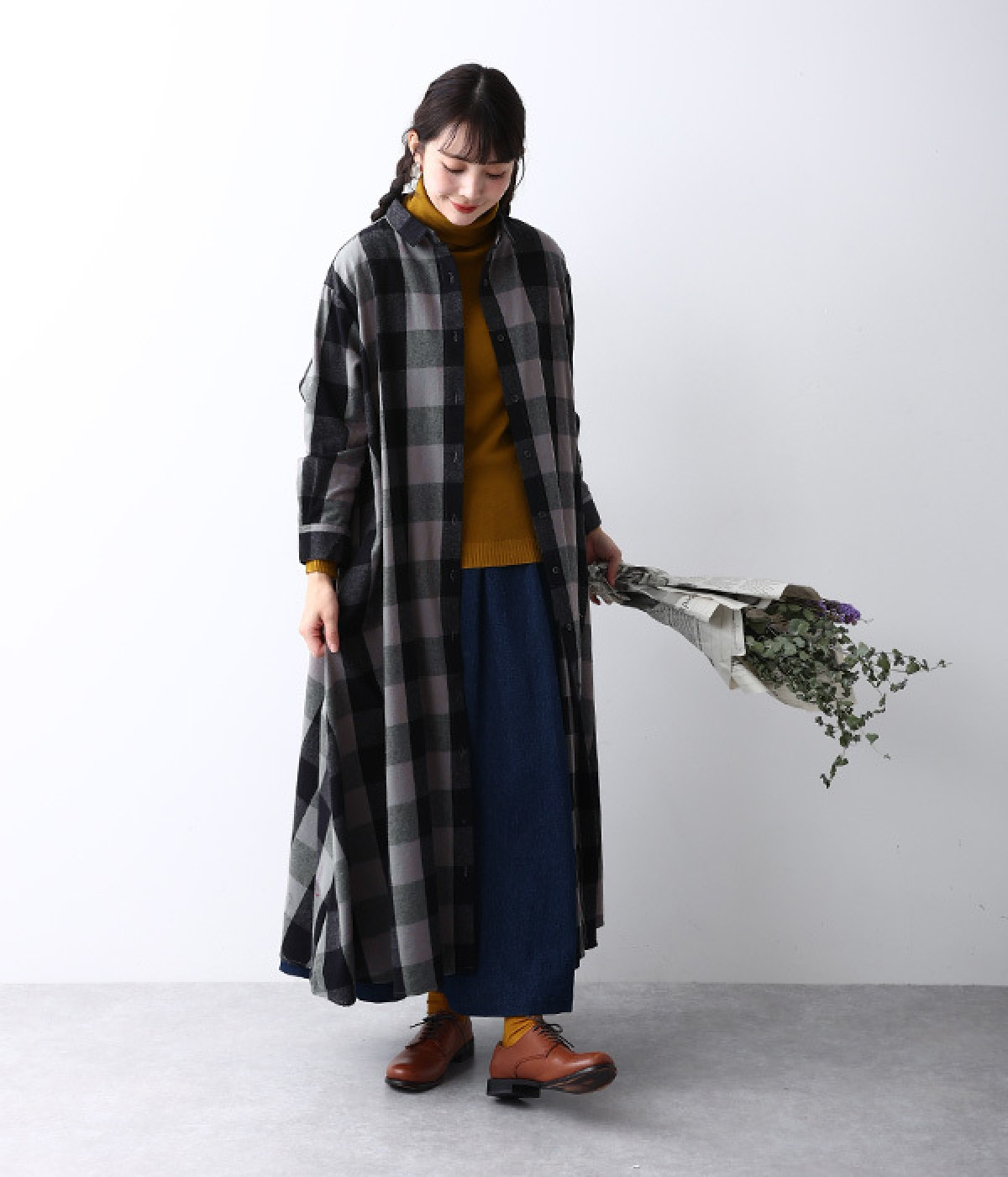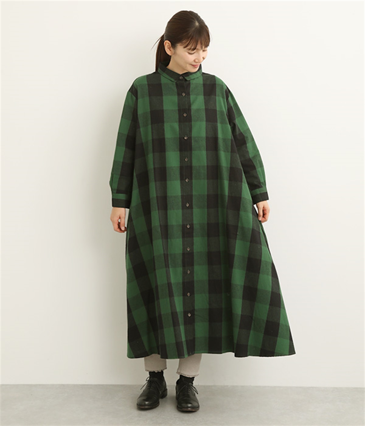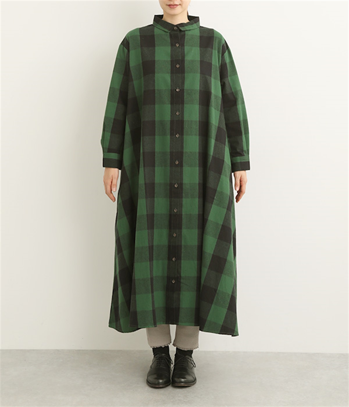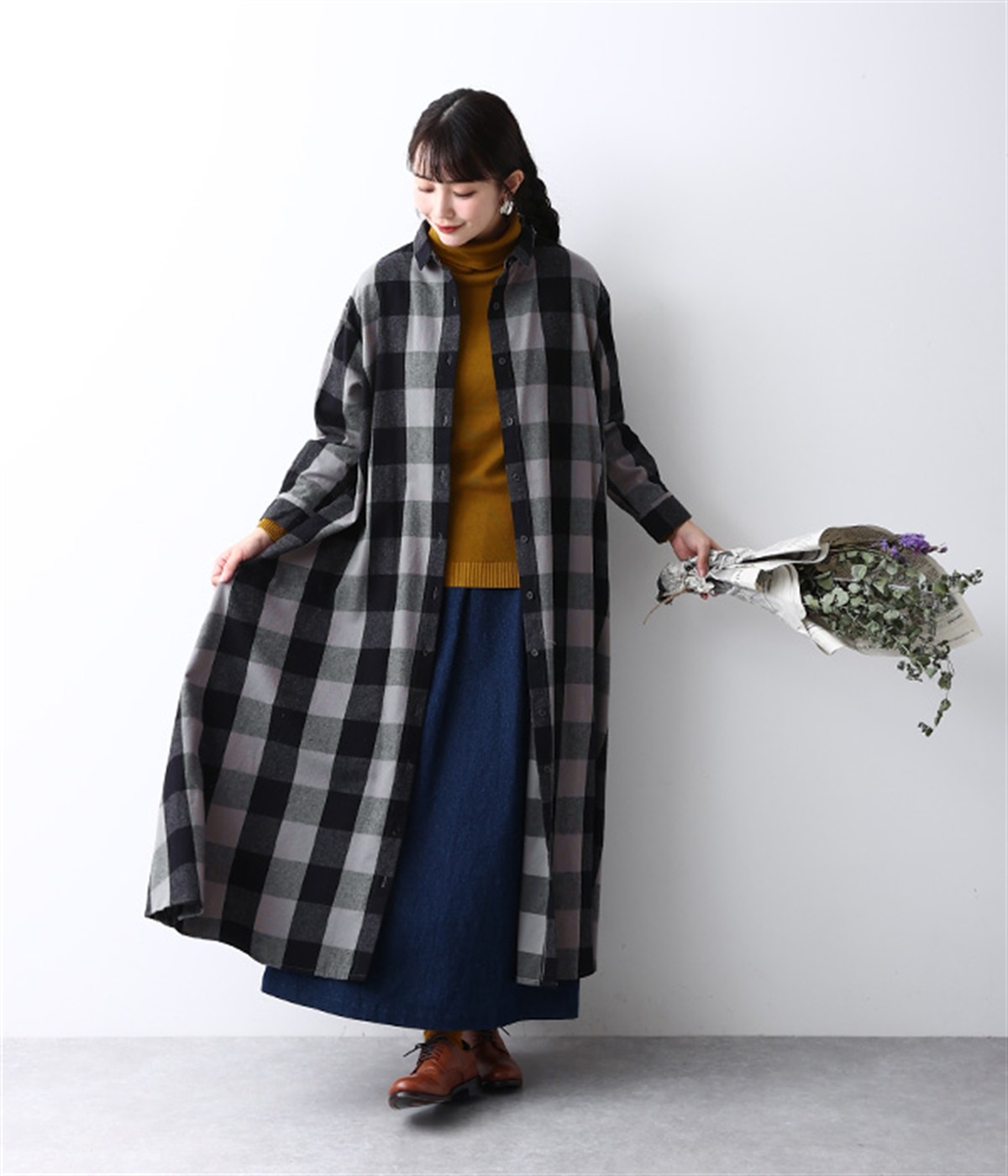 あたたかみのある優しい肌触りの綿ビエラ生地で仕立てたチェック柄シャツワンピース。生地をたっぷりと使用することで落ち感が出る、優雅なシルエットが魅力です。一枚ではもちろん、前ボタンをあけてパンツスタイルにコート感覚で合わせるのもおすすめ。大柄チェックの分量をおさえた重ね着をすると、また違った印象で着こなせます。