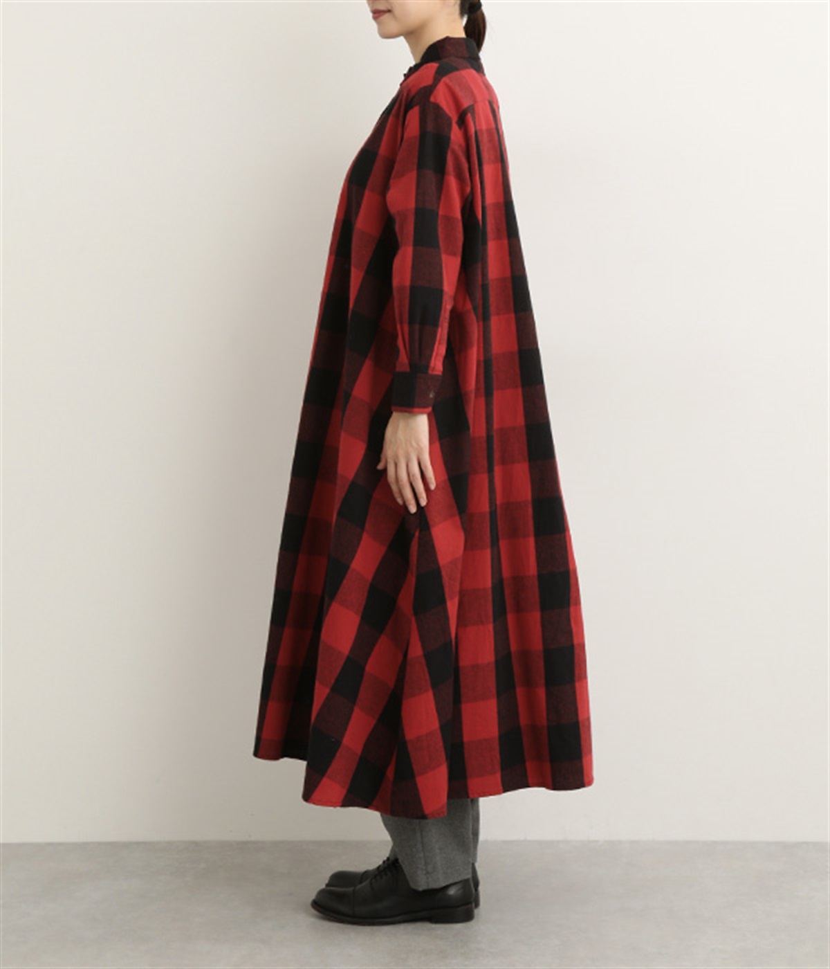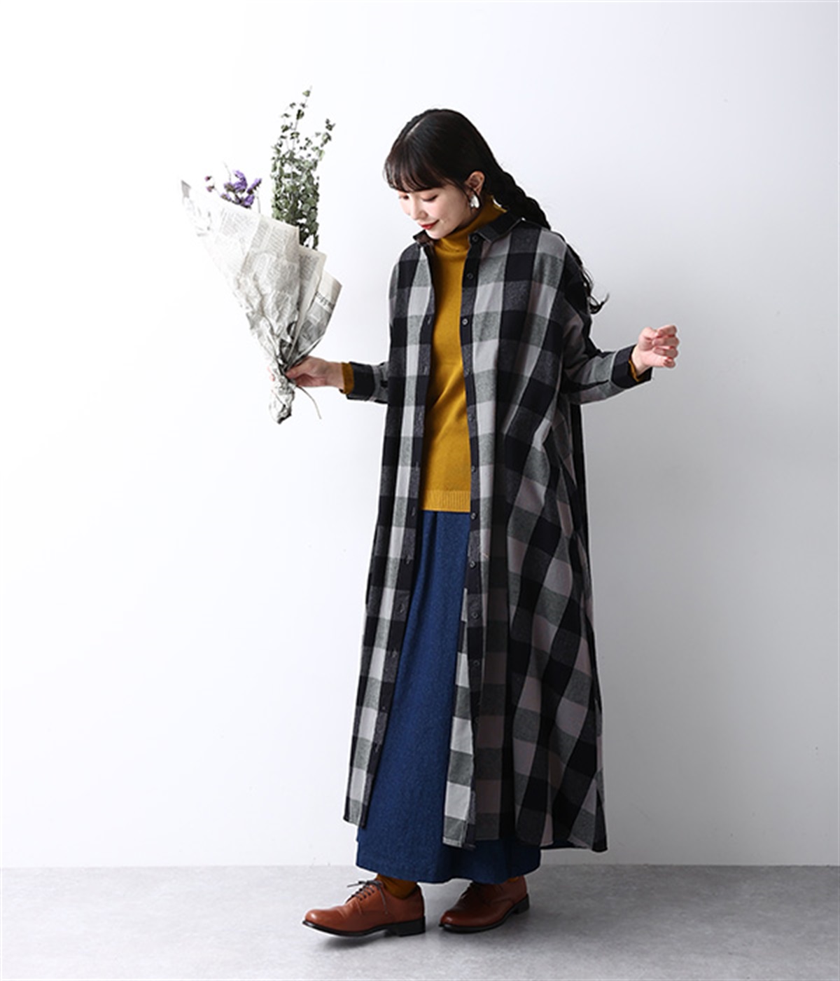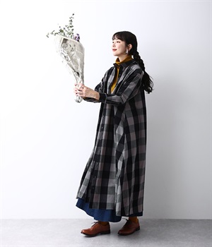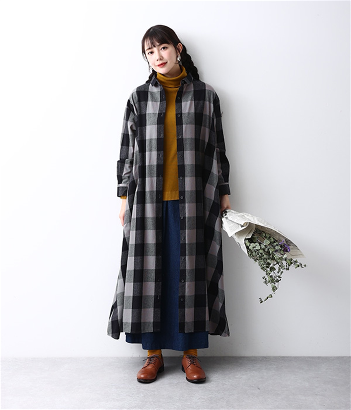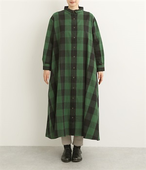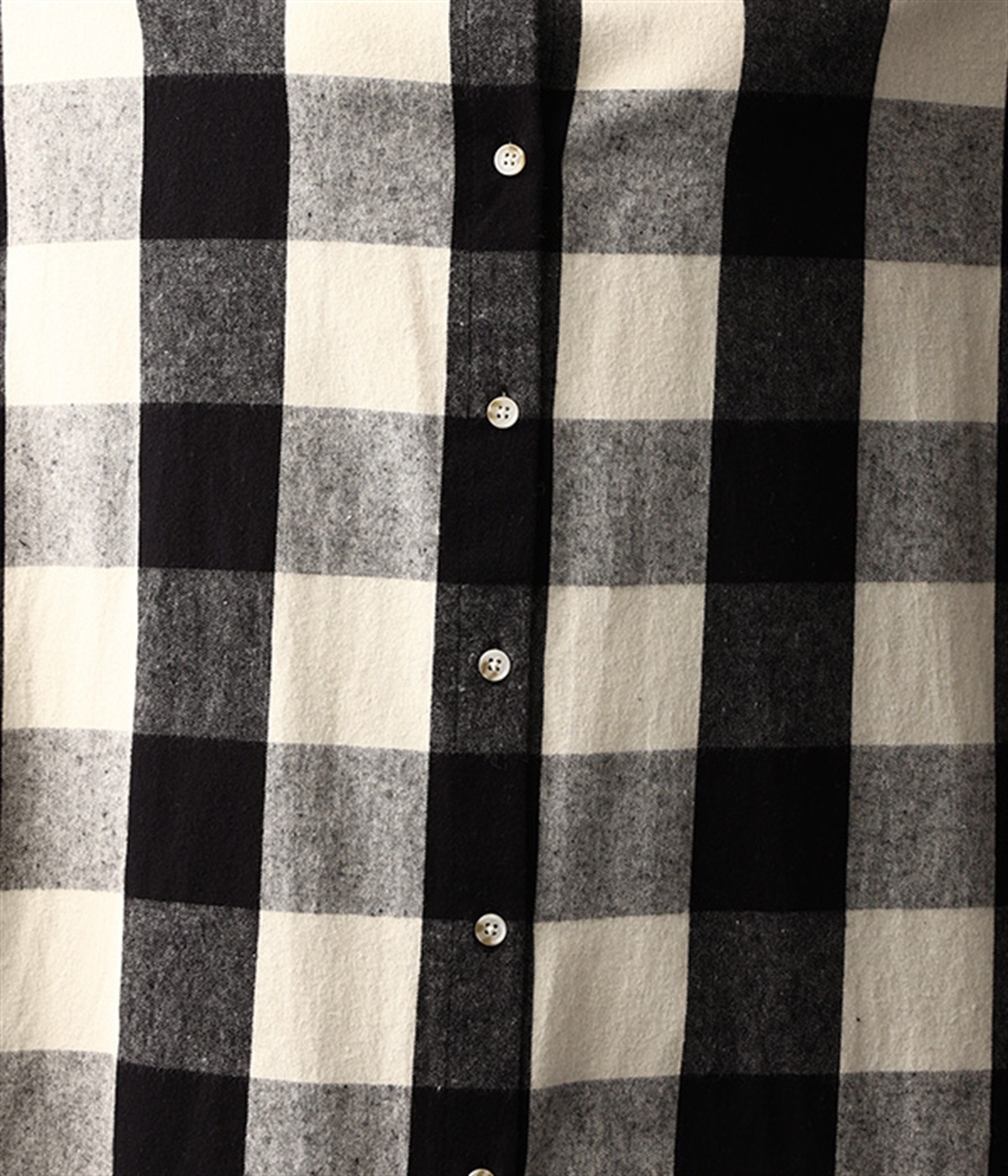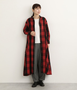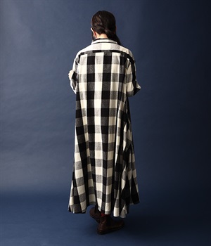 あたたかみのある優しい肌触りの綿ビエラ生地で仕立てたチェック柄シャツワンピース。生地をたっぷりと使用することで落ち感が出る、優雅なシルエットが魅力です。一枚ではもちろん、前ボタンをあけてパンツスタイルにコート感覚で合わせるのもおすすめ。大柄チェックの分量をおさえた重ね着をすると、また違った印象で着こなせます。