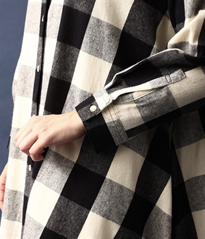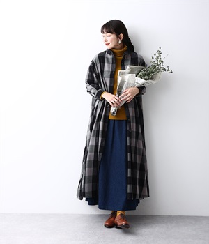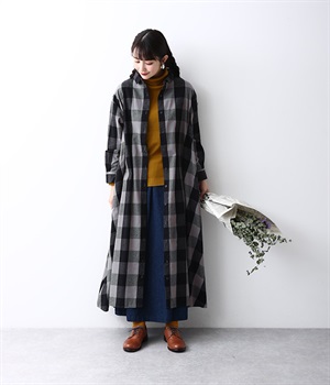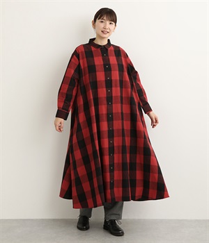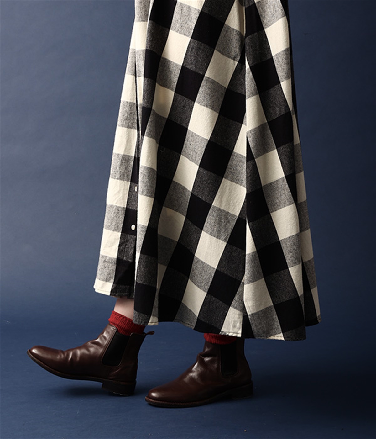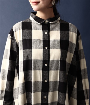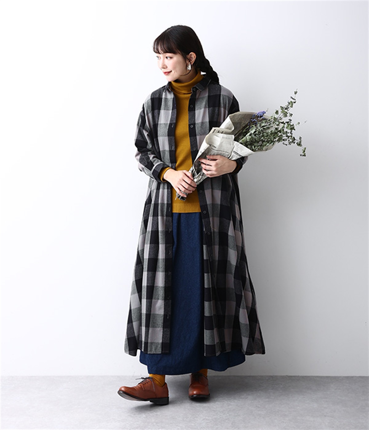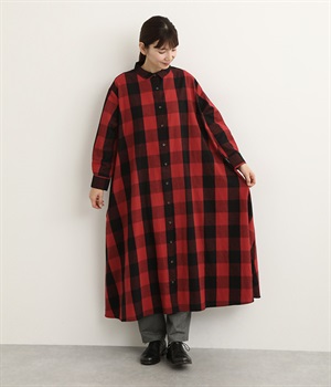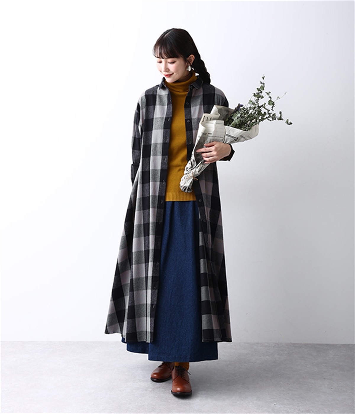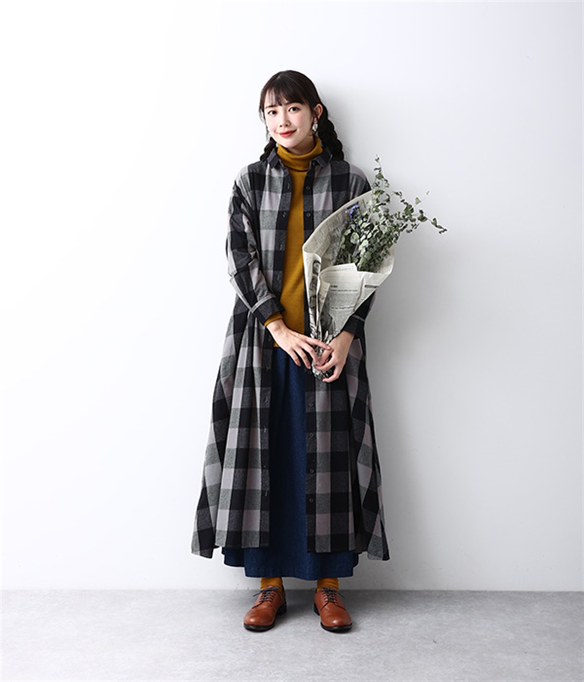 あたたかみのある優しい肌触りの綿ビエラ生地で仕立てたチェック柄シャツワンピース。生地をたっぷりと使用することで落ち感が出る、優雅なシルエットが魅力です。一枚ではもちろん、前ボタンをあけてパンツスタイルにコート感覚で合わせるのもおすすめ。大柄チェックの分量をおさえた重ね着をすると、また違った印象で着こなせます。
