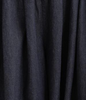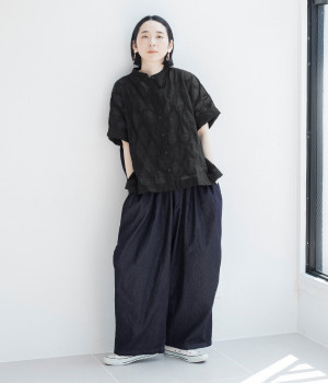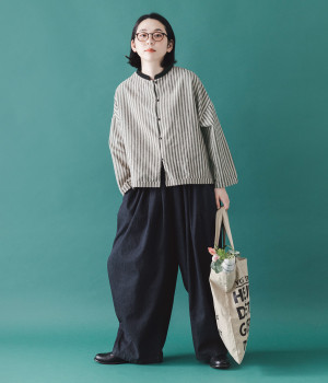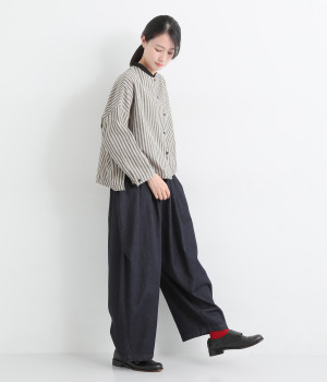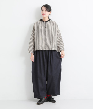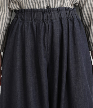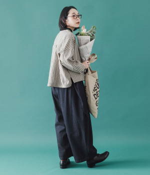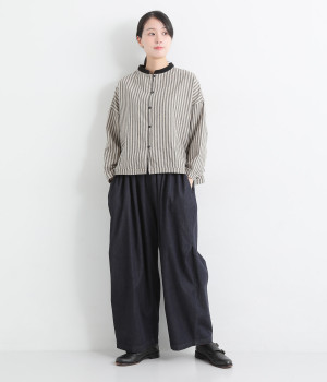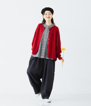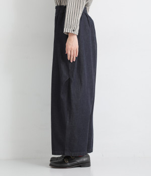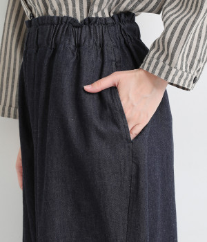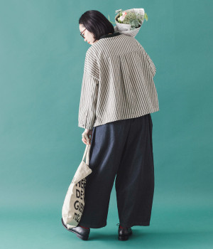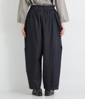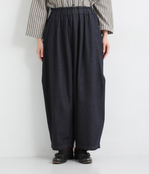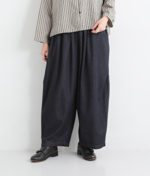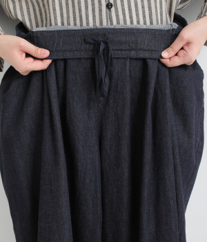 膝のタックやウエストギャザーを入れて作られた、立体感のあるボリューミーなコクーンシルエットがこだわり。裾はほどよく絞られているので、脚の運びも良好です。気持ちよくフィットする総ゴムウエストはコードで微調節OK。