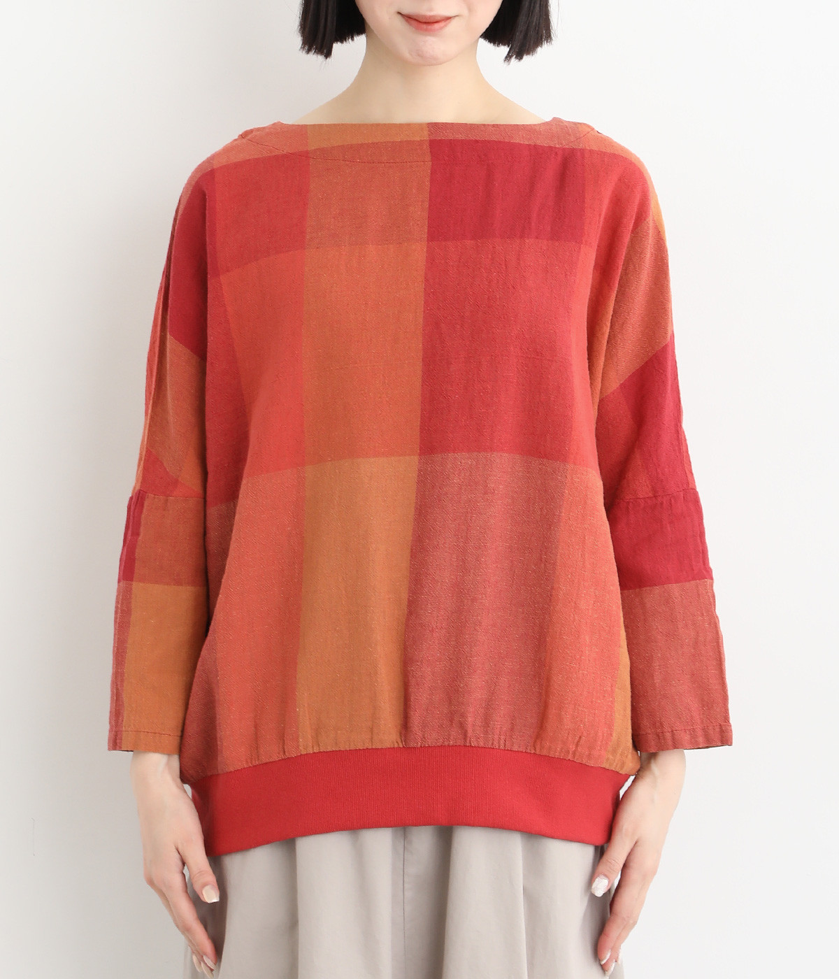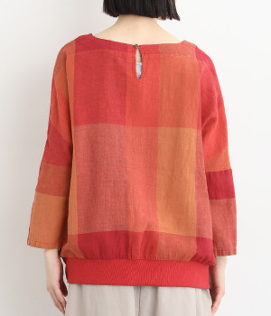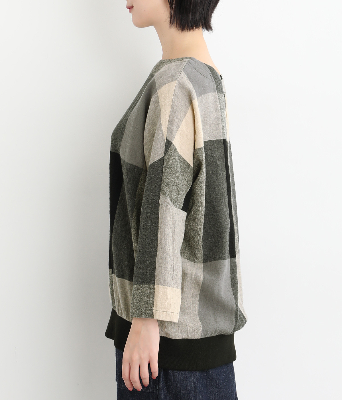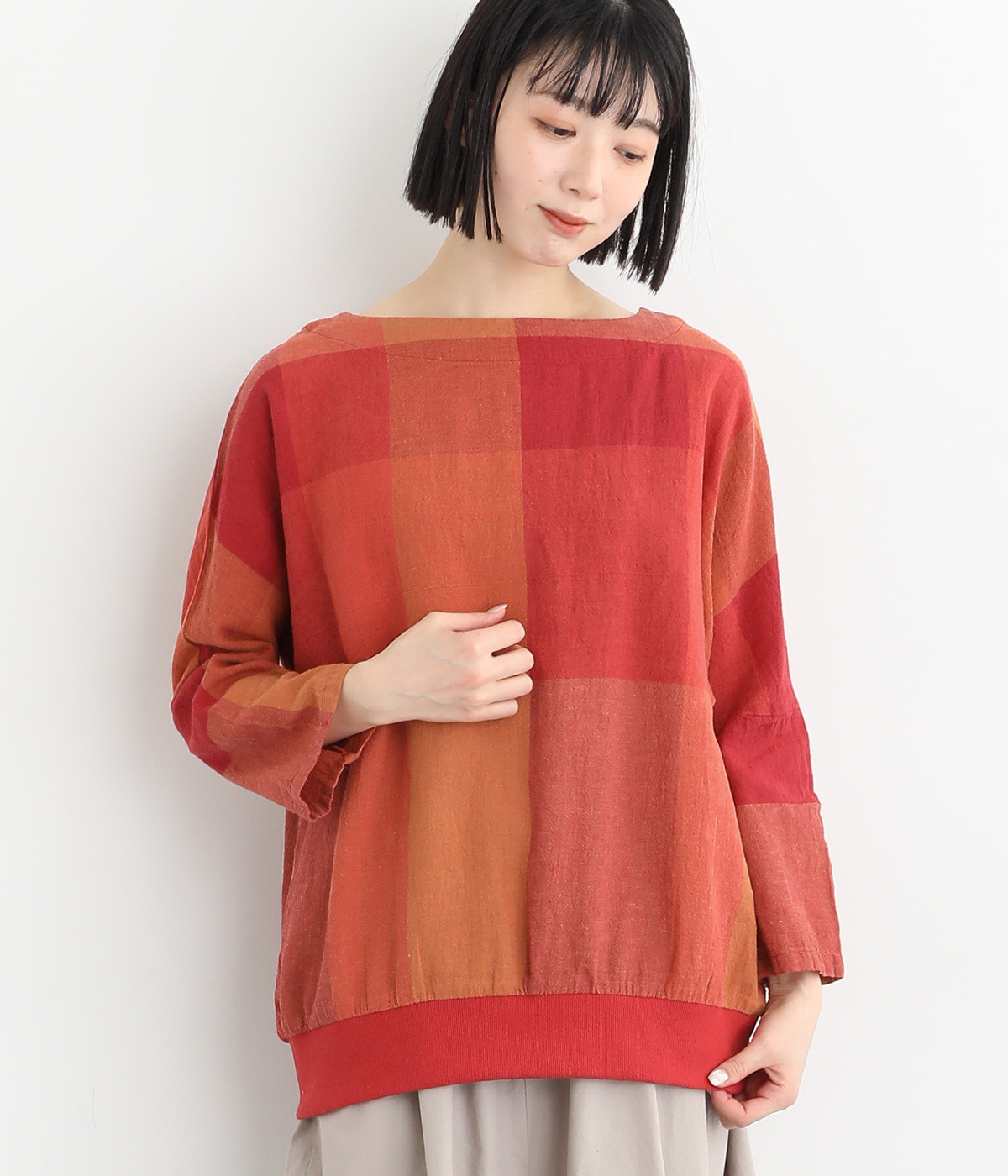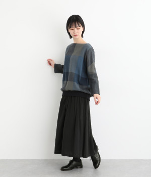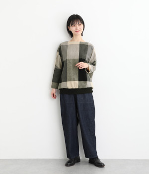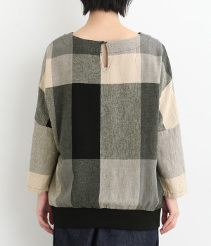 大胆なチェック柄をあしらった、コーディネートの主役を飾る一枚。ドルマン風のゆったりとしたシルエットで見た目も着心地もリラクシーなデザインです。裾がリブになっている分、軽くブラウジングしてこなれ感を出すのも◎。後ろネックはやや広めのティアドロップあきになっています。
