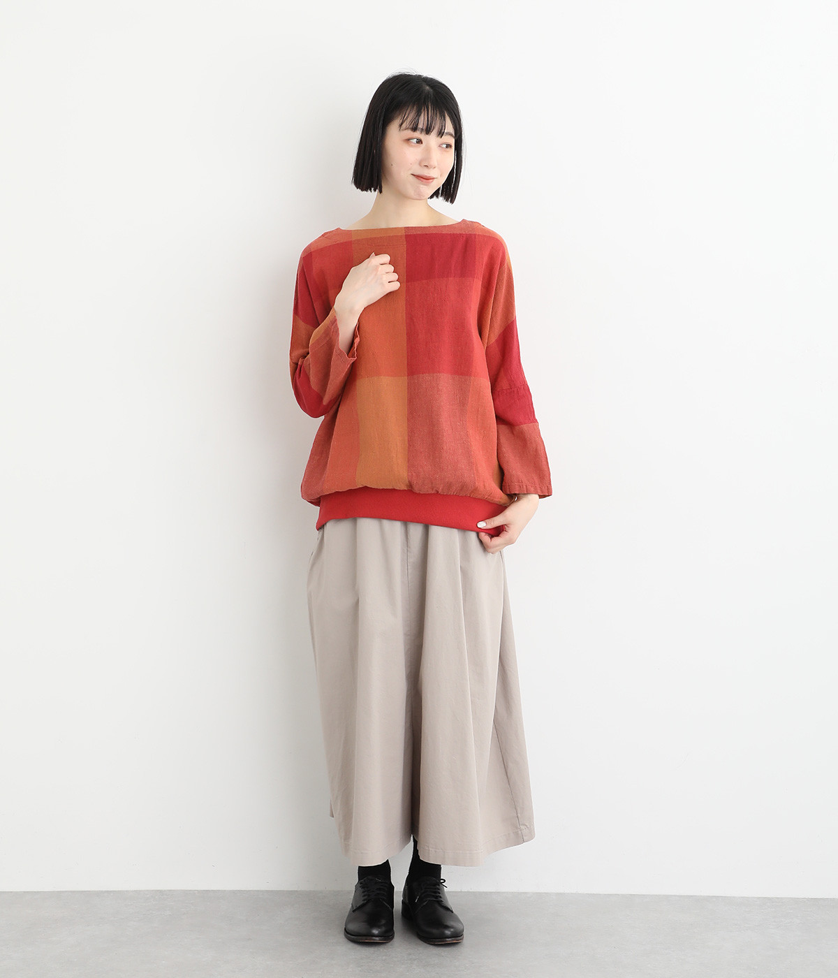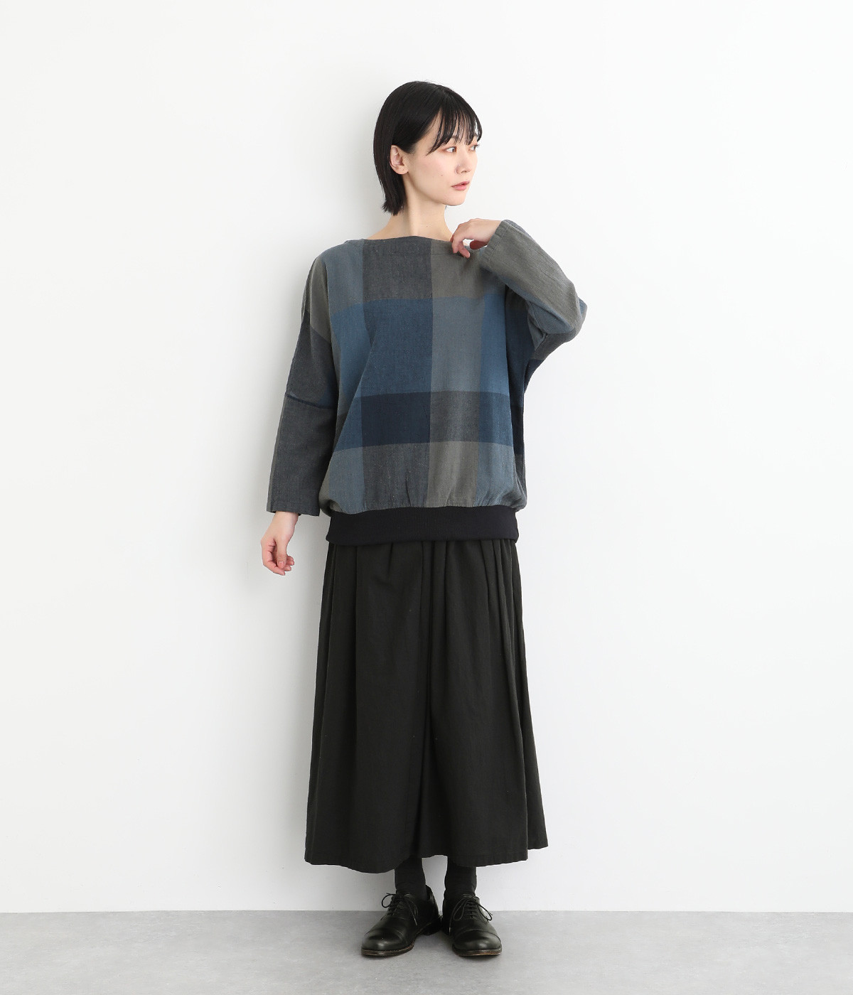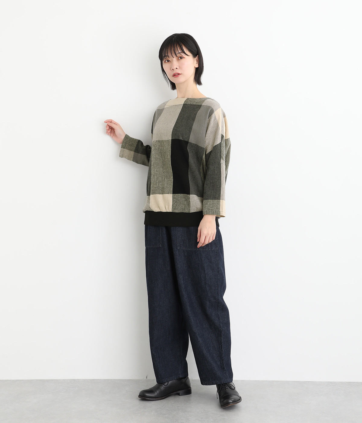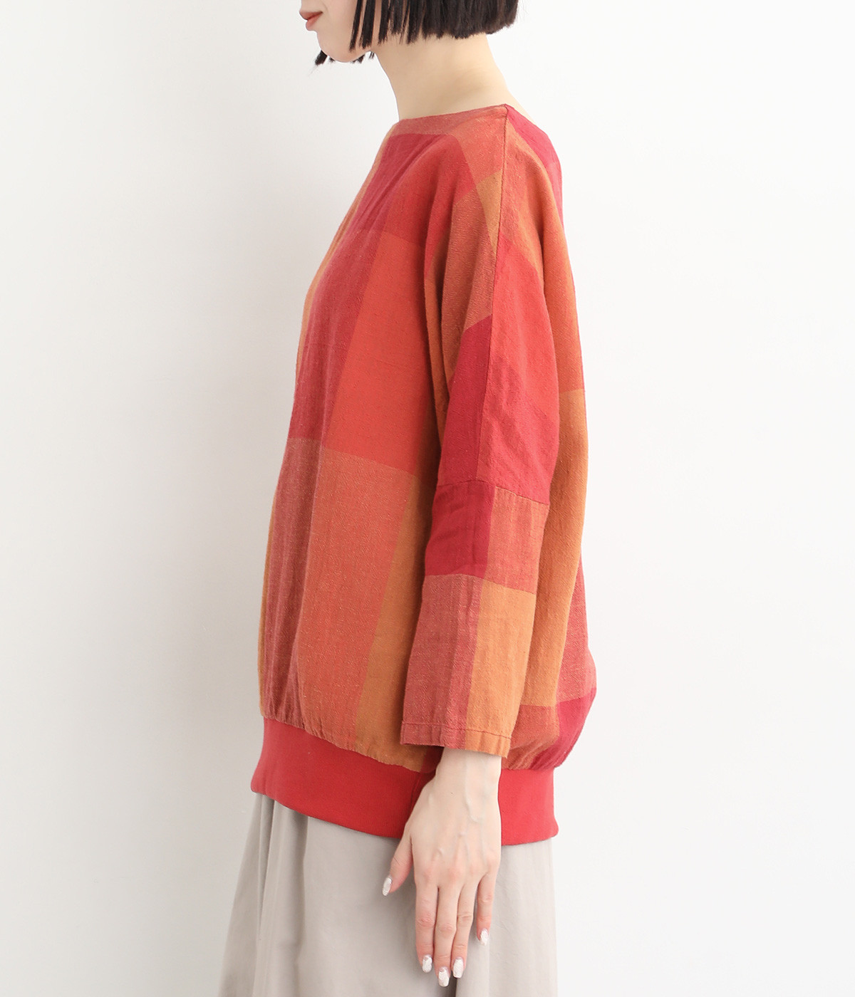 大胆なチェック柄をあしらった、コーディネートの主役を飾る一枚。ドルマン風のゆったりとしたシルエットで見た目も着心地もリラクシーなデザインです。裾がリブになっている分、軽くブラウジングしてこなれ感を出すのも◎。後ろネックはやや広めのティアドロップあきになっています。