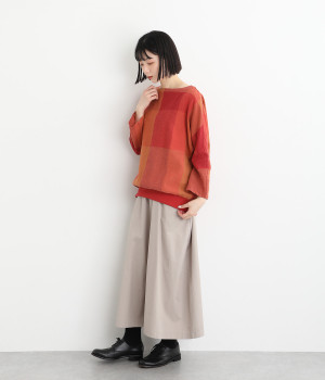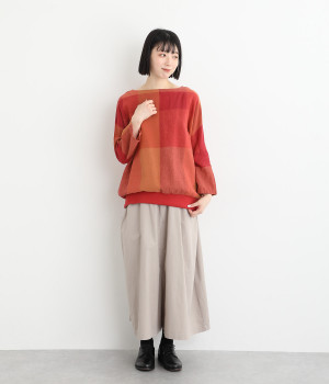 コットンリネンのブレンド素材を使った、さらりと軽いナチュラルな風合い。裾は伸縮性のあるリブに切り替えて、フィット感のある着心地に仕上げています。