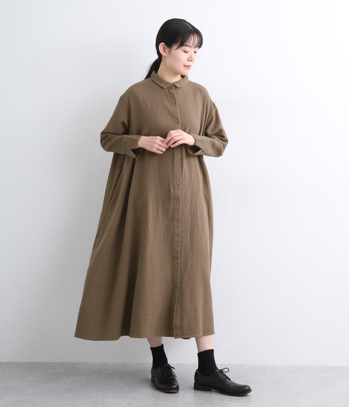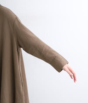 前開きボタンで羽織りとしても使えるロングシャツワンピースです。たっぷり生地をとったフレアシルエットに、小さめの襟がかわいらしさと上品さを添えてくれます。手元にニュアンスを生む袖口のカッティングデザインも魅力的。