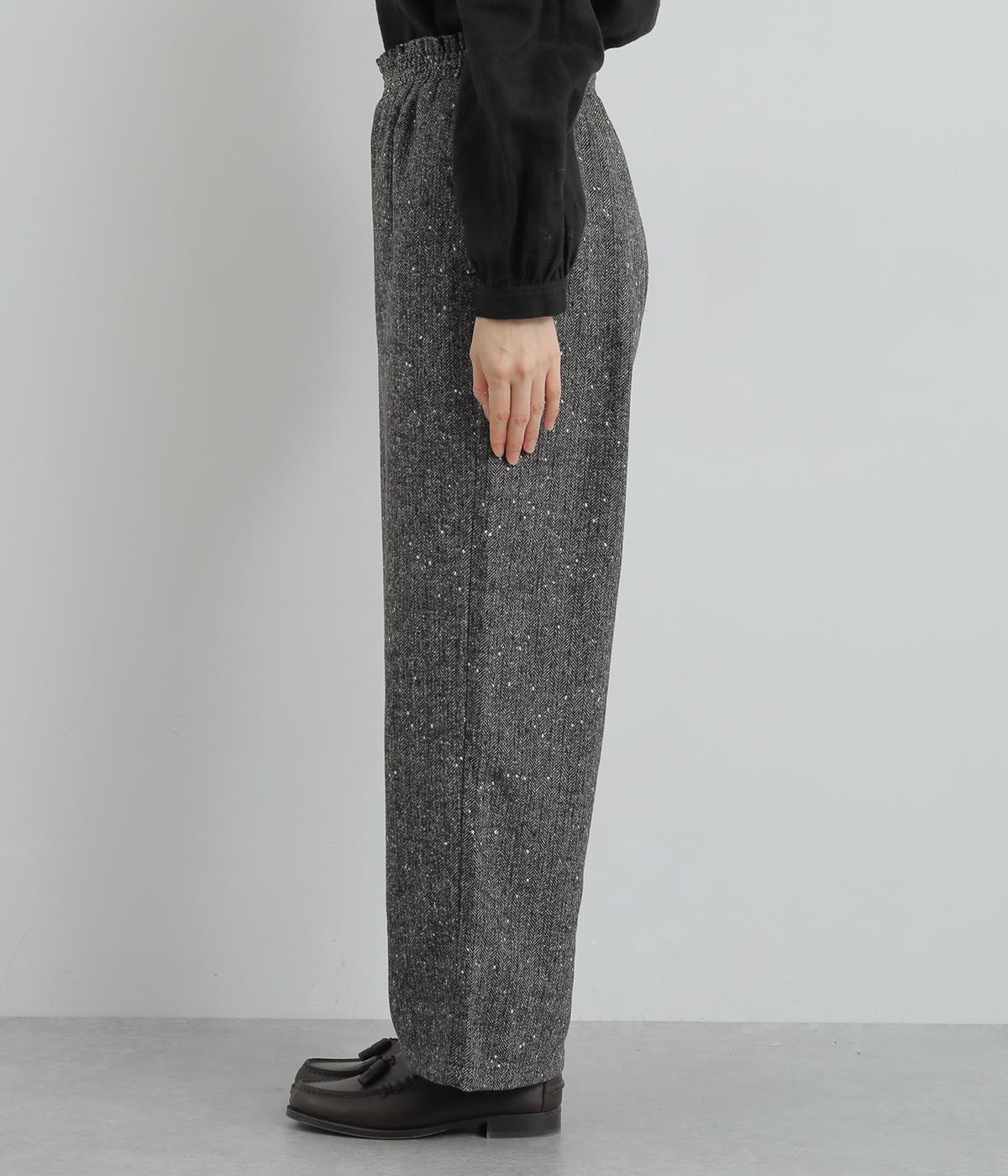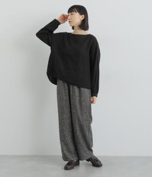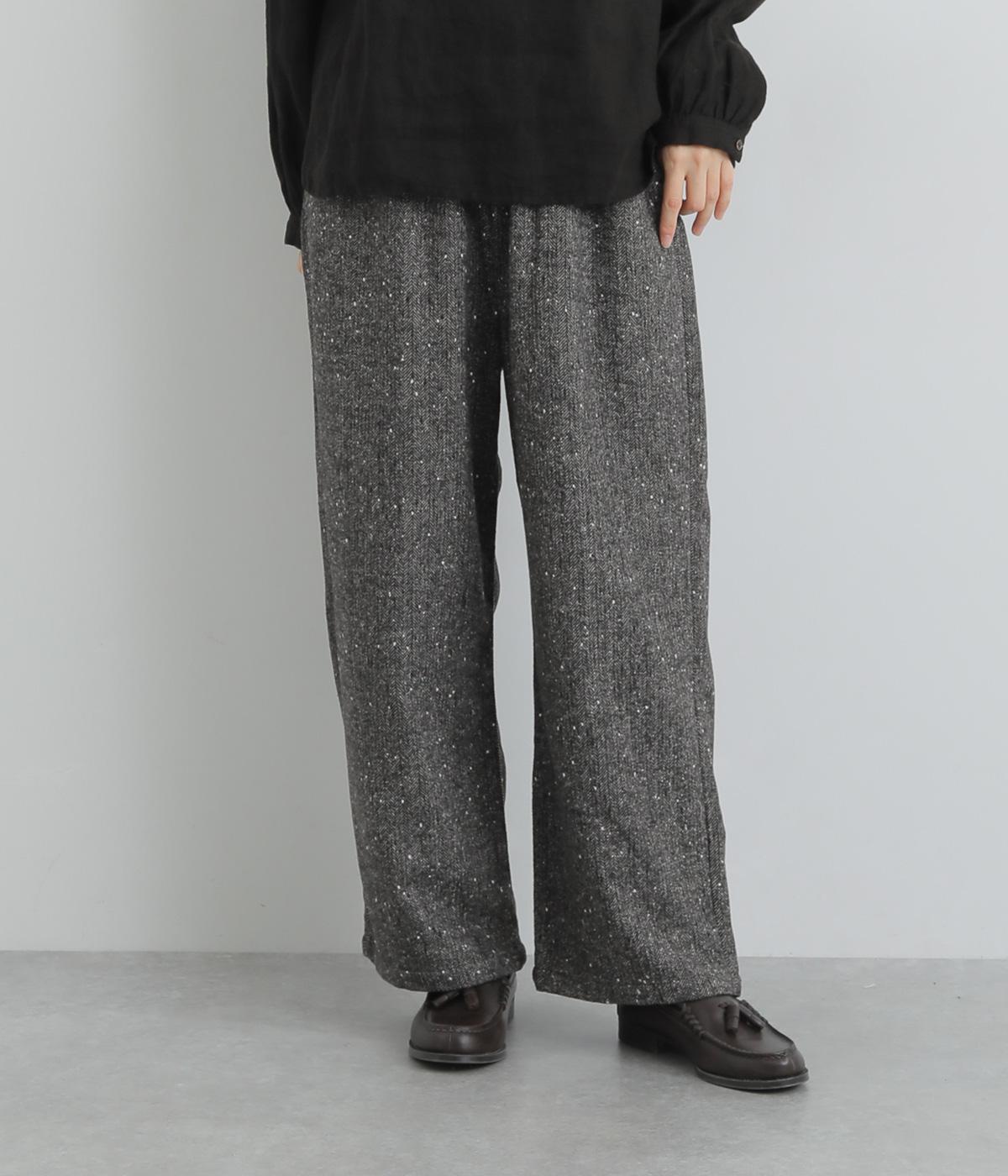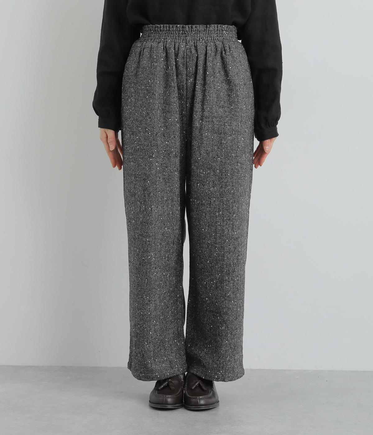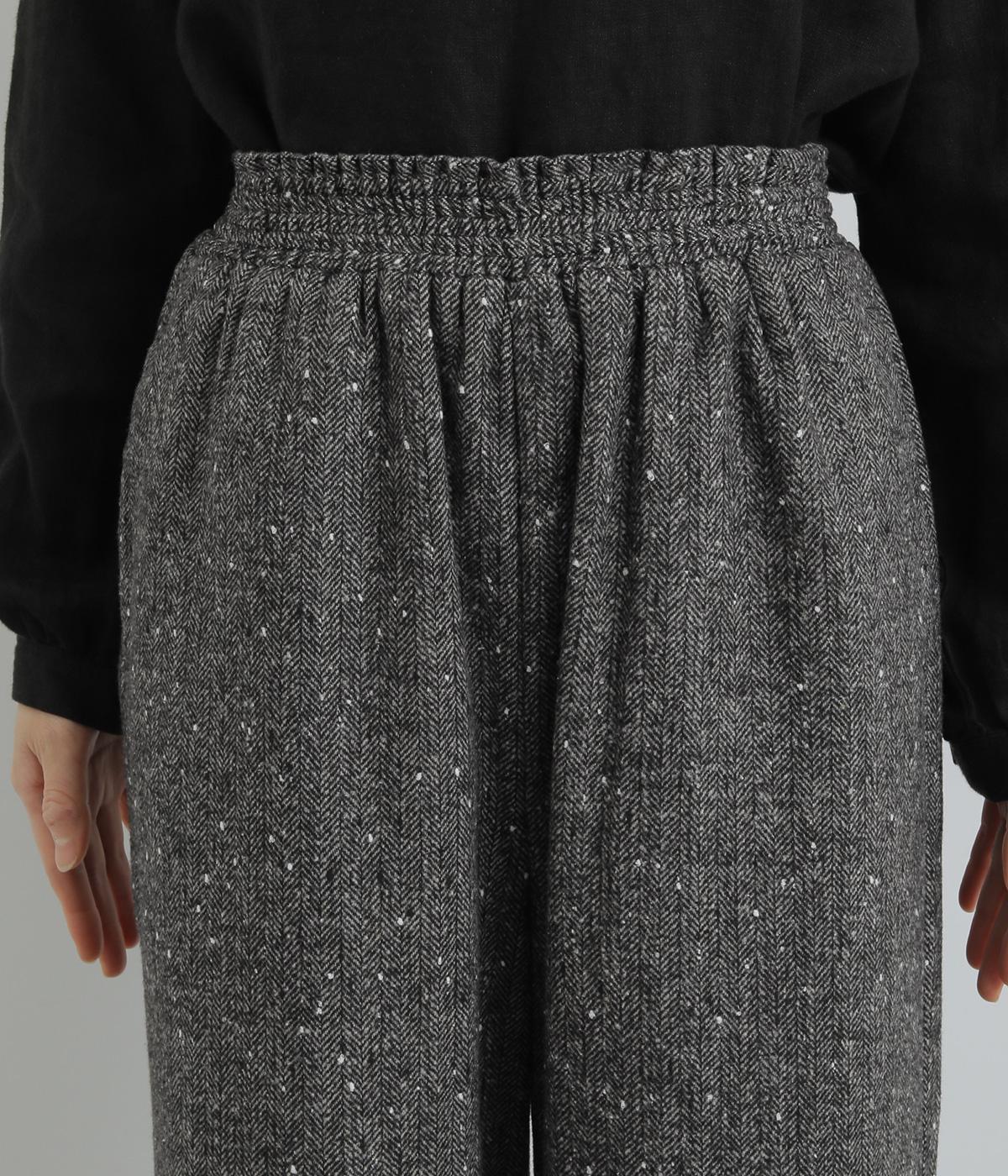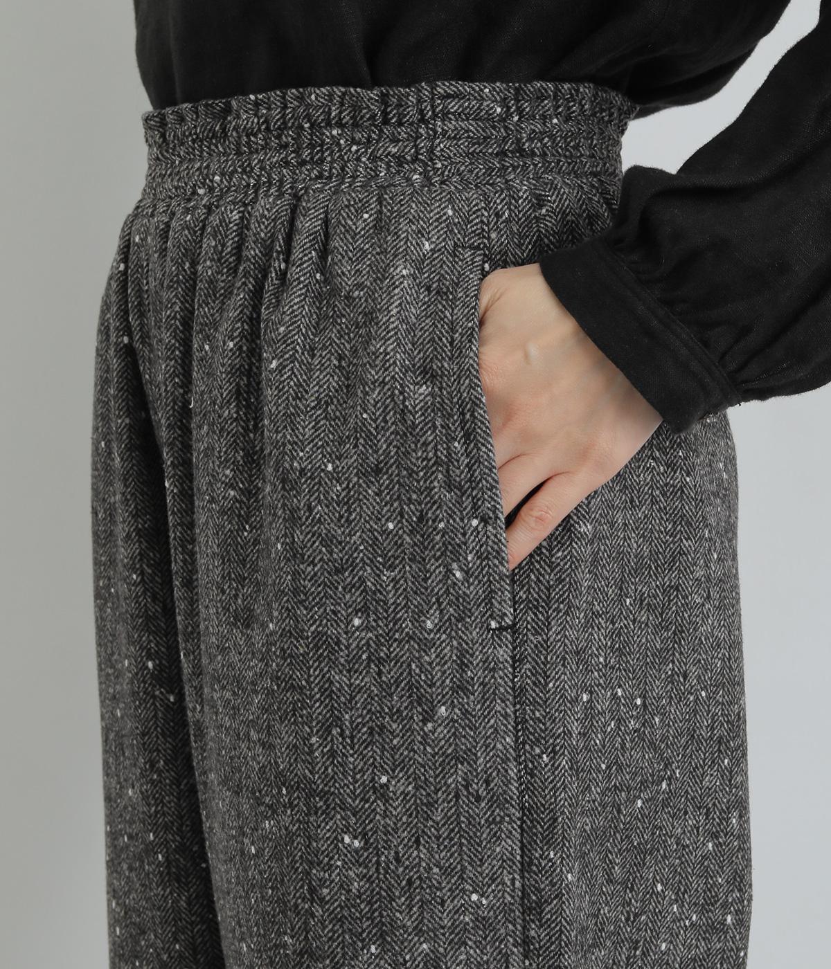 深めの股上とゆとりのあるシルエットがリラックスしたはき心地を叶えるトラウザーパンツ。ヘリンボーン生地がラフな印象を軽減し、装いに奥行きをプラスしてくれます。細幅のゴムを数本通したウエストがお腹まわりに心地よくフィット。両サイドとヒップには便利なポケットつきです。